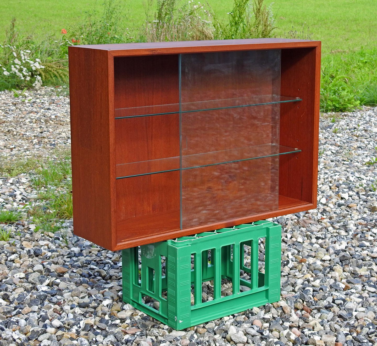 Hængevitrine i teaktræ med glashylder og to skydelåger i klart glas