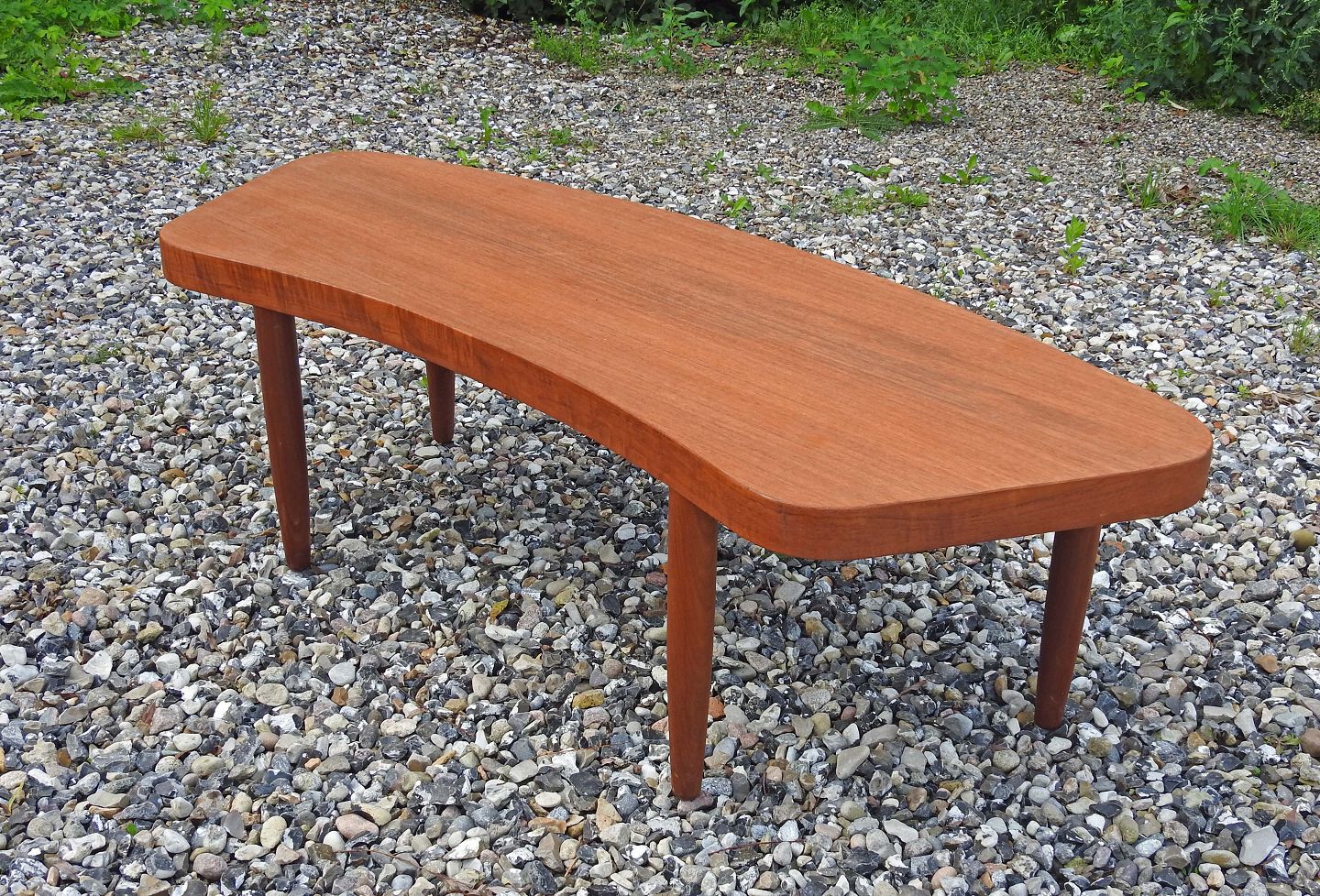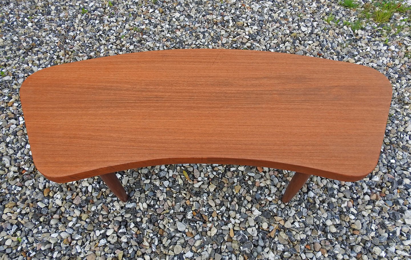 Sofabord i teaktræ med buet form og runde ben i dansk møbeldesign