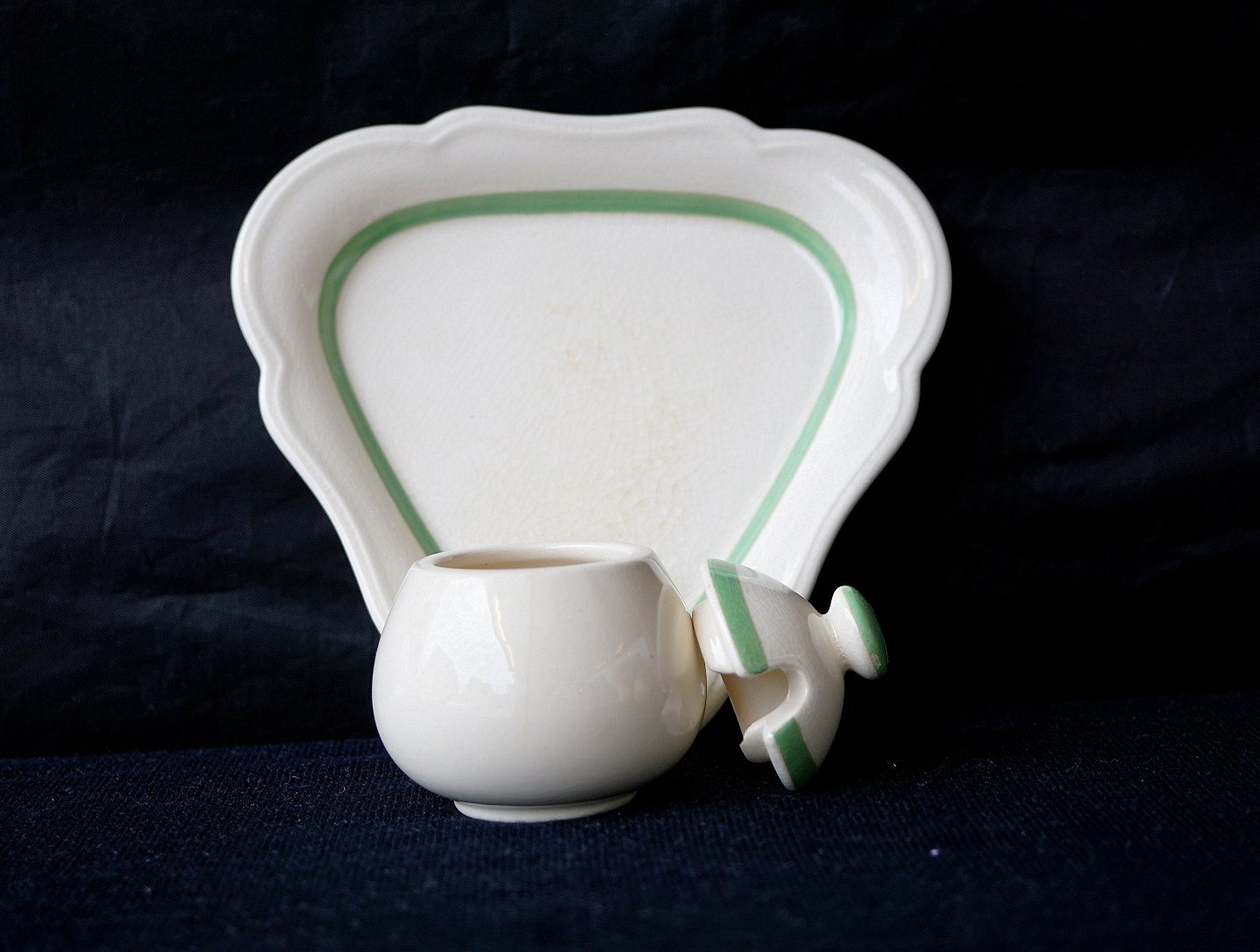 Aluminia Lise. 3-kantet plat de menage. Bundfarven råhvid med bred grøn stribe.
