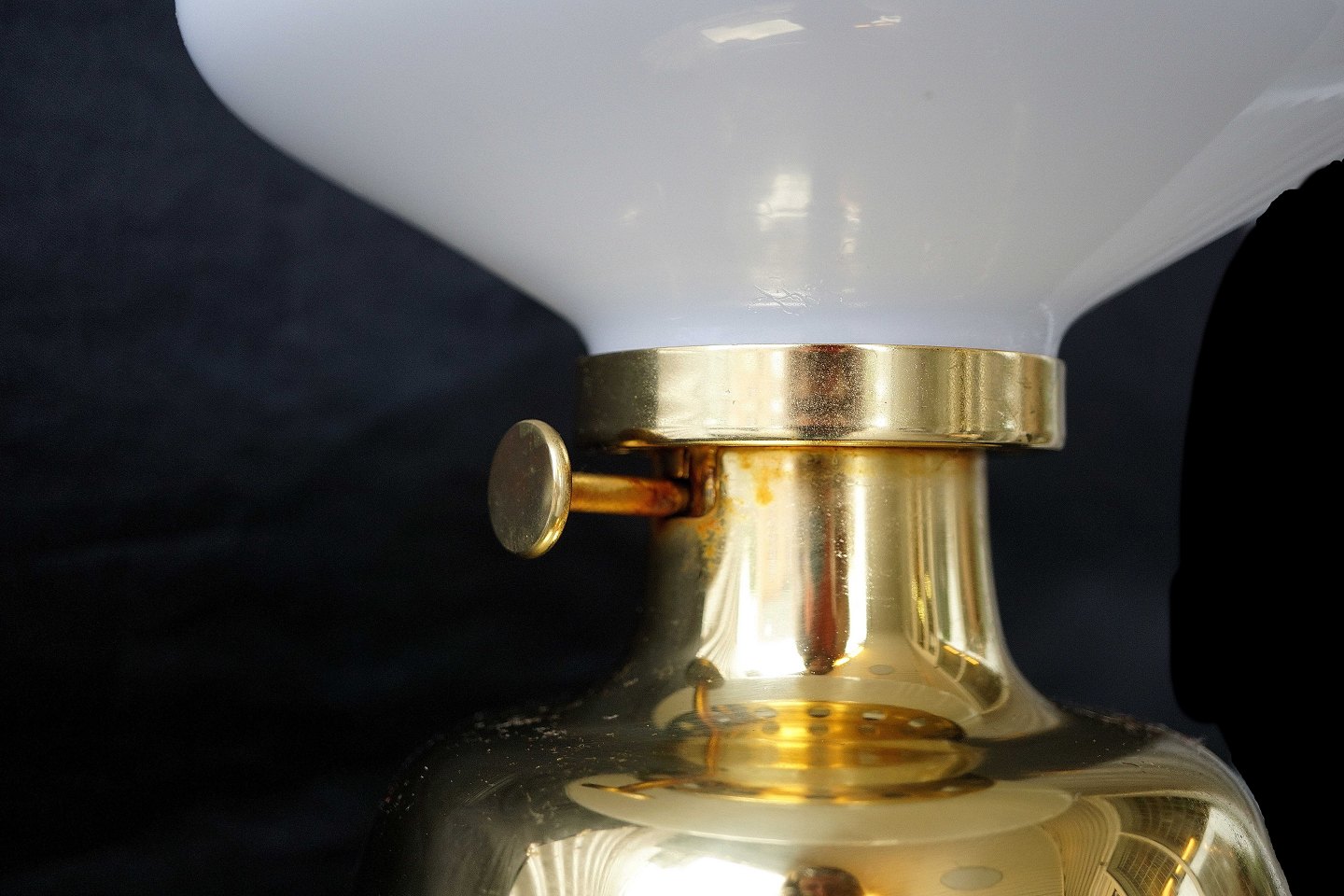 Petronella olielampe med messingfod, der er regulerings knap , der fungerer. Skærmen er af glas