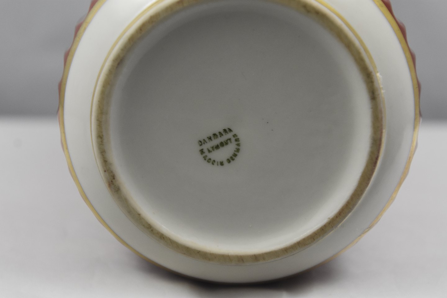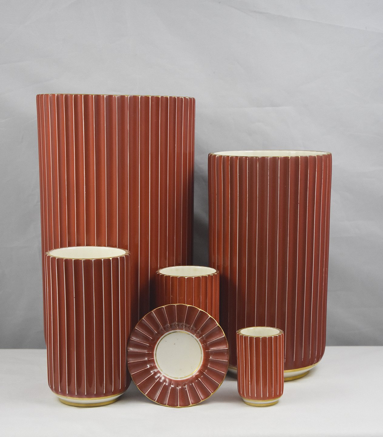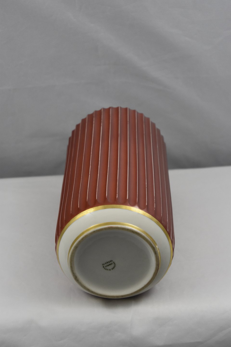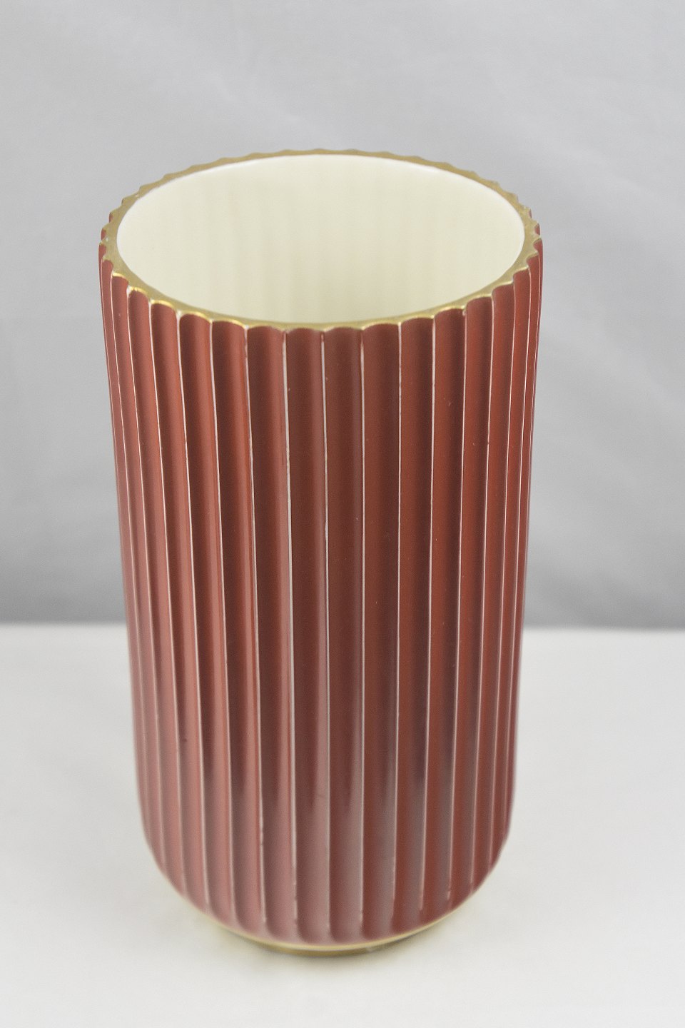 Rød Lyngby vase i porcelæn med riflet korpus og guldkant