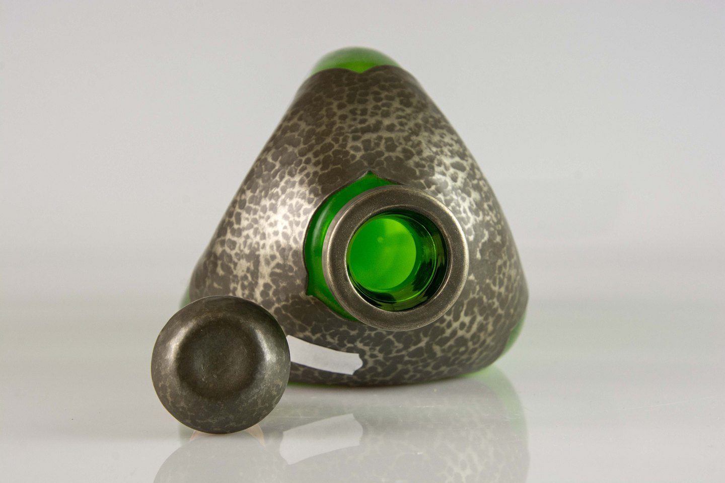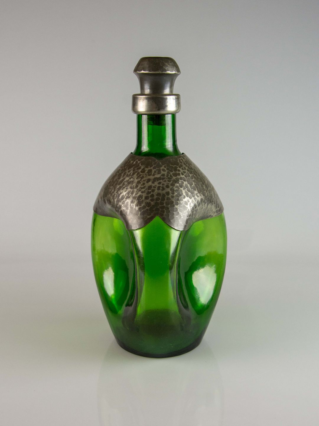 Karaffel i grønt glas med tinbelægning og korkprop beklædt med tin i dansk design
