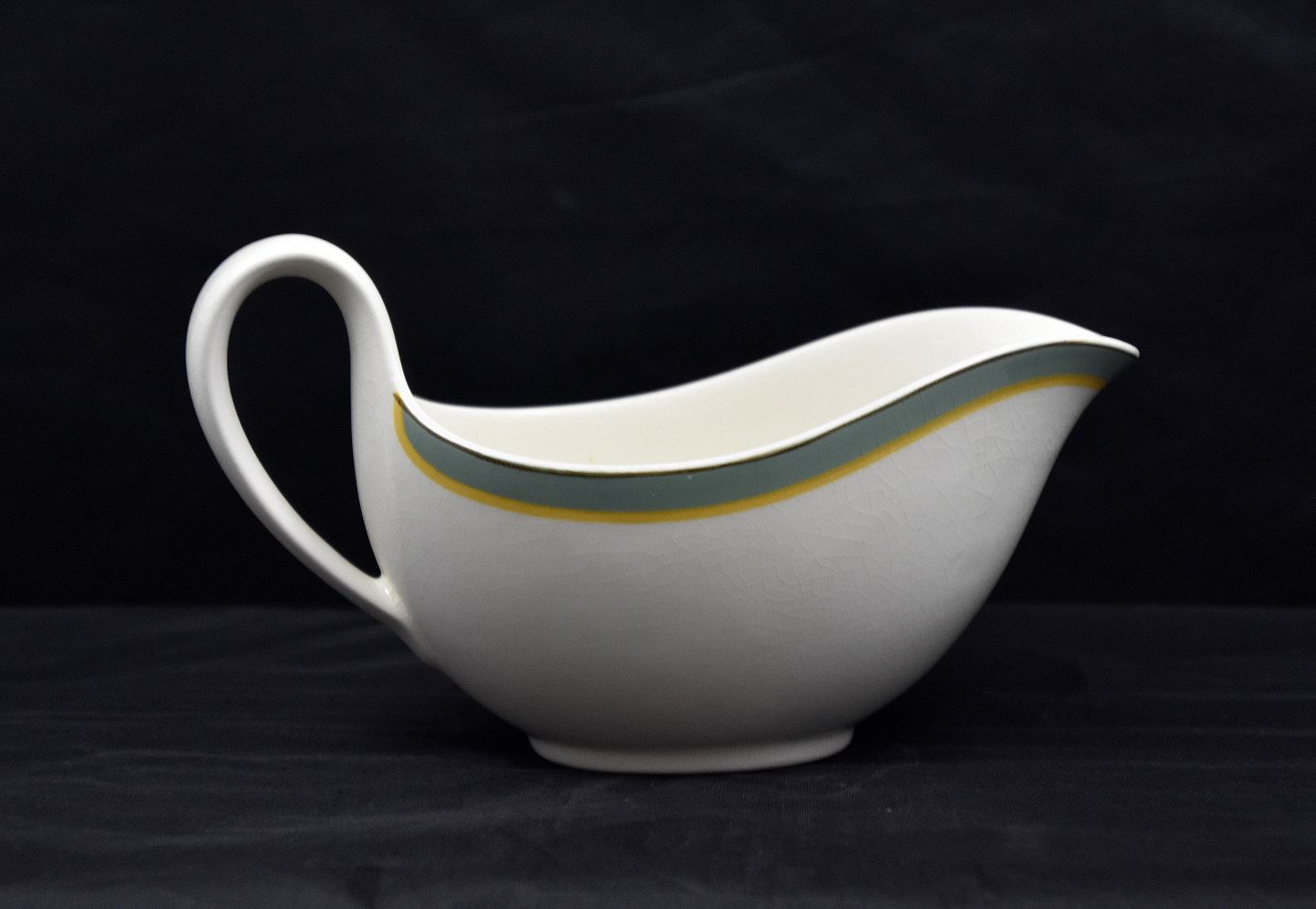 Valdemar sovsekande i kunstfajance. Grundfarve lys creme, kant tynd sort stribe, bred grøn stribe, tynd gul stribe