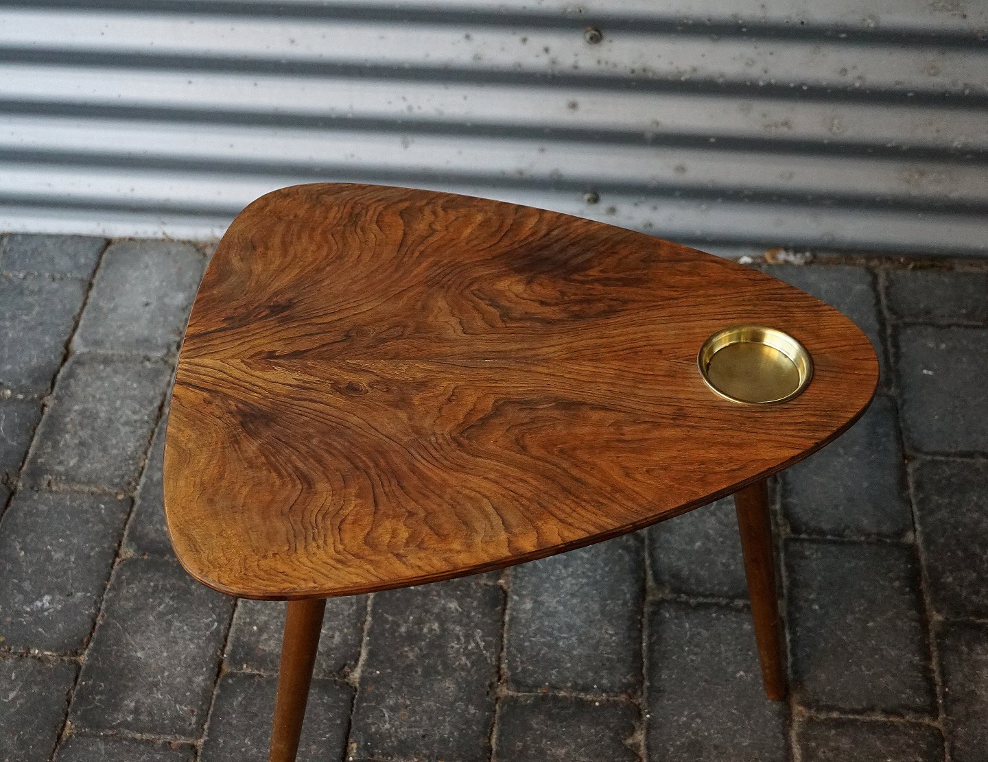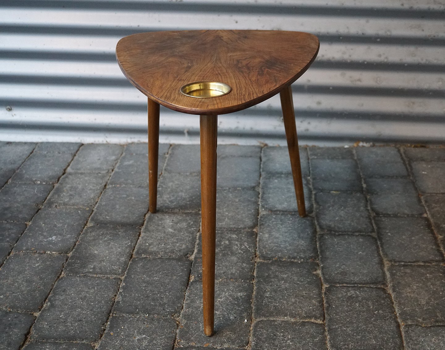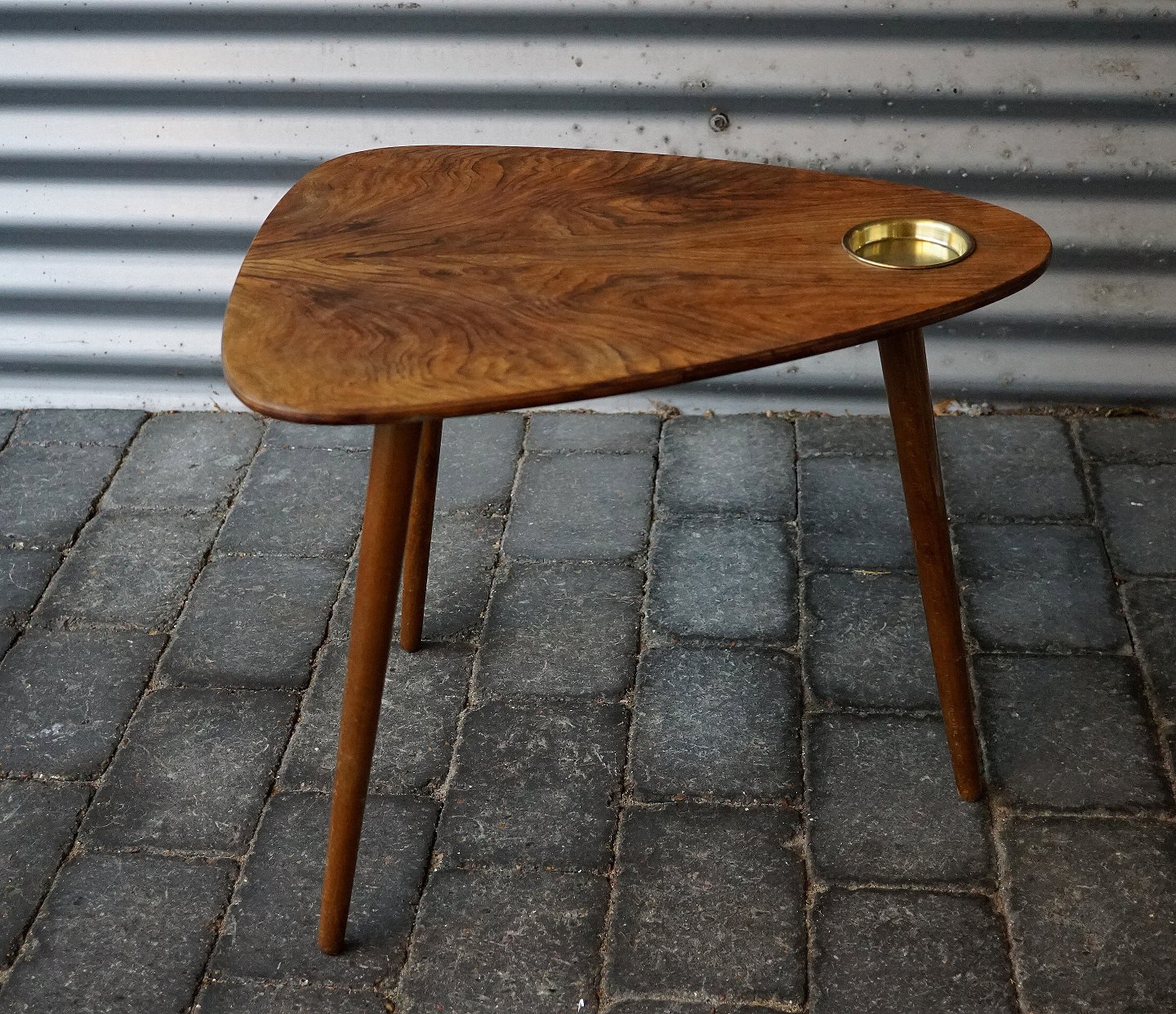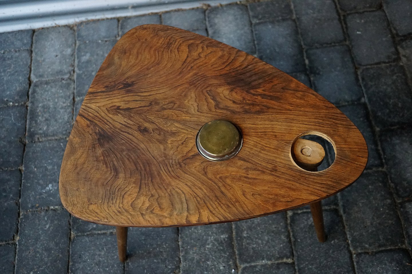 Ovalt sidebord, i nøddetræ, med lille asiet indbygget, asietten er af messing. Bordet har 3 ben. Der fremkommer et hjorte hoved i finerne