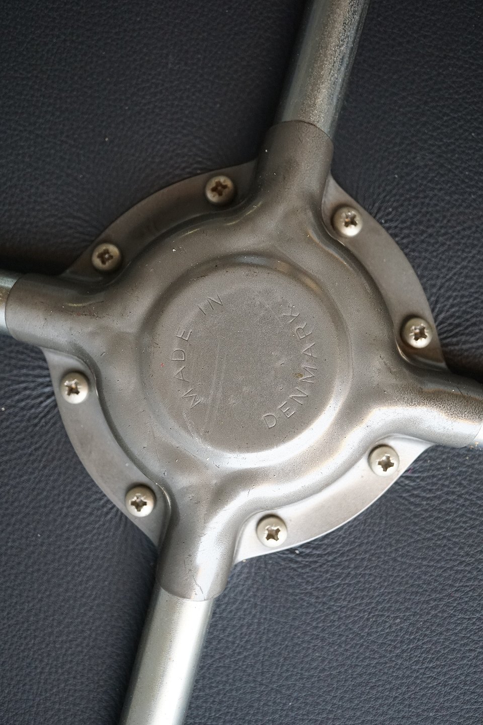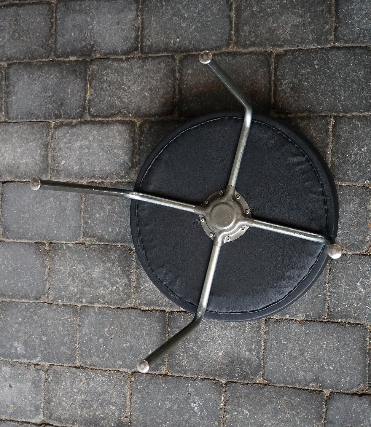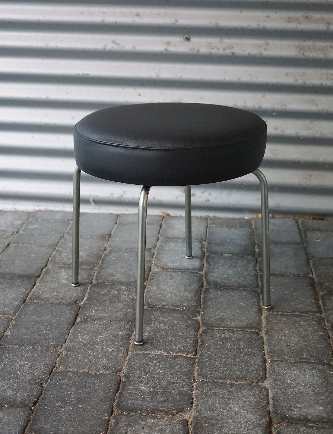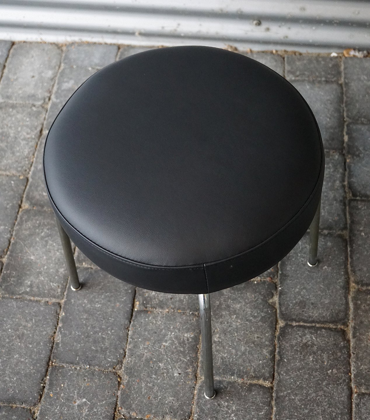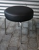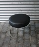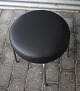 Rund taburet nypolstret med læder, taburetten har stålben. I bunden af taburetten/skamlen står "Made In Denmark"