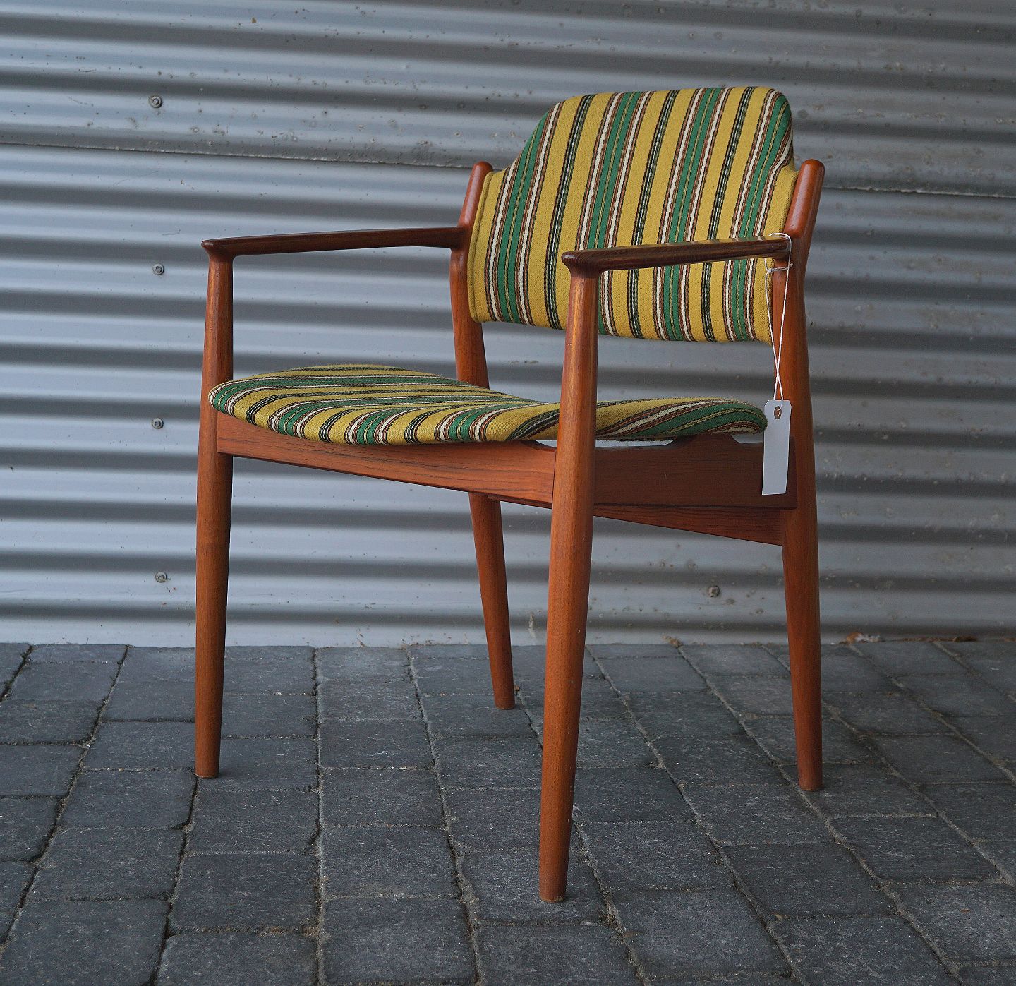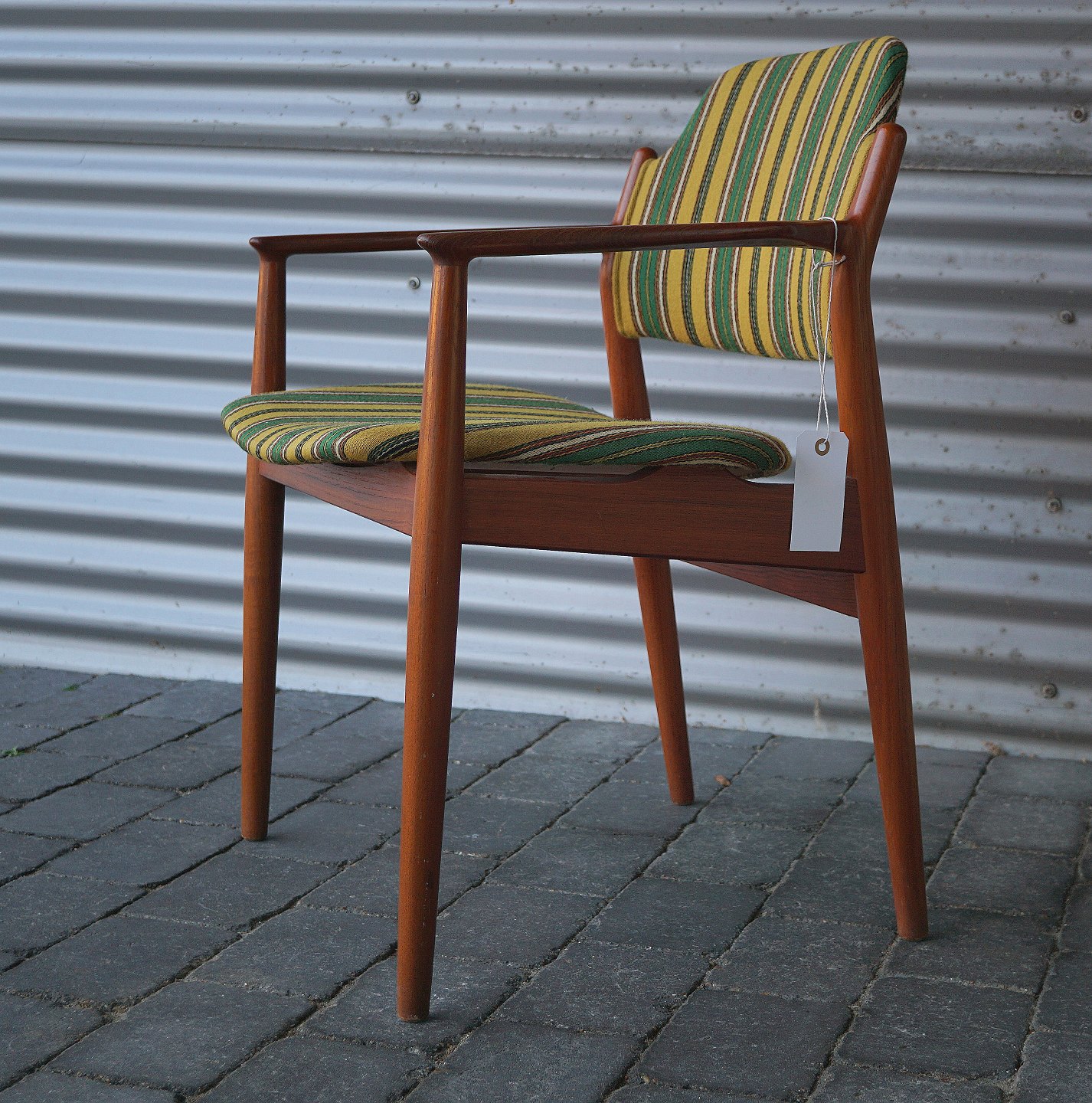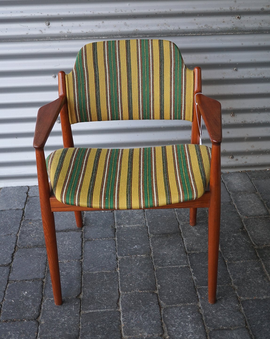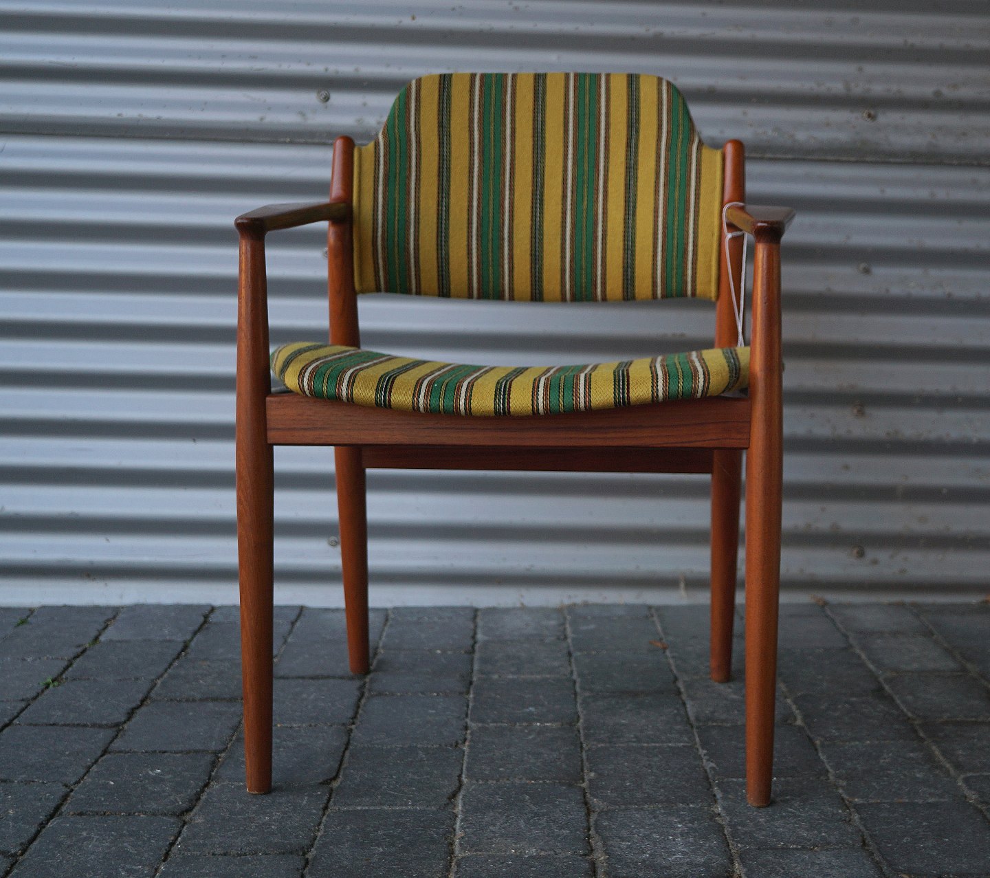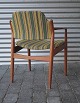 Arne Wooder, armstol betrukket med originalt stribet stof, stolen er lavet i teaktræ