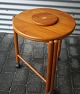Rundt serveringsbord, massiv teaktræ. Den ene af pladerne kan sættes oven på den anden, så den øverste kan dreje rundt (se billede 3). Pladerne kan tages af og stellet kan slås sammen.
