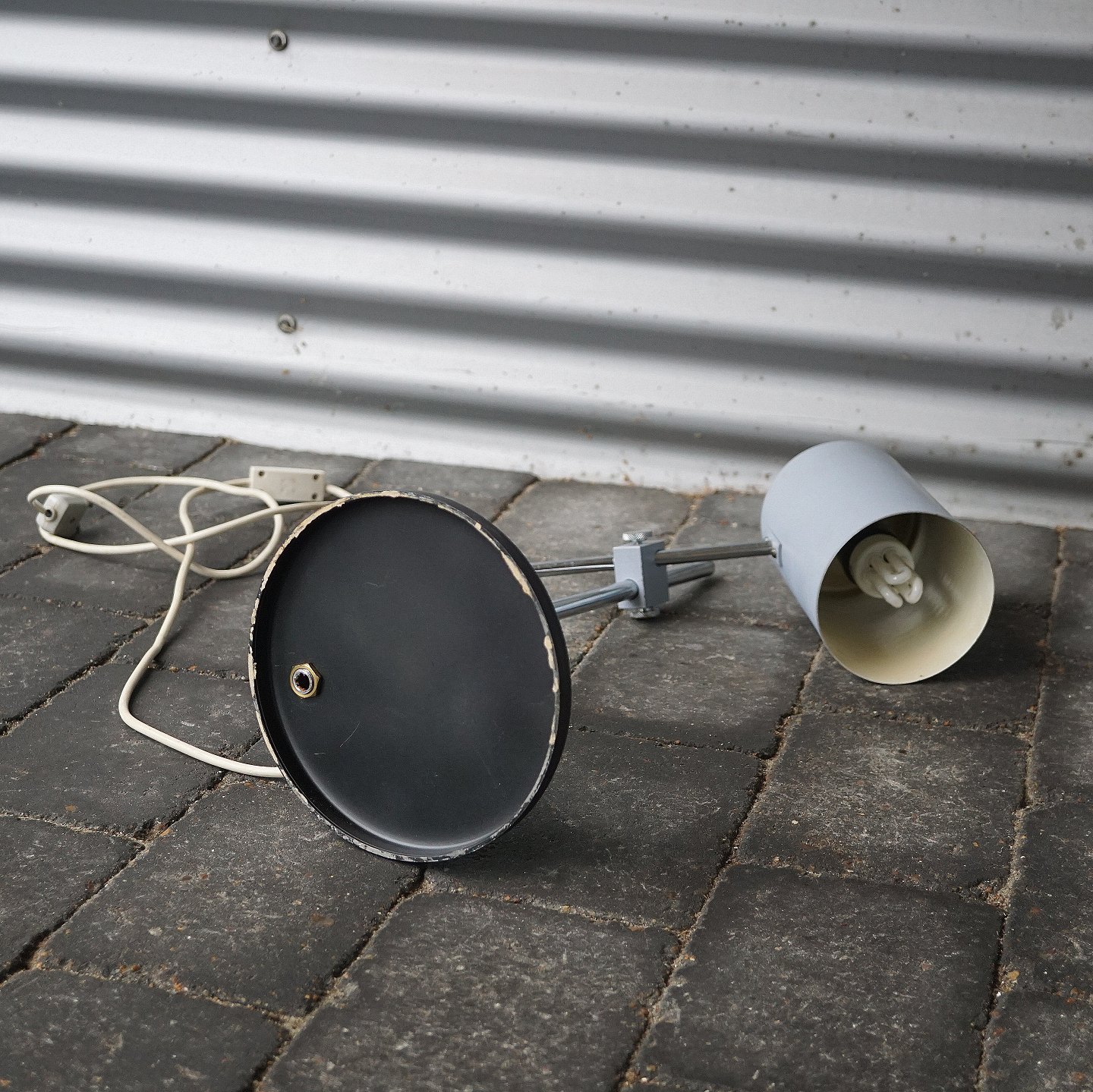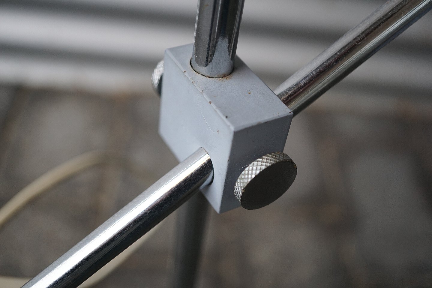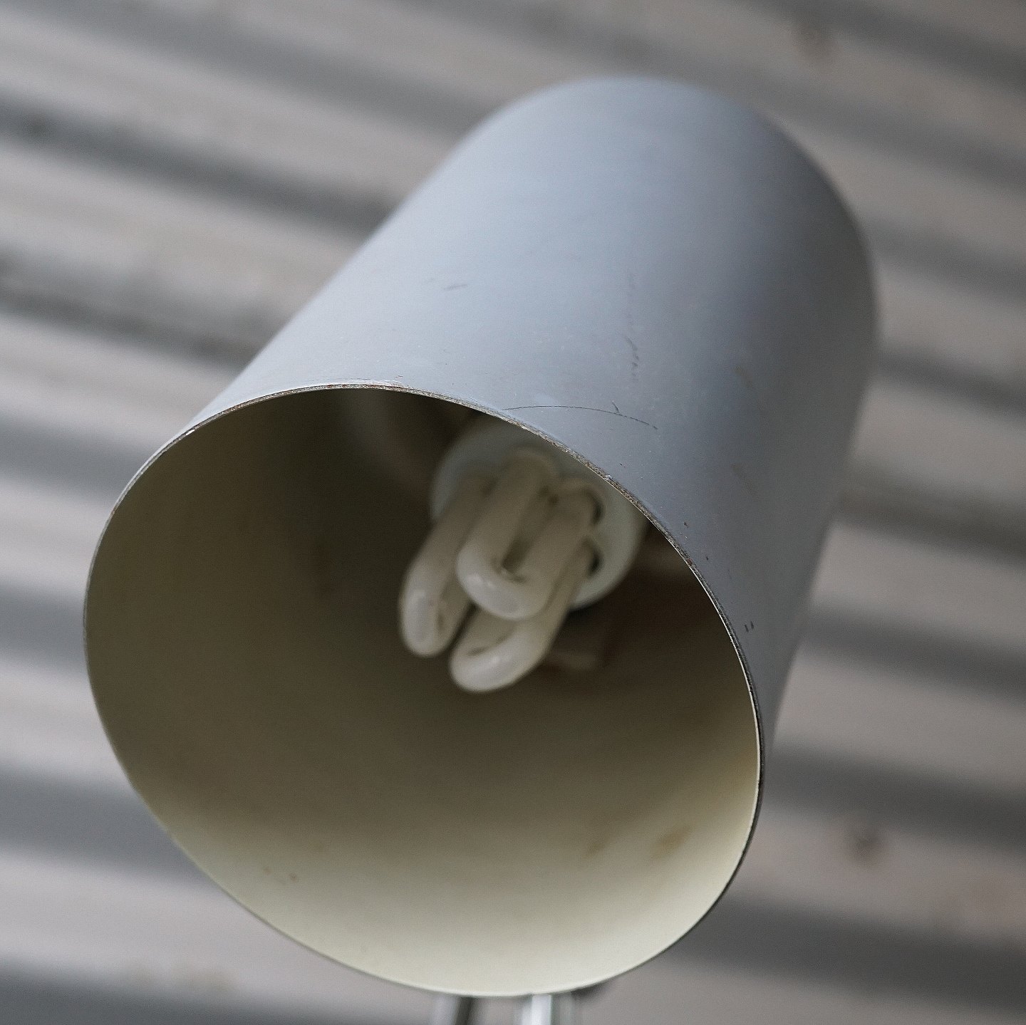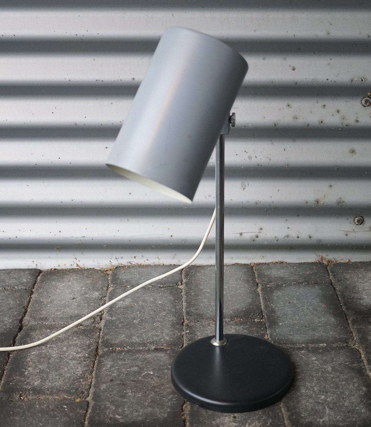 Regulerbar bordlampe, med mat grålakeret skærm, blankpoleret stålstang, sortlakeret stålfod