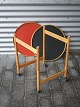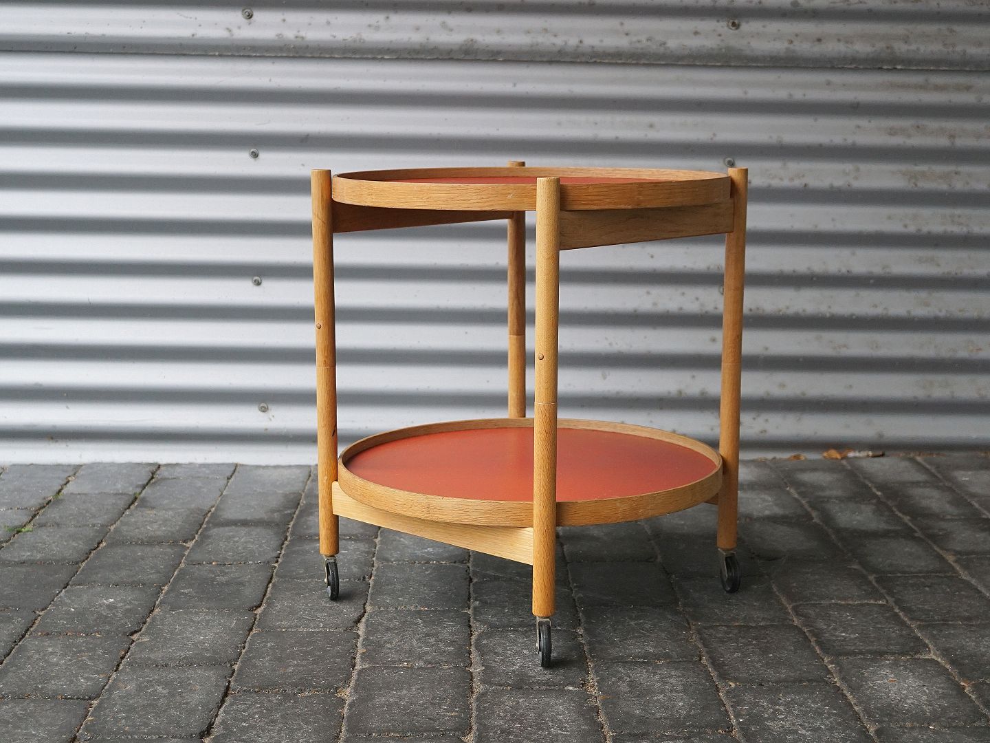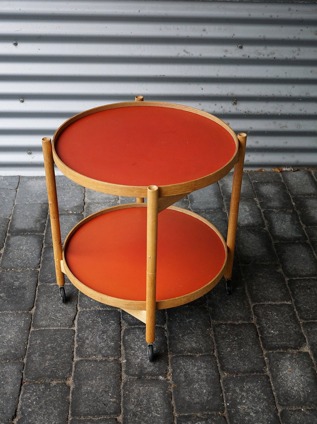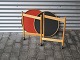 Bord på hjul med foldbart stel og vendbare bakker i sort og rødt laminat