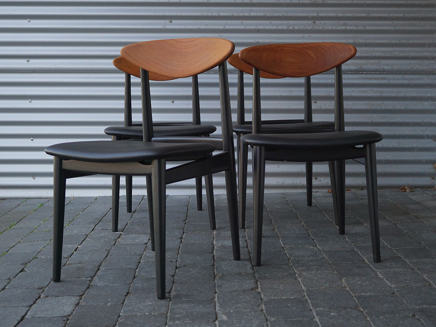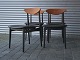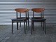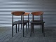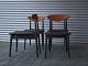 4 stole med teaktræsryg og sort nylakeret stel, sædet er nybetrukket med læder.