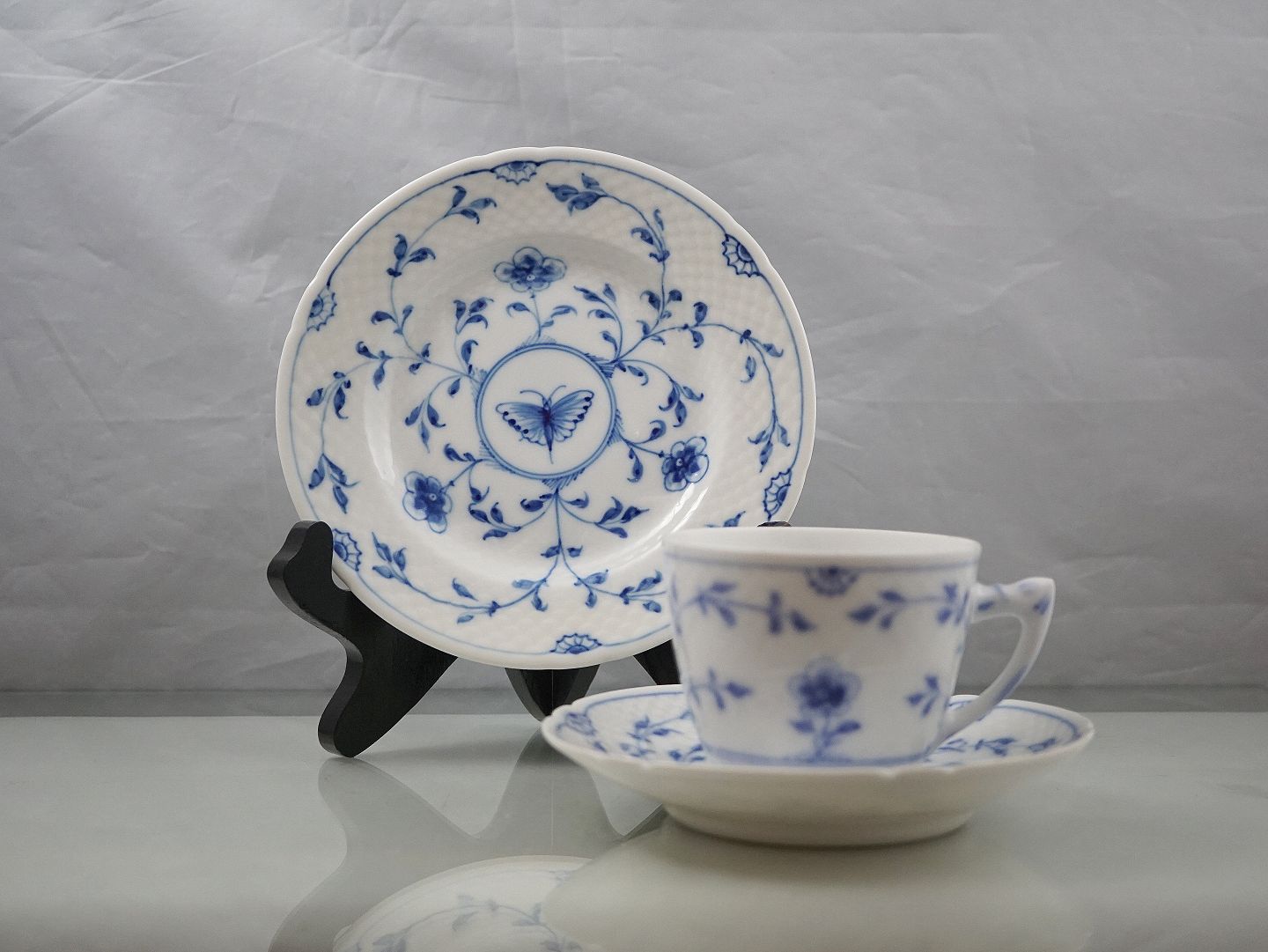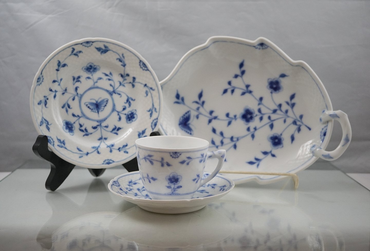 Sommerfuglestellet, sommerfugle dekoration på hvidt porcelæn, spise- og kaffestel,