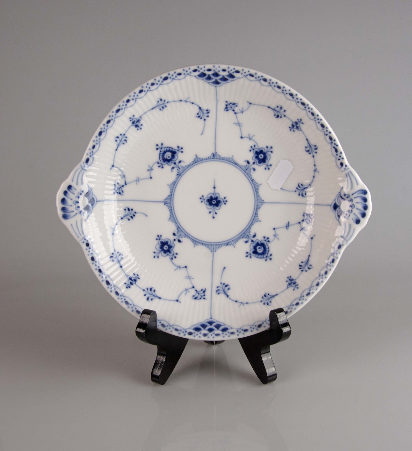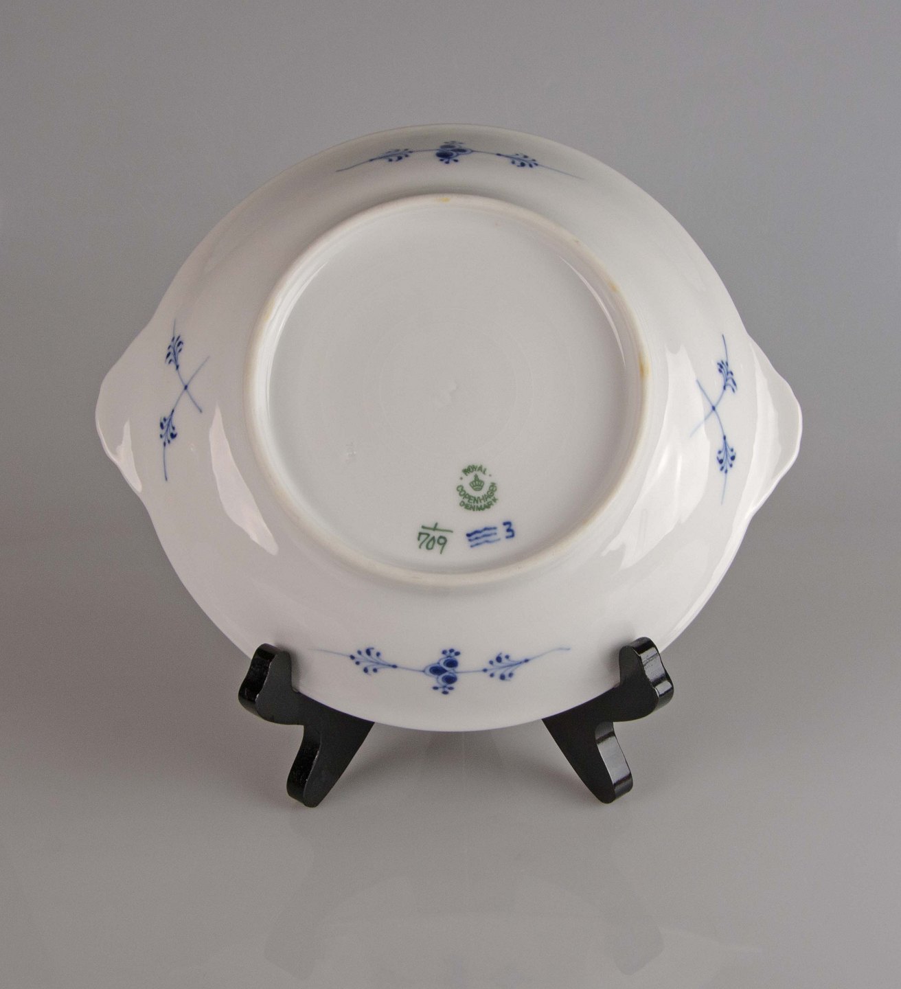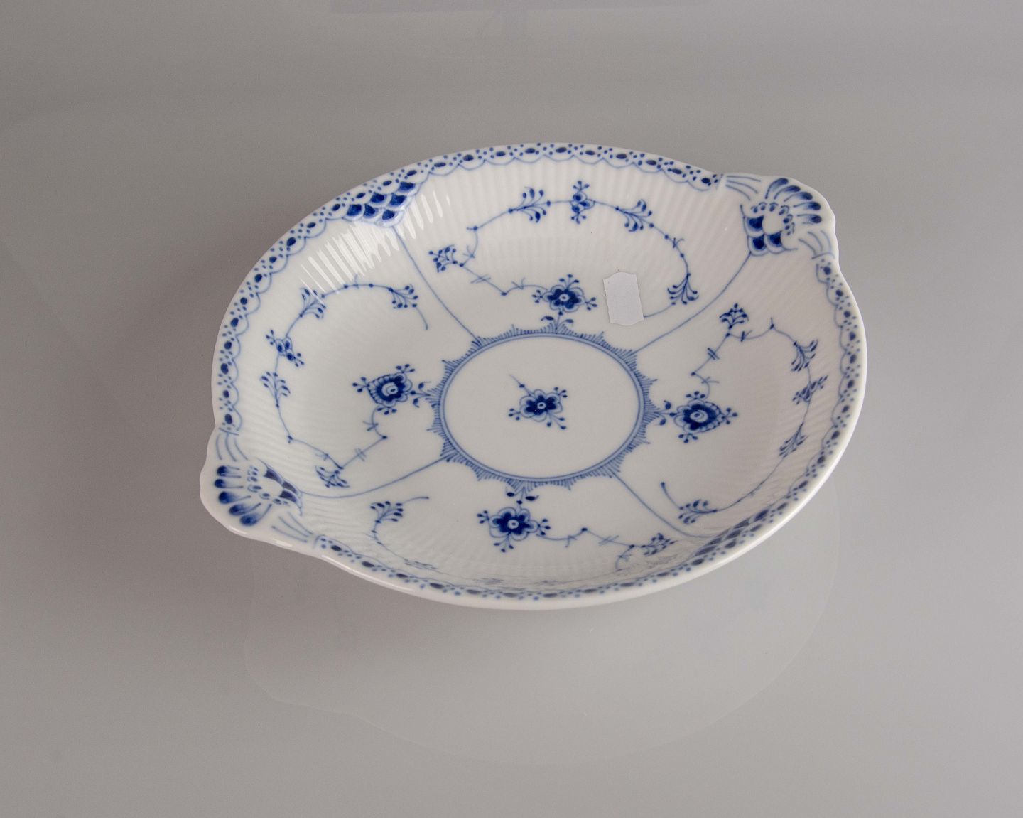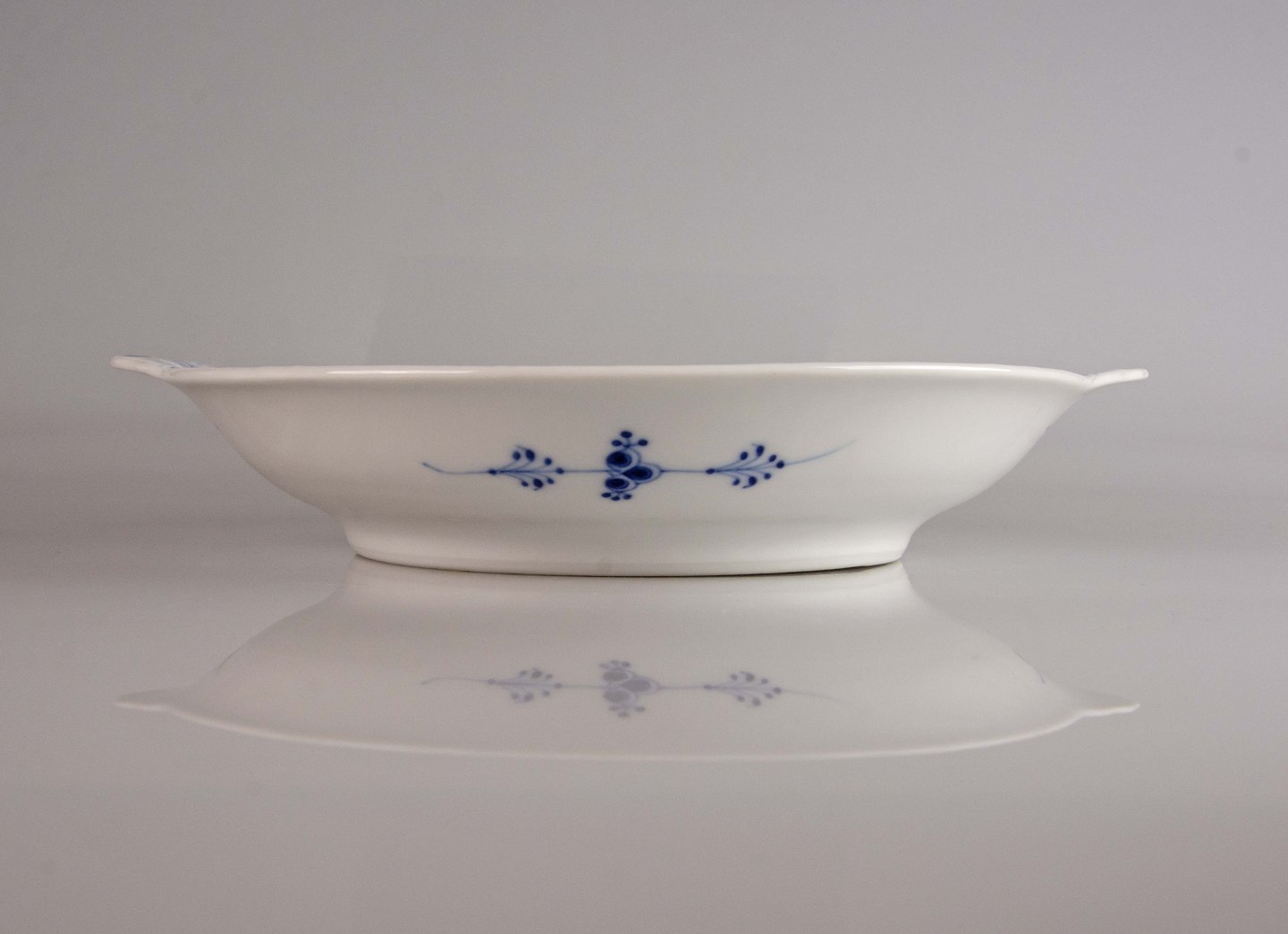 Rundt fad med to hanke i porcelæn i serien musselmalet halvblonde nr. 1/709