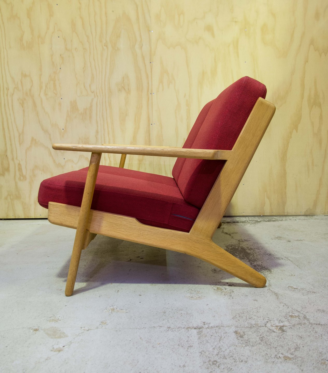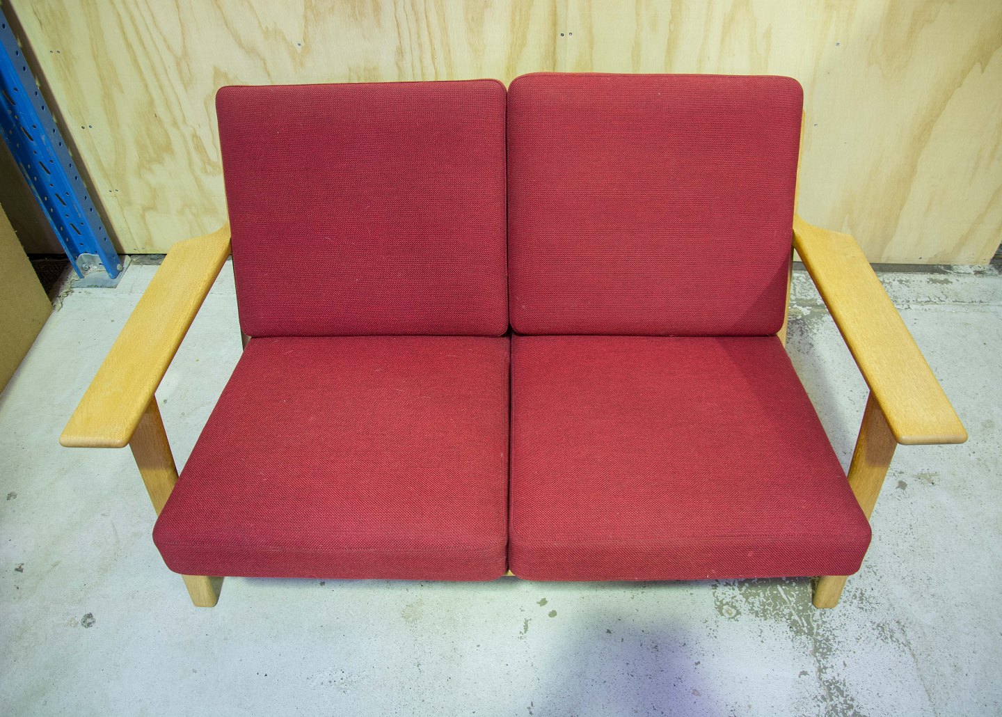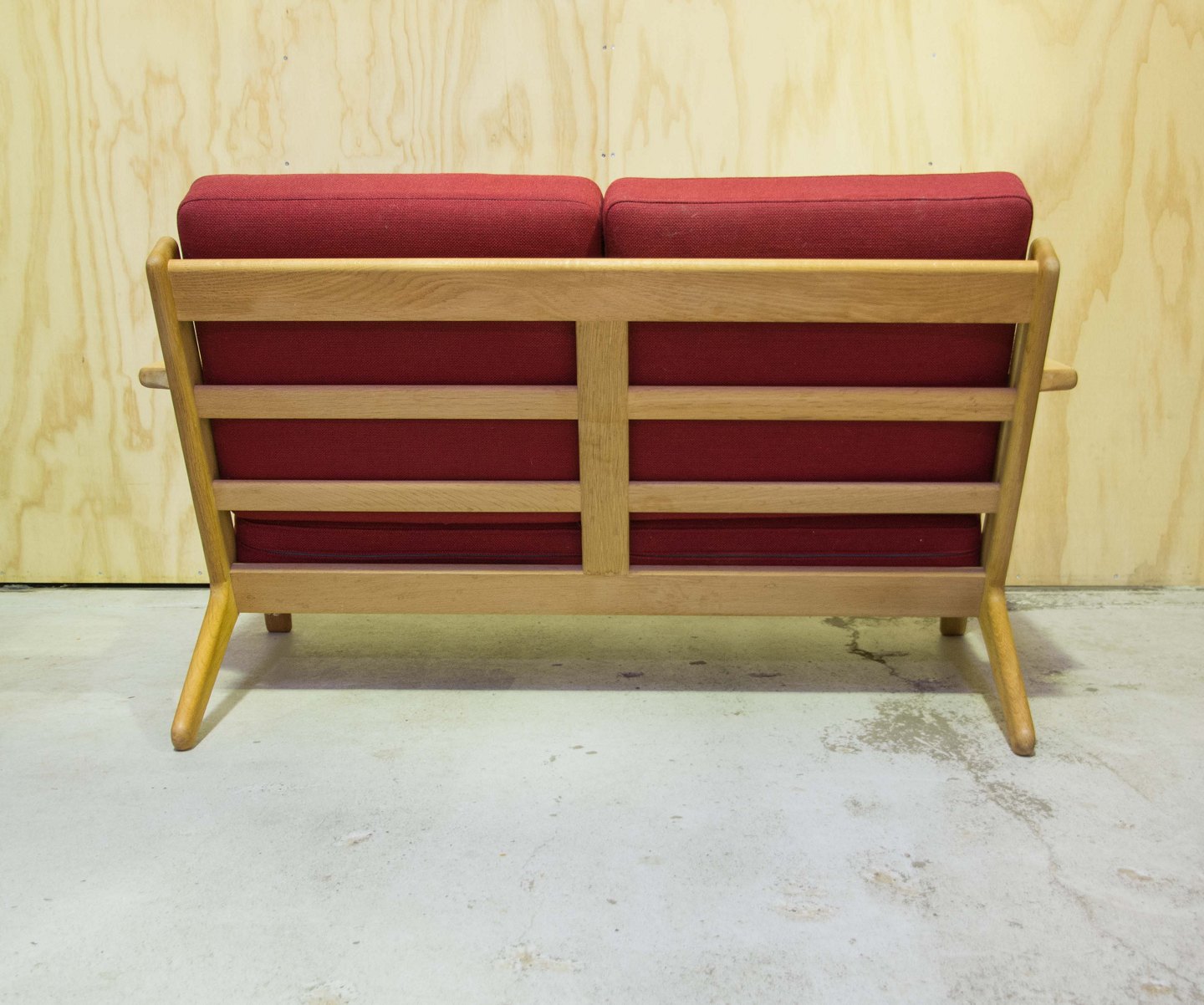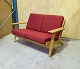 2 personers sofa i sæbebehandlet egetræ med bordeaux uldbetukne hynder. Model GE 290/2, denne er solgt vi har en anden lignende