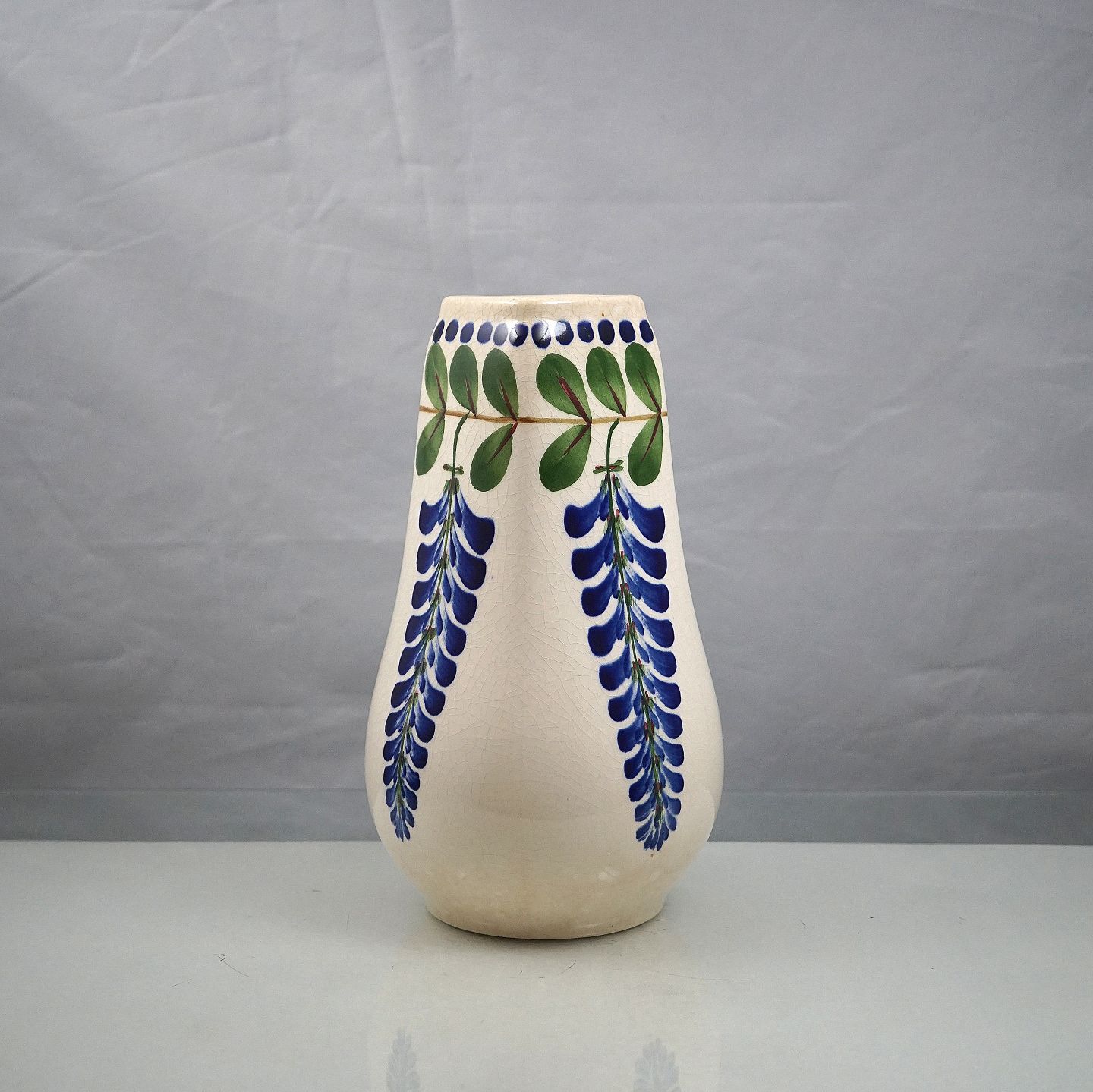 Aluminia. Blå Regn vase nr. 522/110. Vasen er polykrom dekoreret og fremstillet i fajance