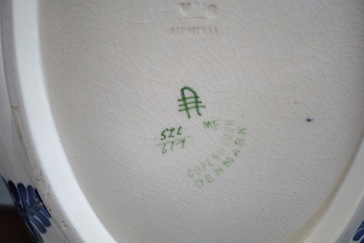 Blåregn ovalt fad fra Aluminia nr. 522/617. Fad med bølget kant. Reparation i fod, der er svært at se.