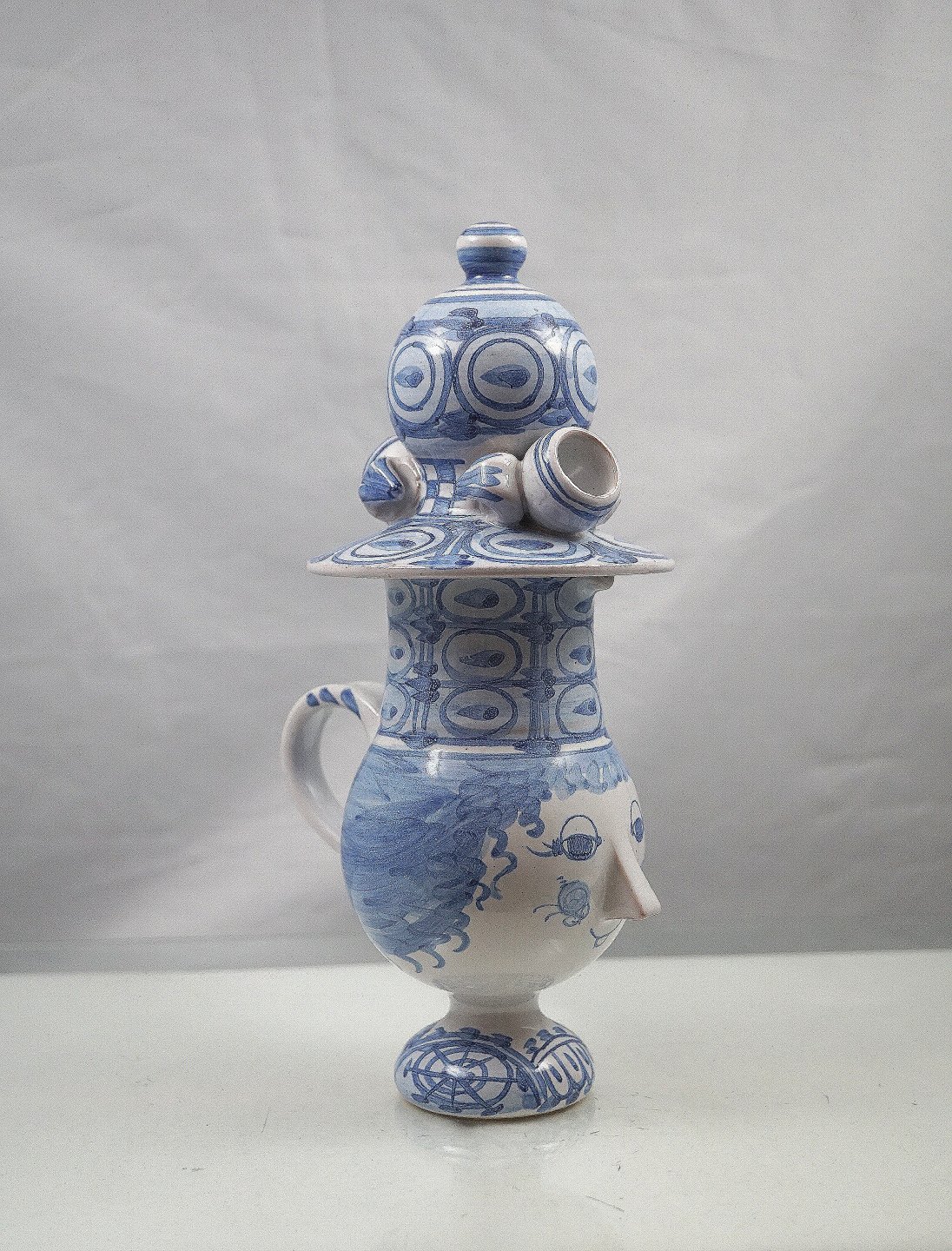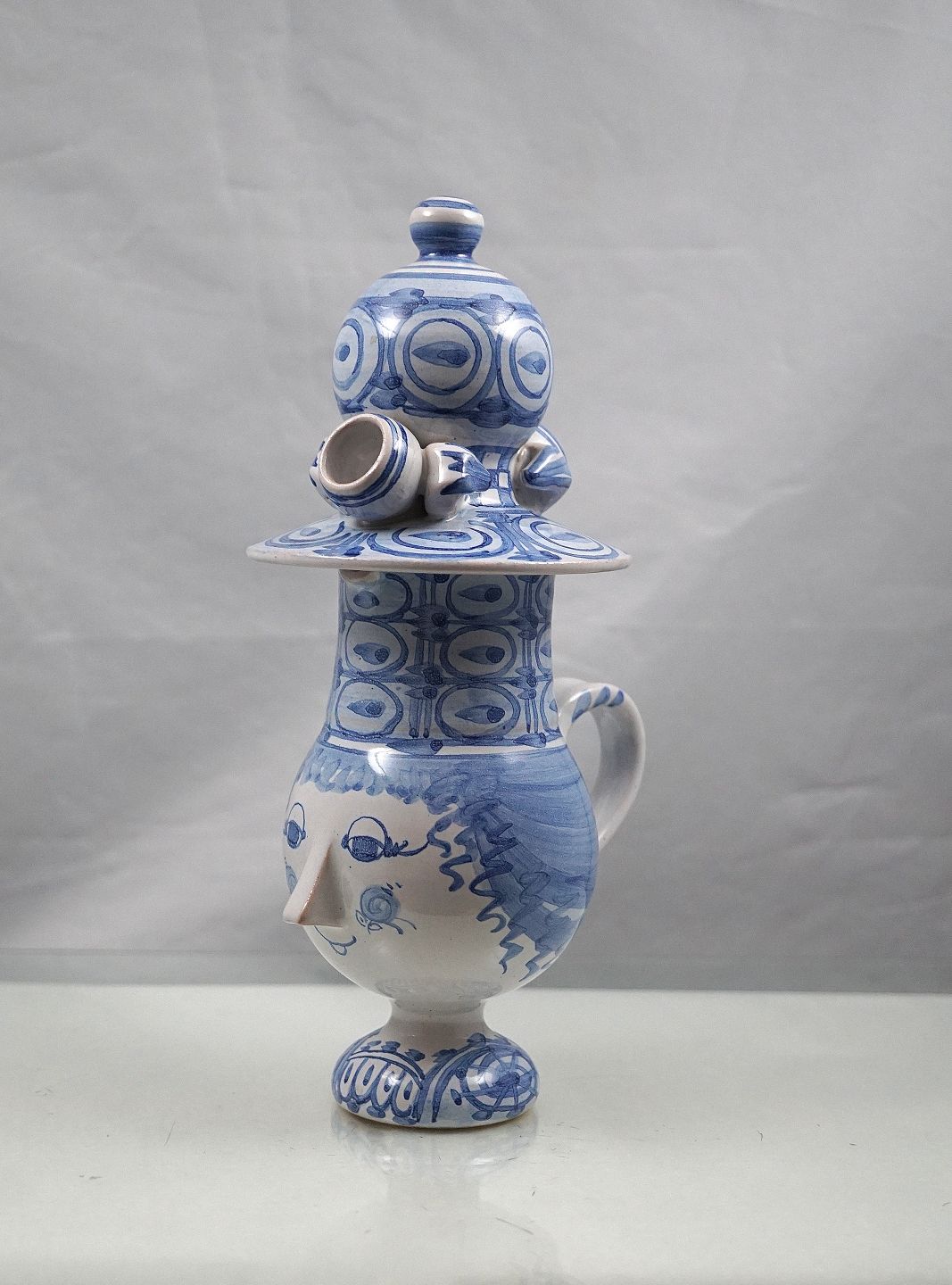 Bjørn Wiinblad, Damehoved med hat, der fungerer som kande med låg, nr K31. Damehovedet er malet med blåt