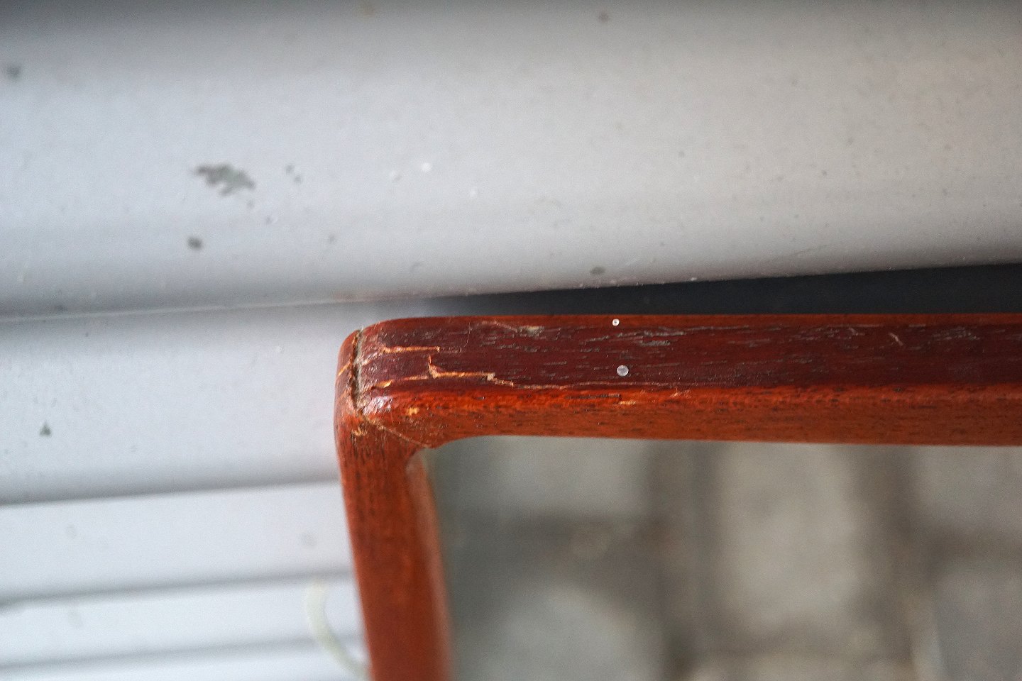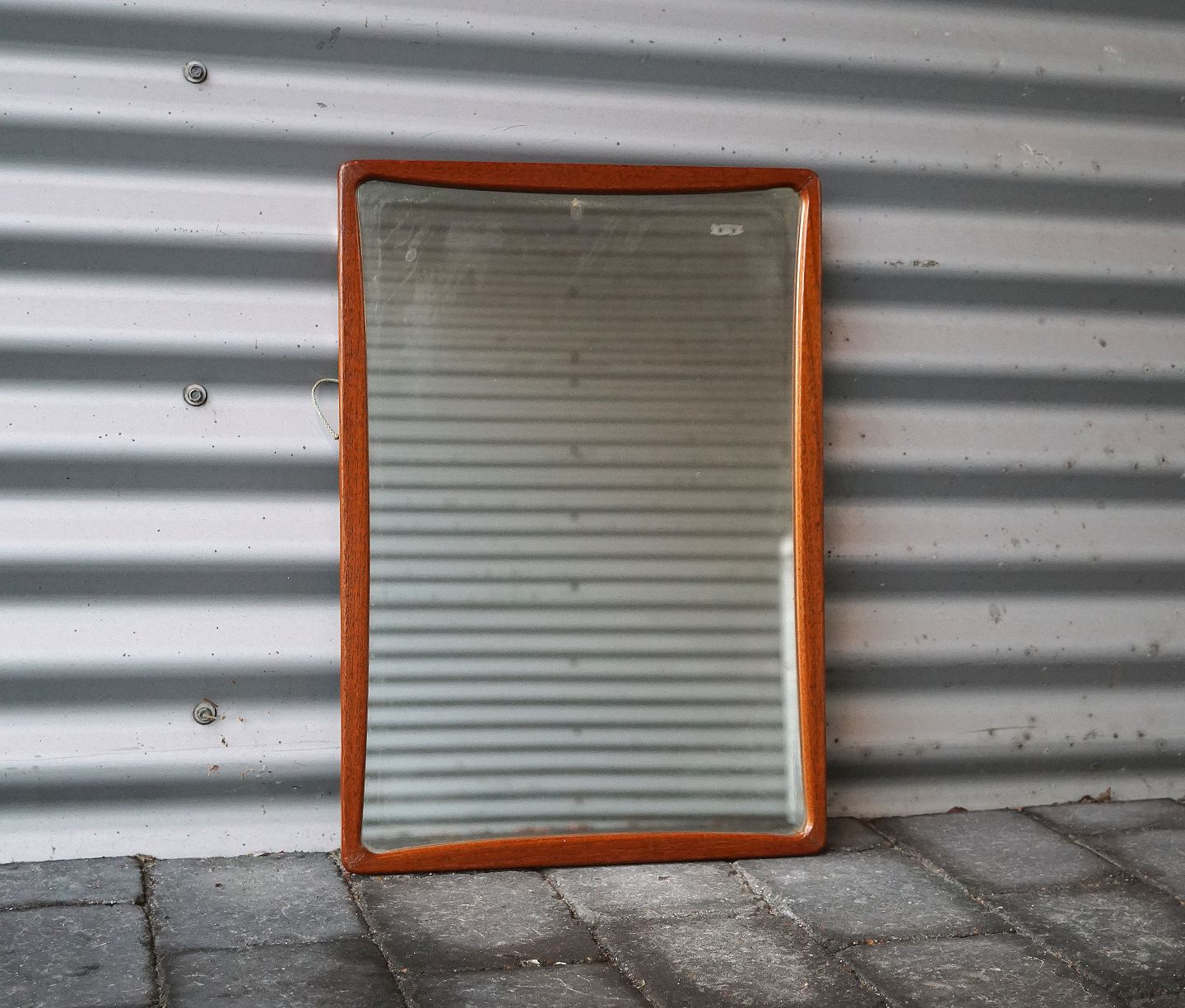 Spejl med detaljer i teaktræsrammen. Spejlet har en sort, helt blank bagside