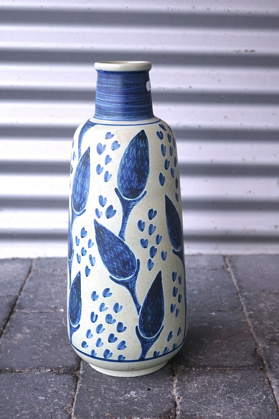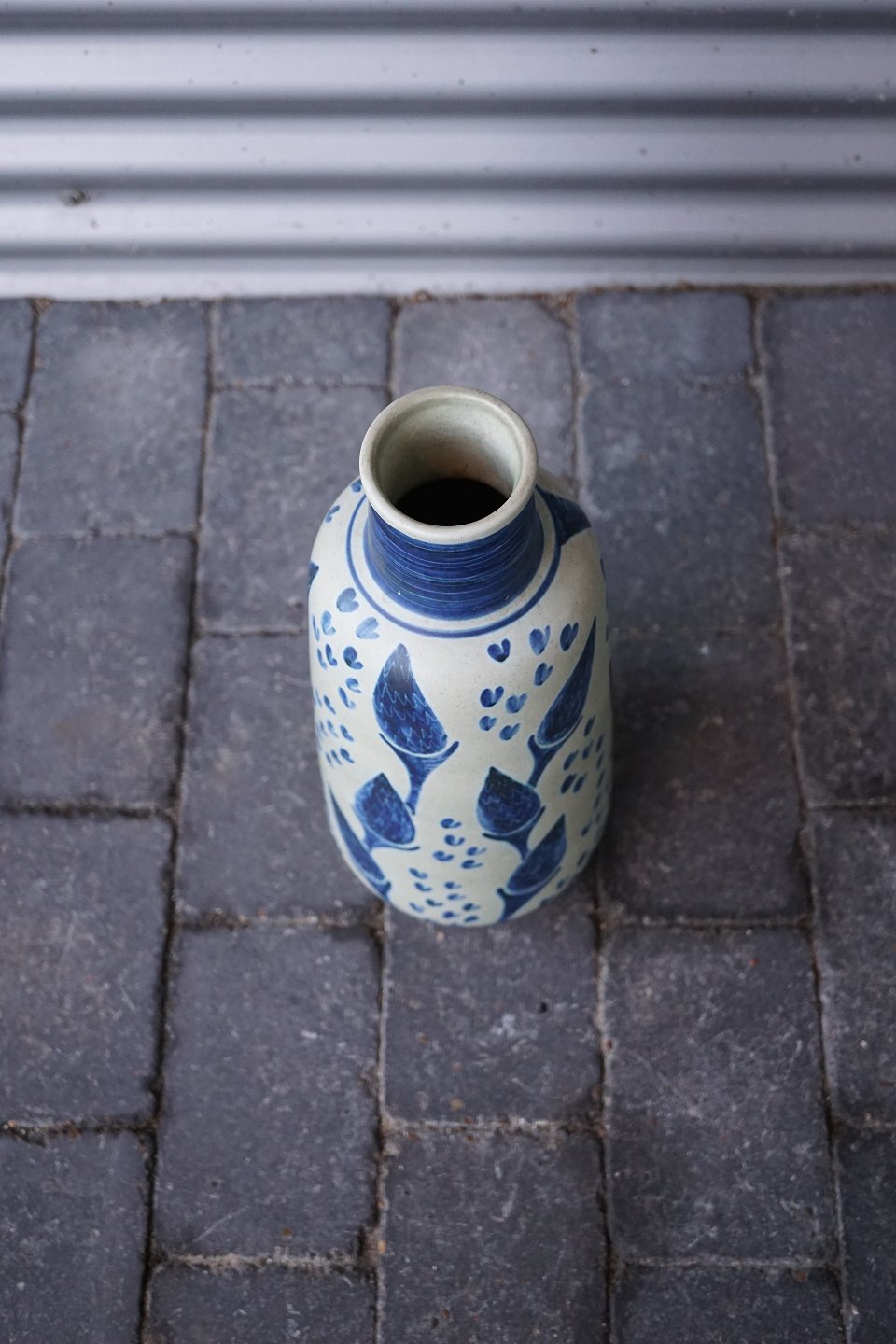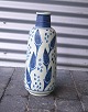 Søholm, Bornholm. Vase, nr. 2077, der er dekoreret med stiliseret lupiner, vasen er hvid og dekorationen er holdt i en blå farve. Signeret EJ, ca. 1960