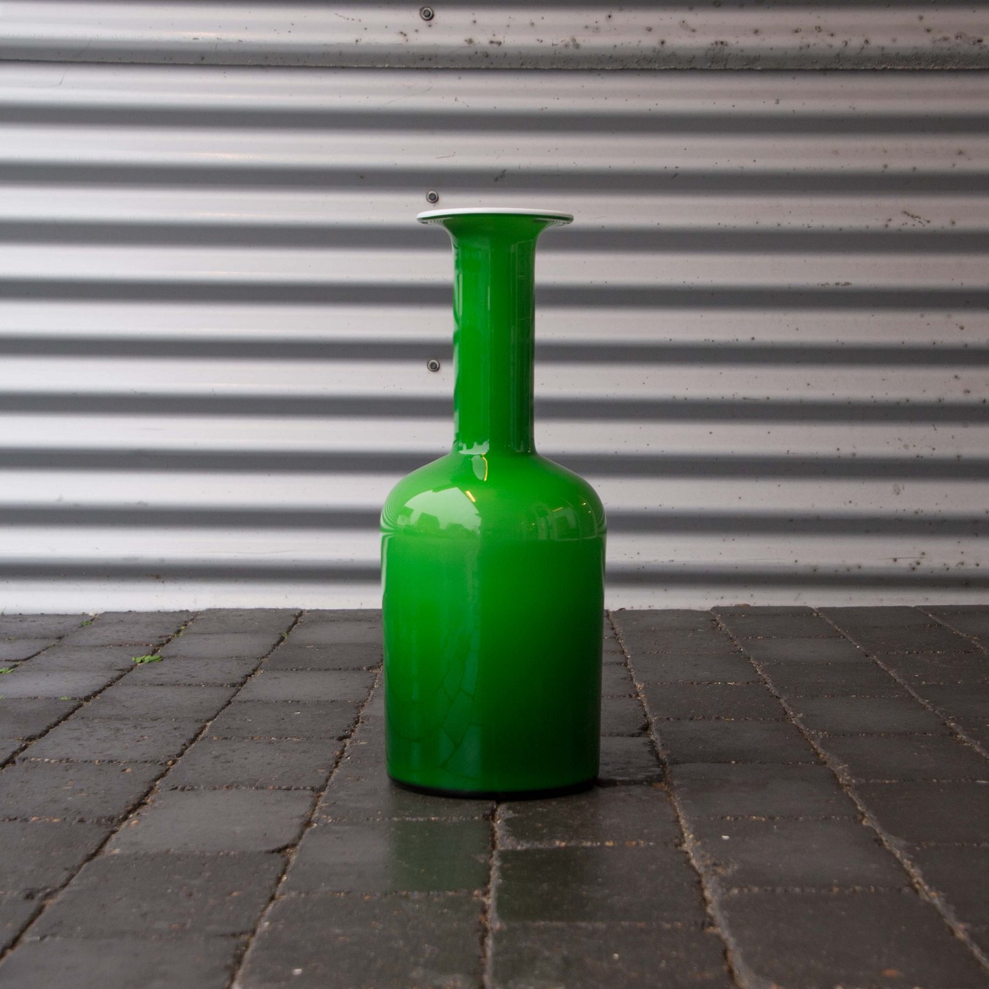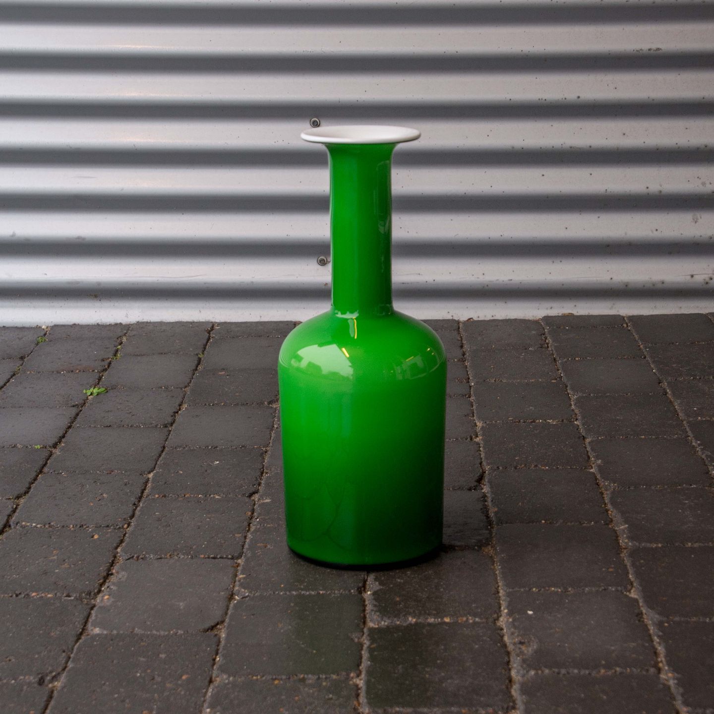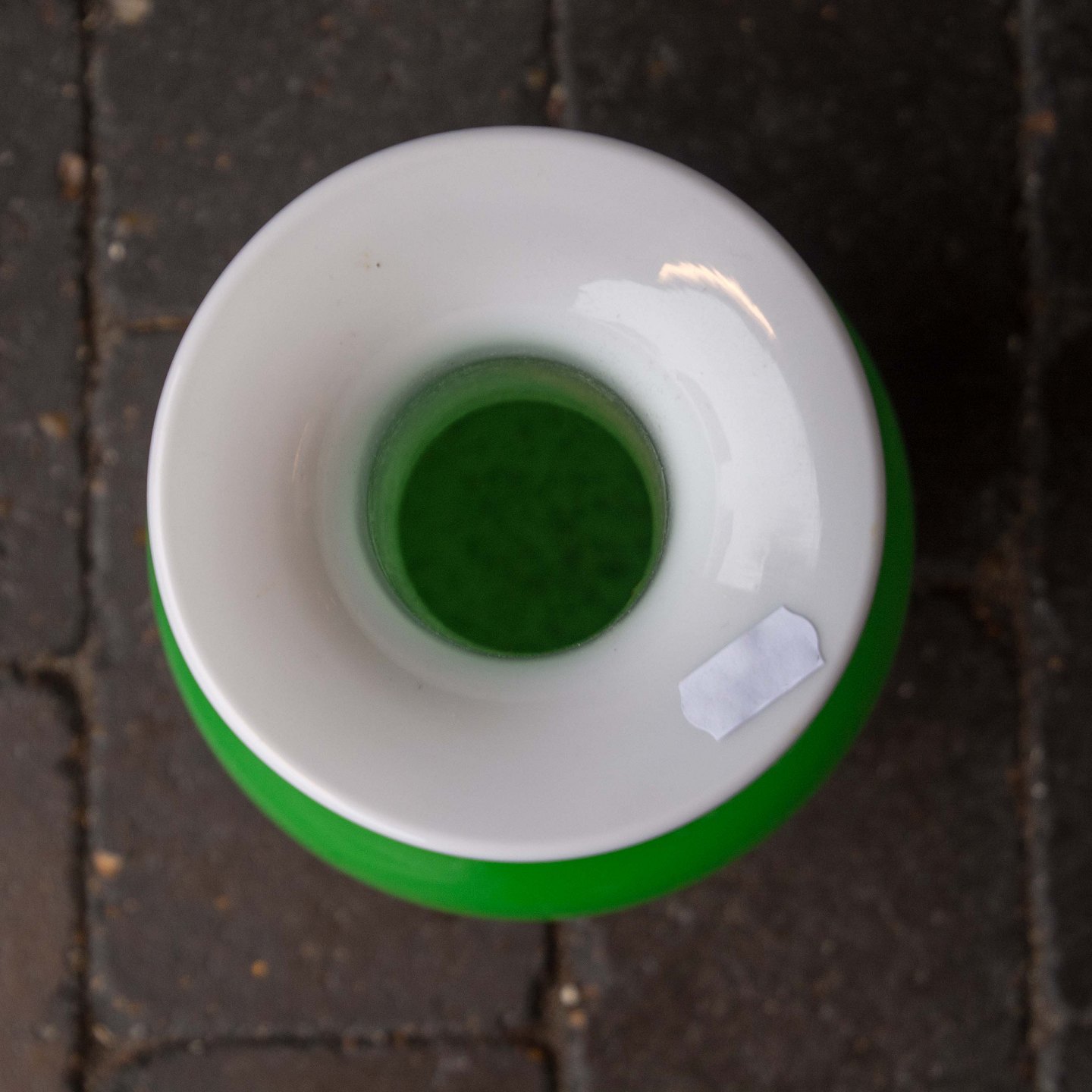 Stor gulvvase med inderside i opalhvid glas og grønt overlagsglas