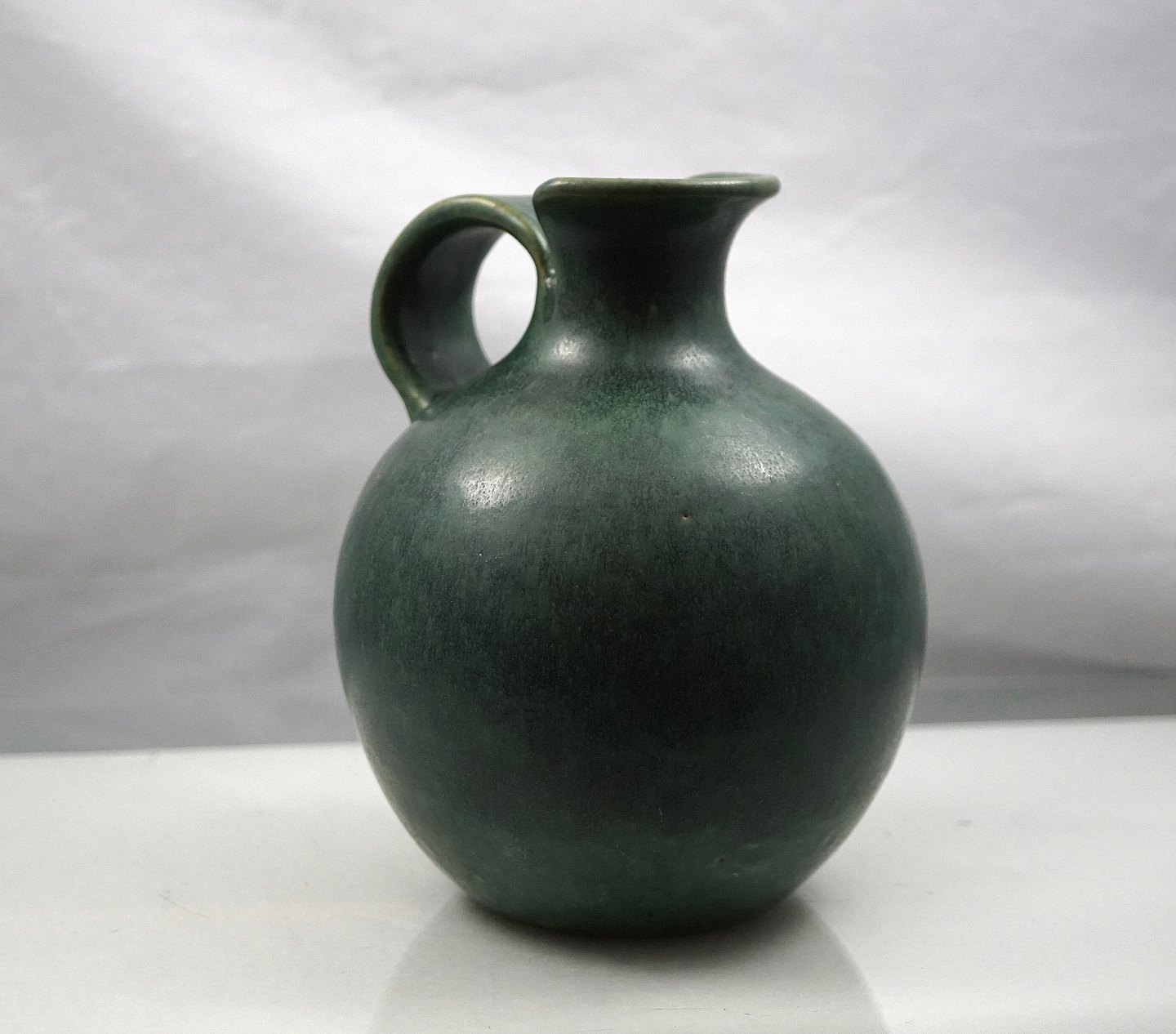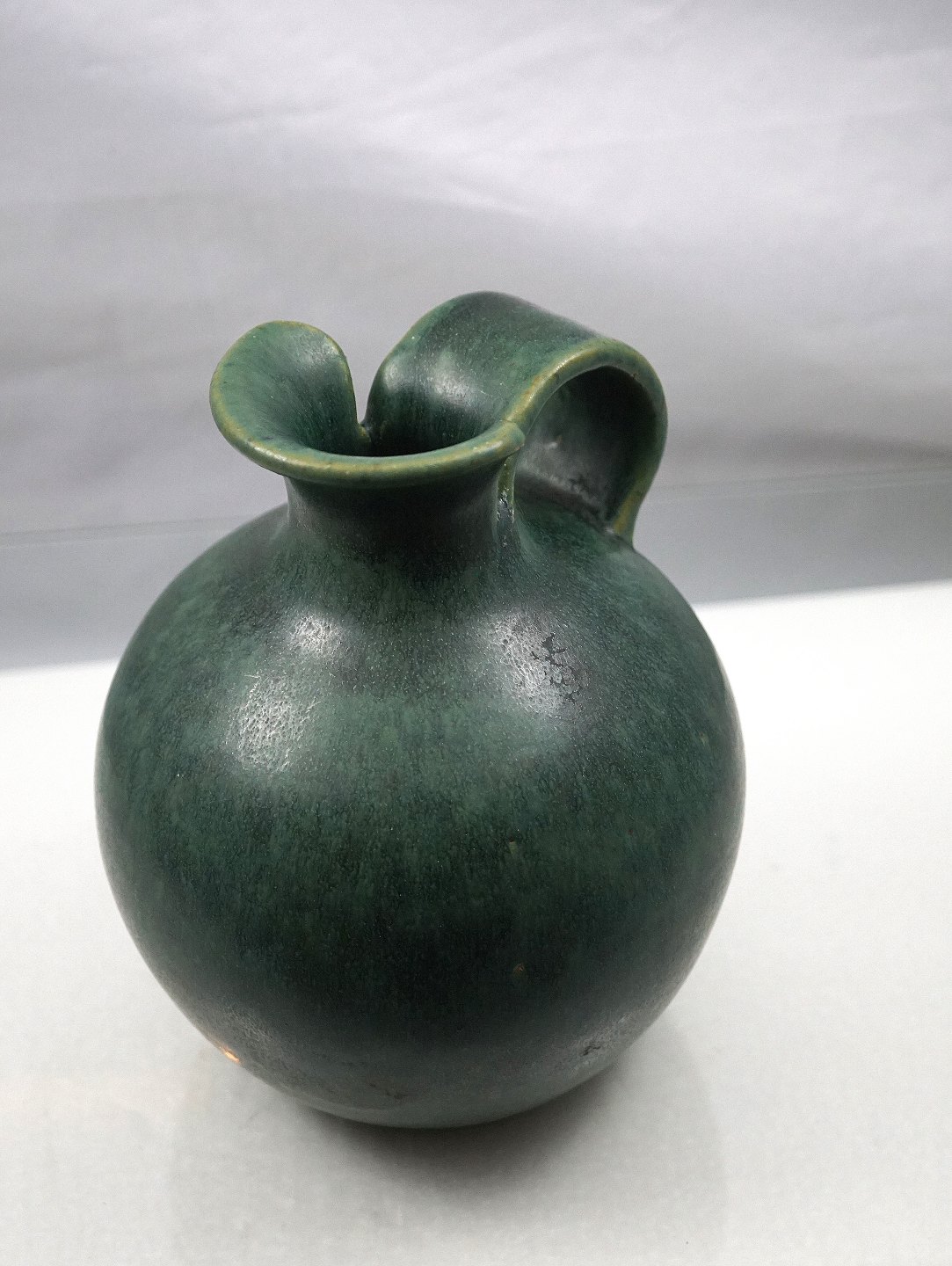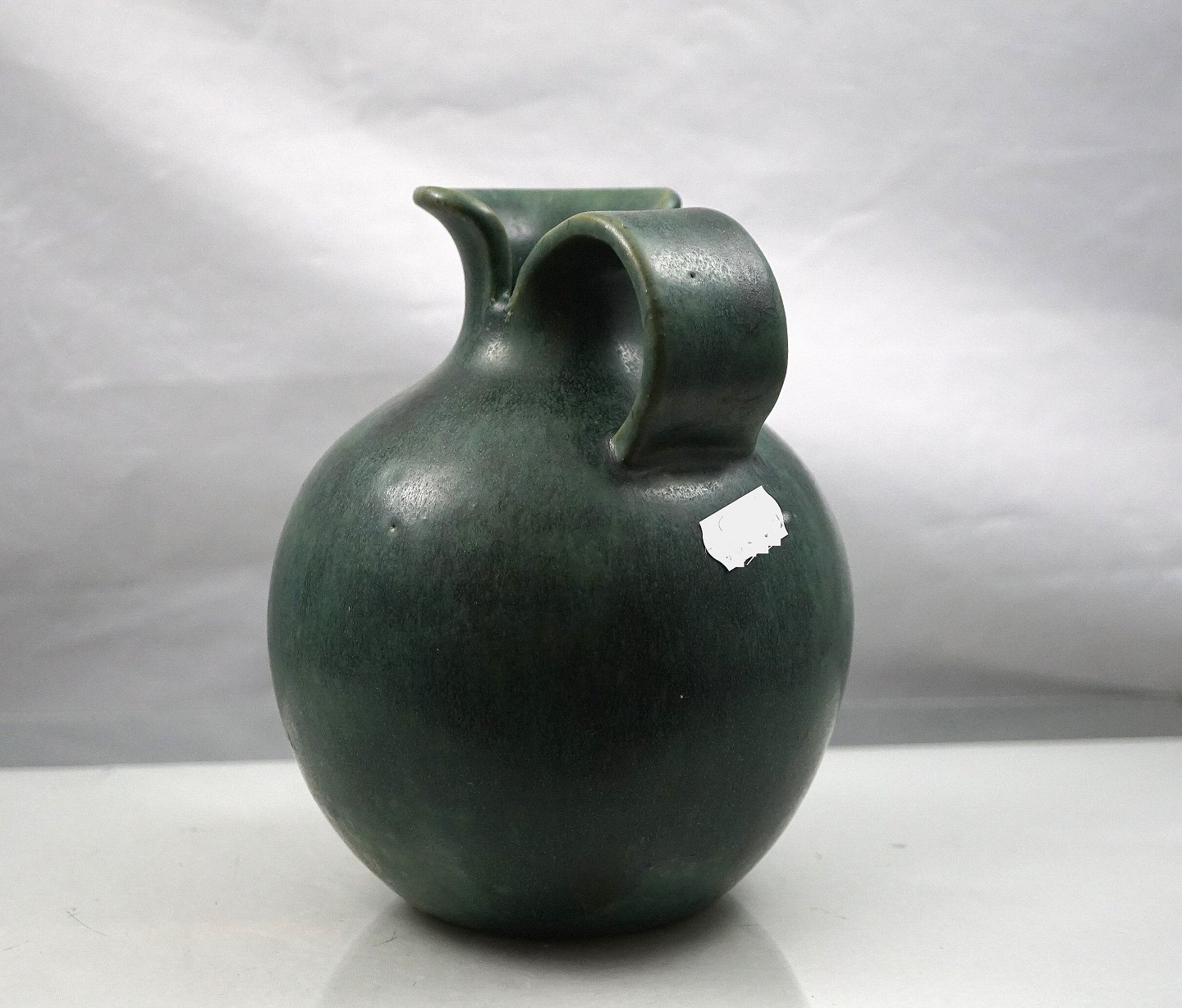 Holbæk vase/kande i keramik, med grønt glasur. Kanden har en bred hældetud og en bred hank