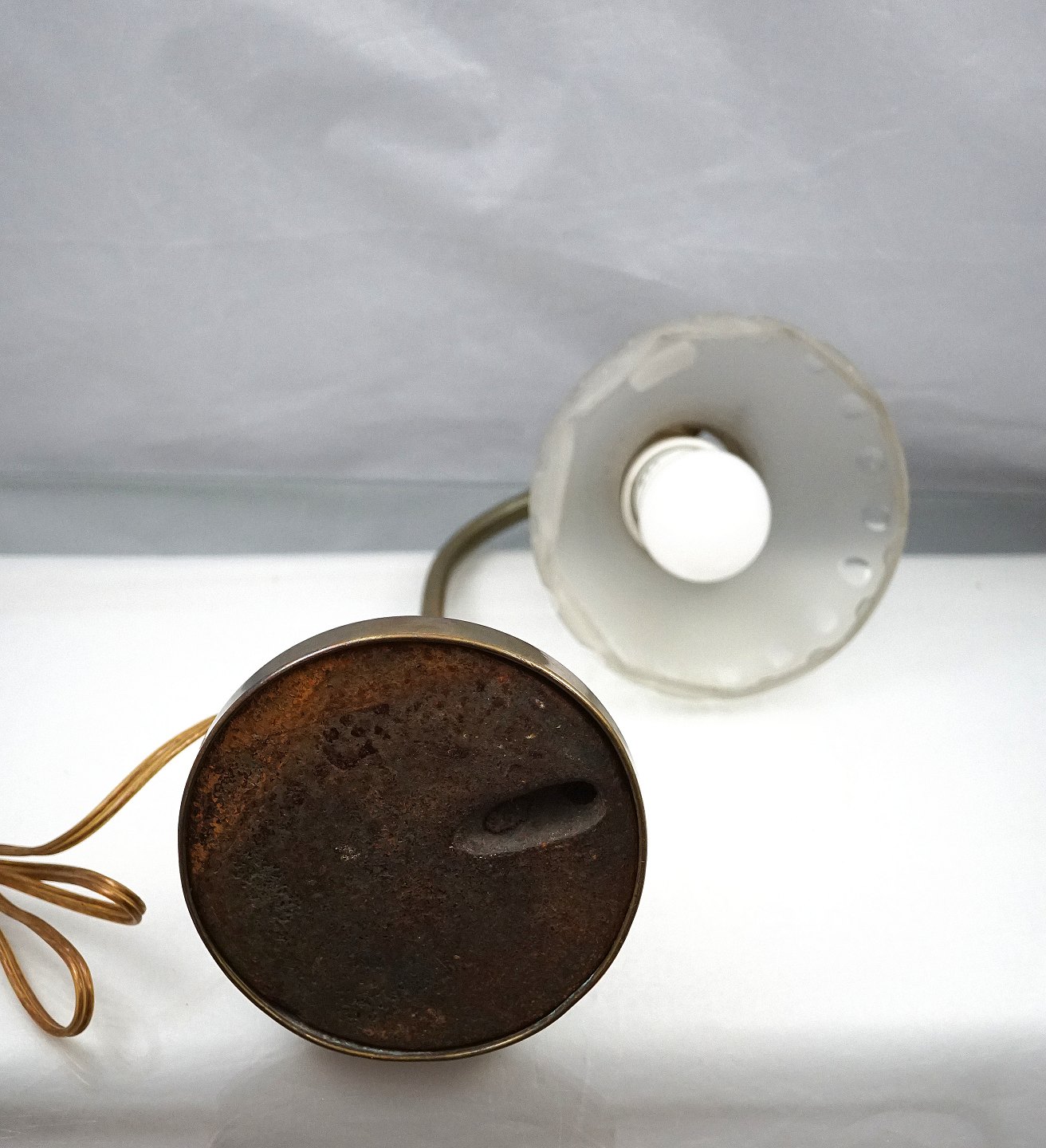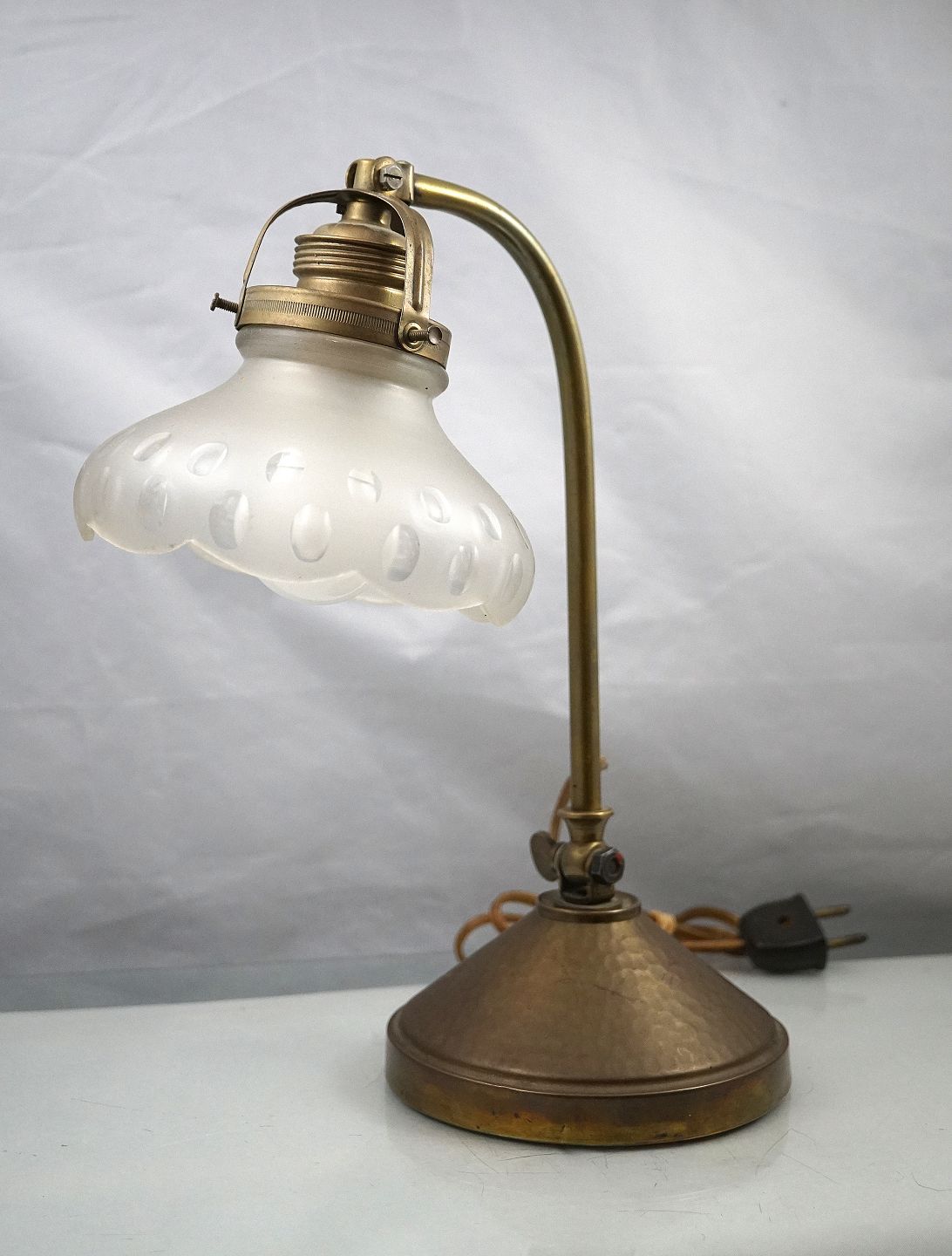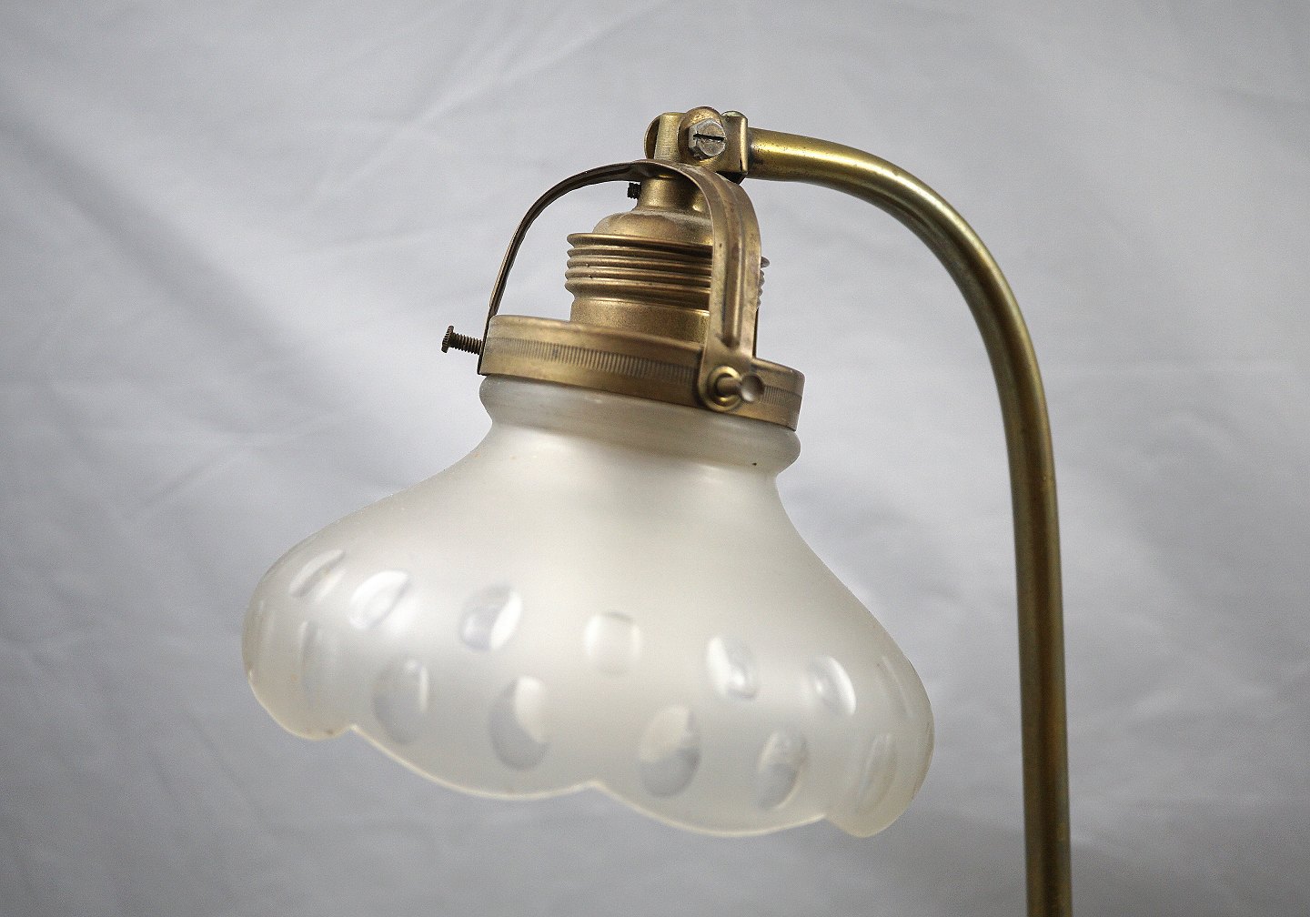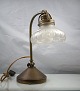 Bordlampe af messing og med glasskærm. Skærmen er af matteret glas med små, klare ovaler. Skærmen er regulerbar. Der er jern i bunden af lampen, for at få lampen til at stå stabilt.