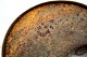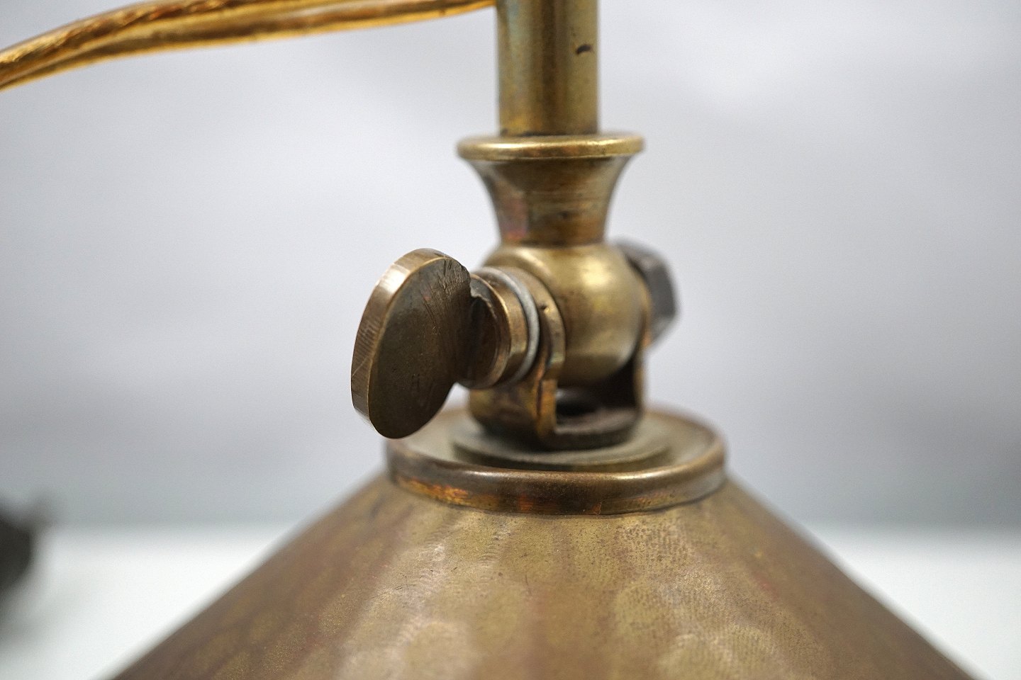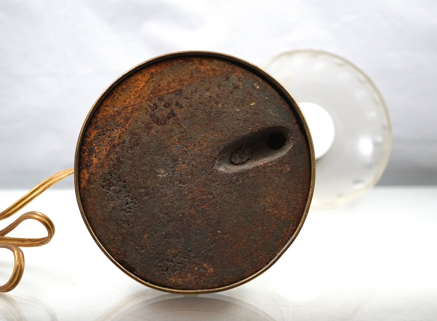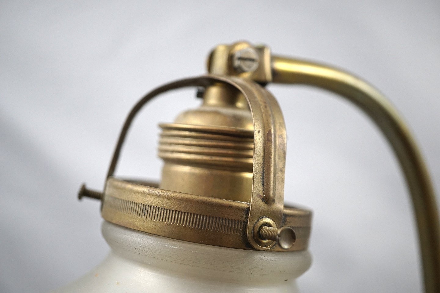 Bordlampe af messing og med glasskærm. Skærmen er af matteret glas med små, klare ovaler. Skærmen er regulerbar. Der er jern i bunden af lampen, for at få lampen til at stå stabilt.