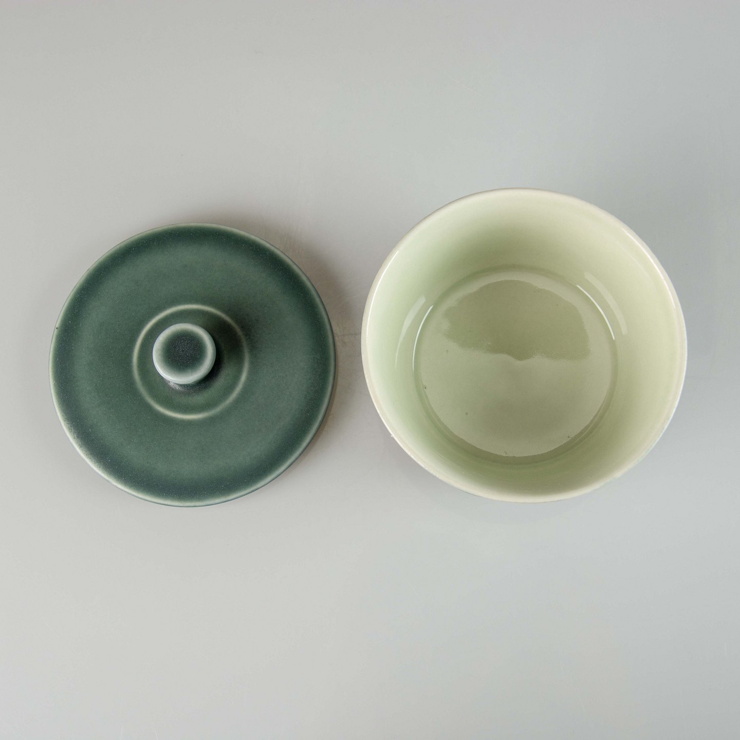 Lågkrukke i blågrøn stentøj med blomster motiver.