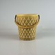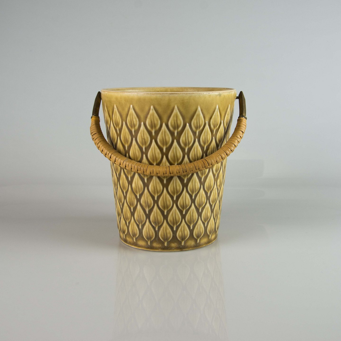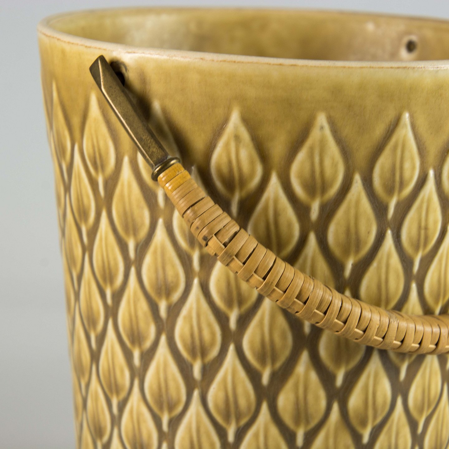 Køler i gulligt stentøj med motiv af blade og håndtag i messing beklædt med bambusflet.