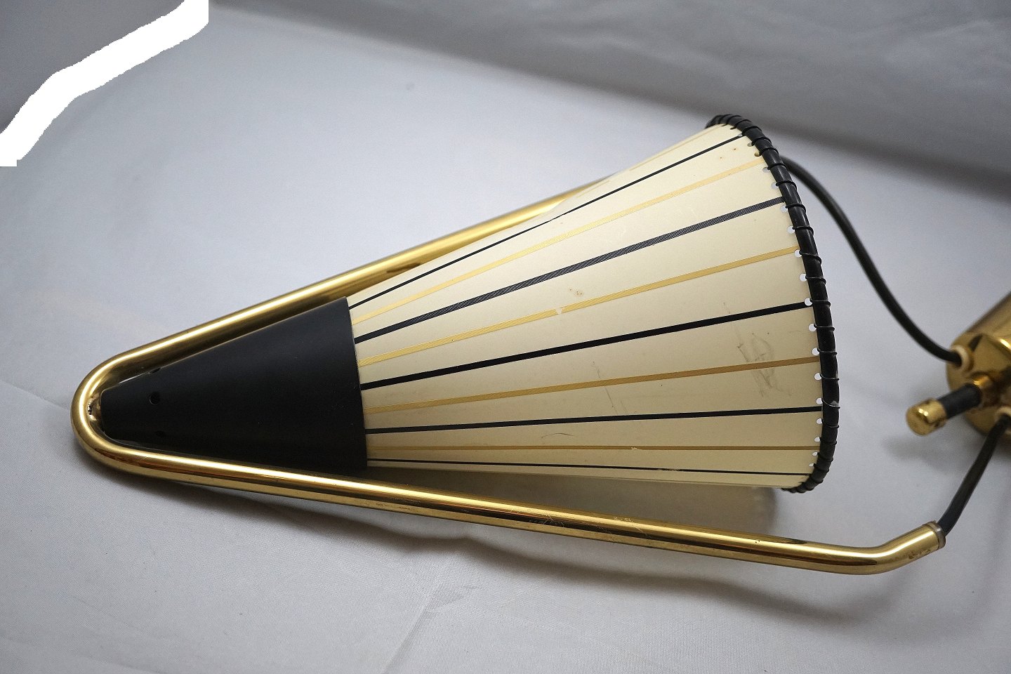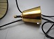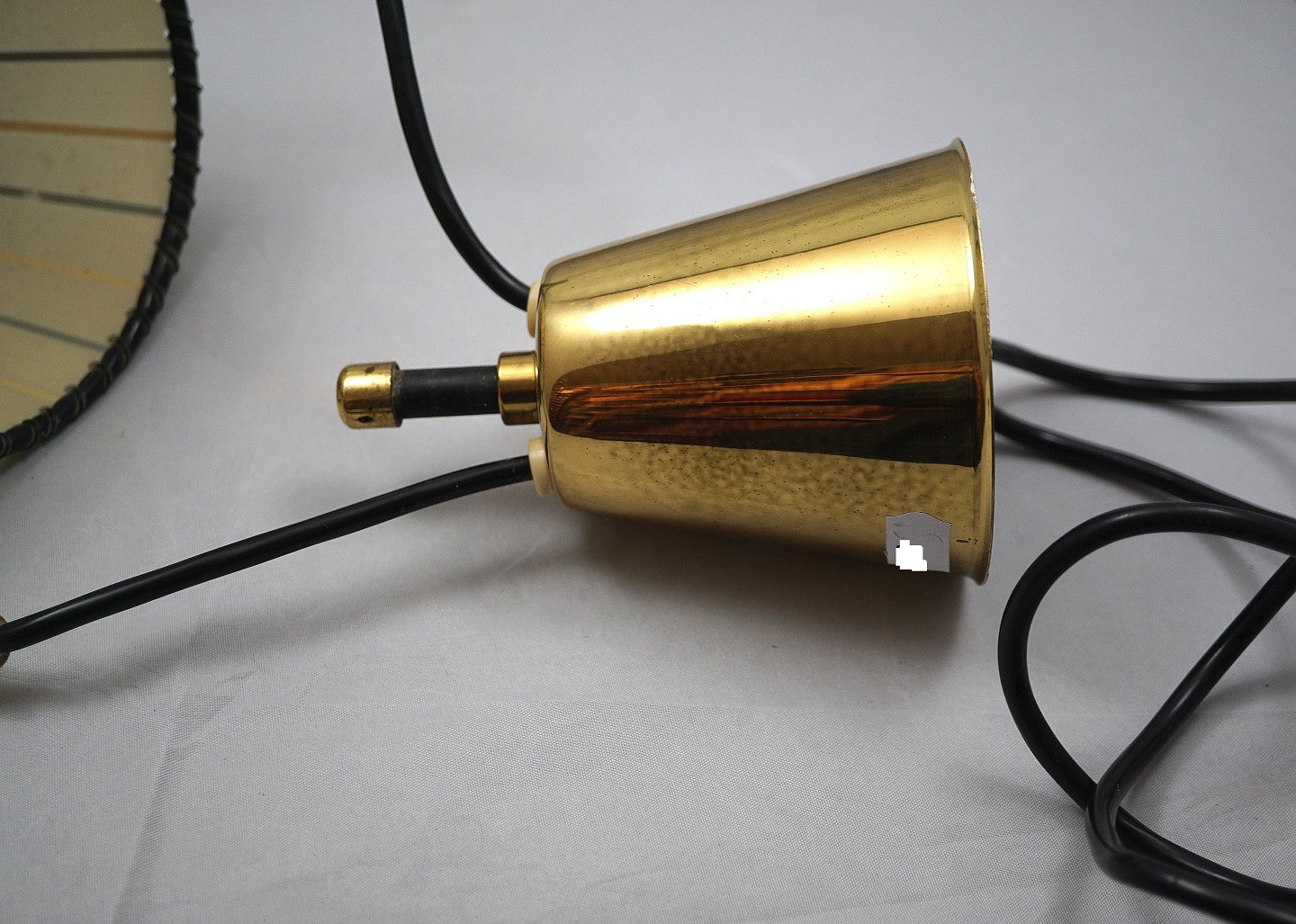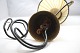 Loftslampe med messing stel og plastskærm med brune og sorte striber. selve lampen er omvendt kegleformet