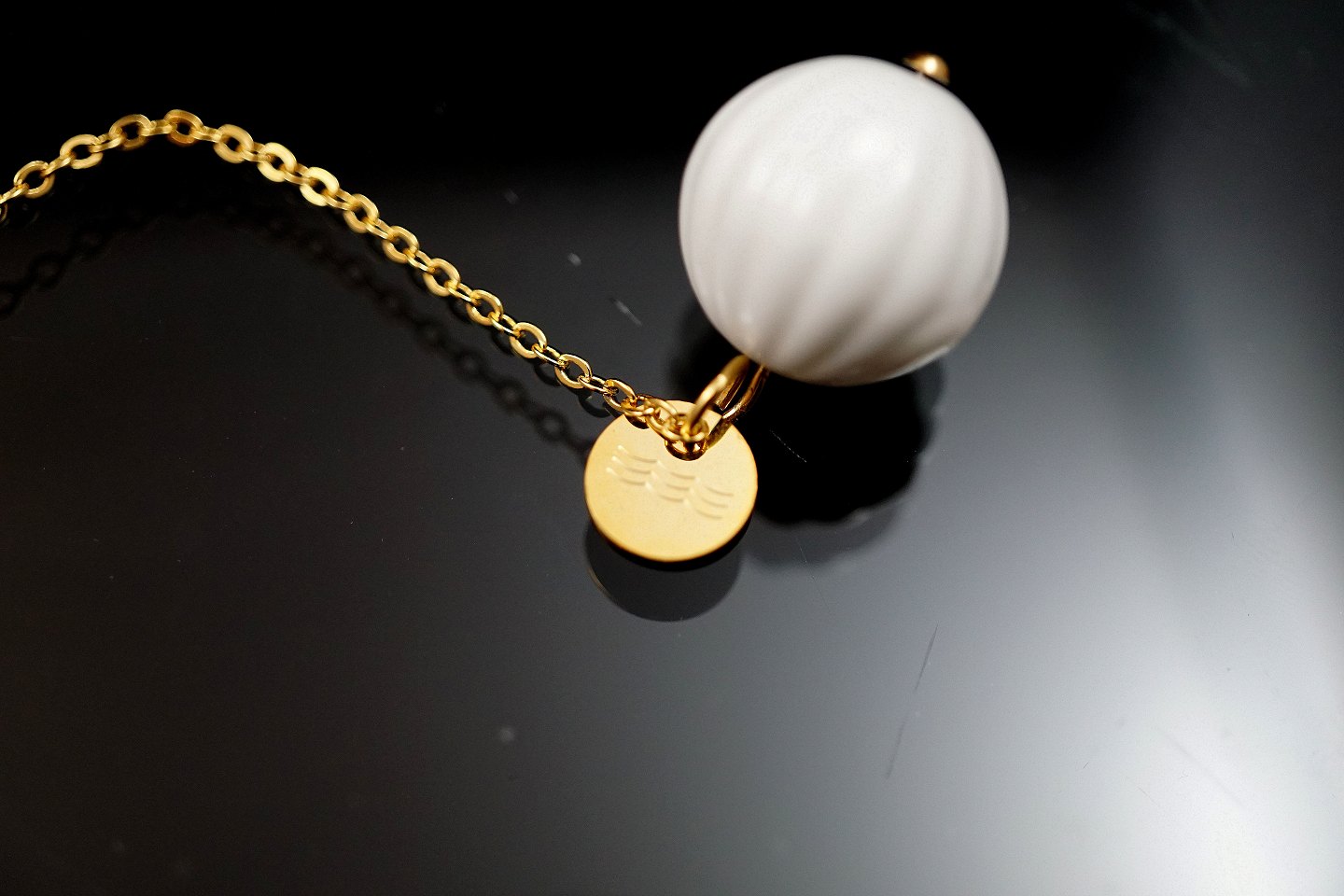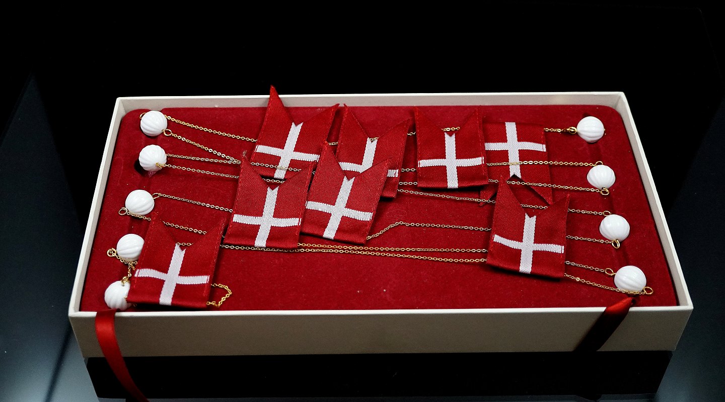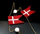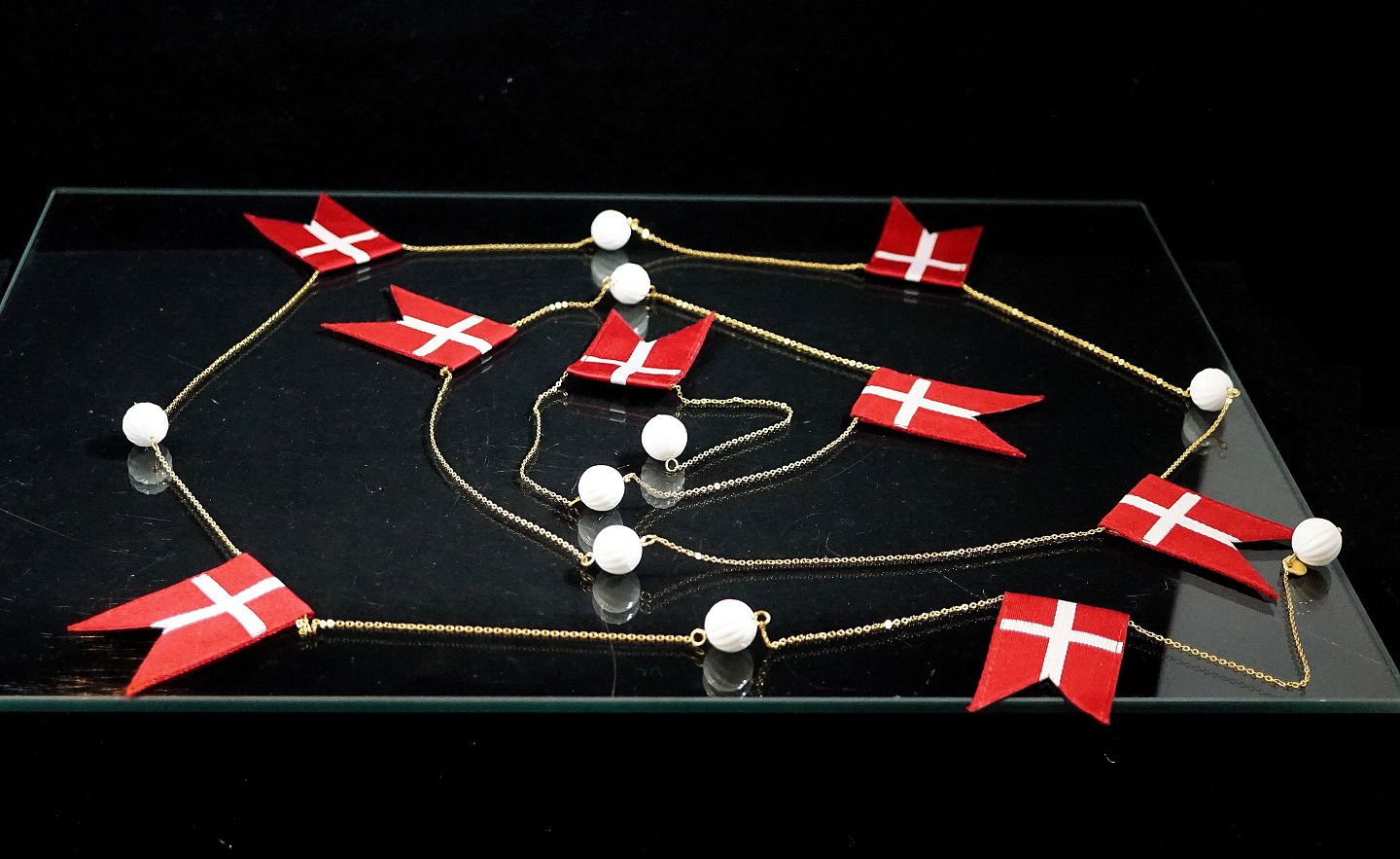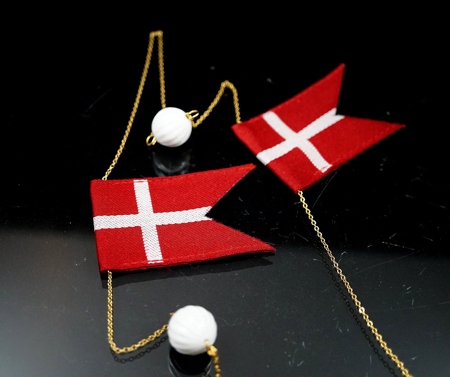 Royal Copenhagen. Flagranke med hvide porcelæns kugler og vævet Dannebrogs flag. Kæden er 24 karat forgyldt. Kæden er i original æske