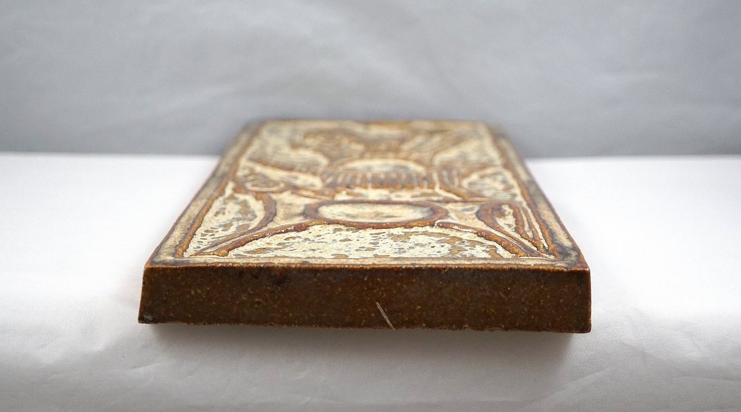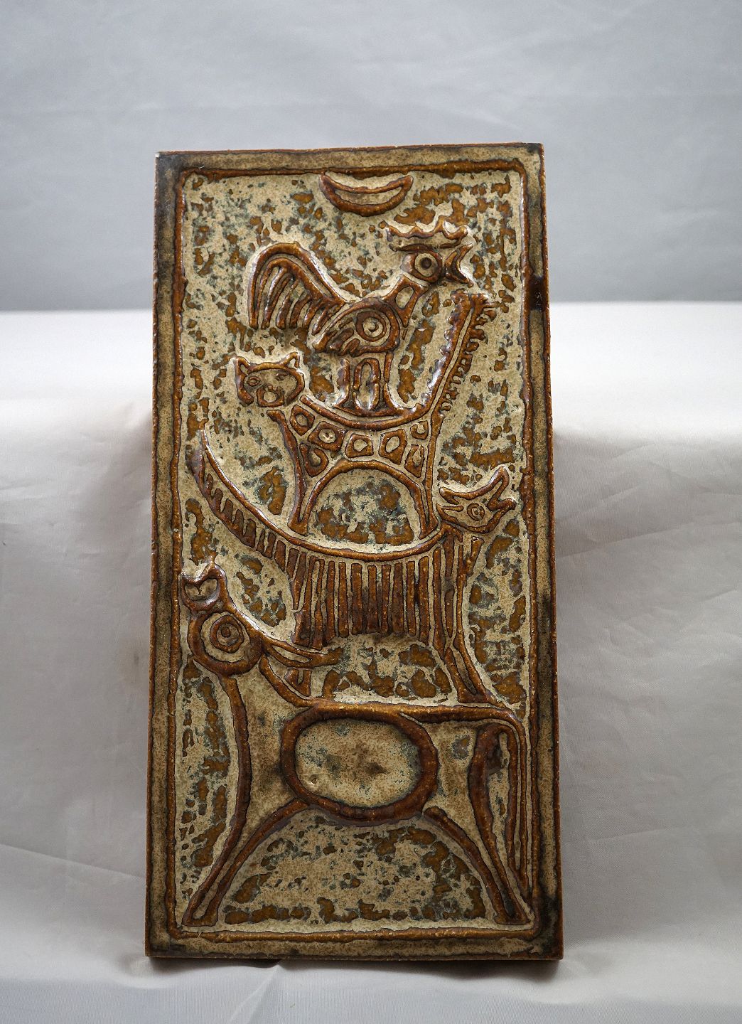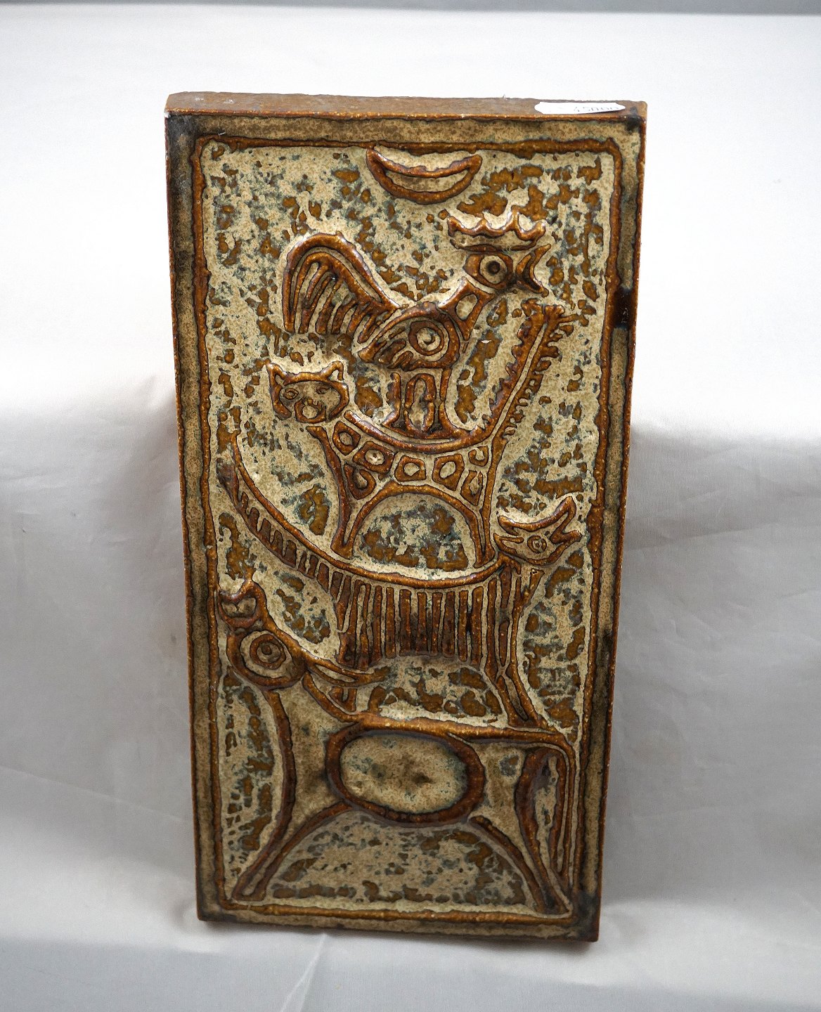 Relief, i brune farver. Relieffet er dekoreret med hane, kat, hund og ko. Dyrene står ovenpå hinanden