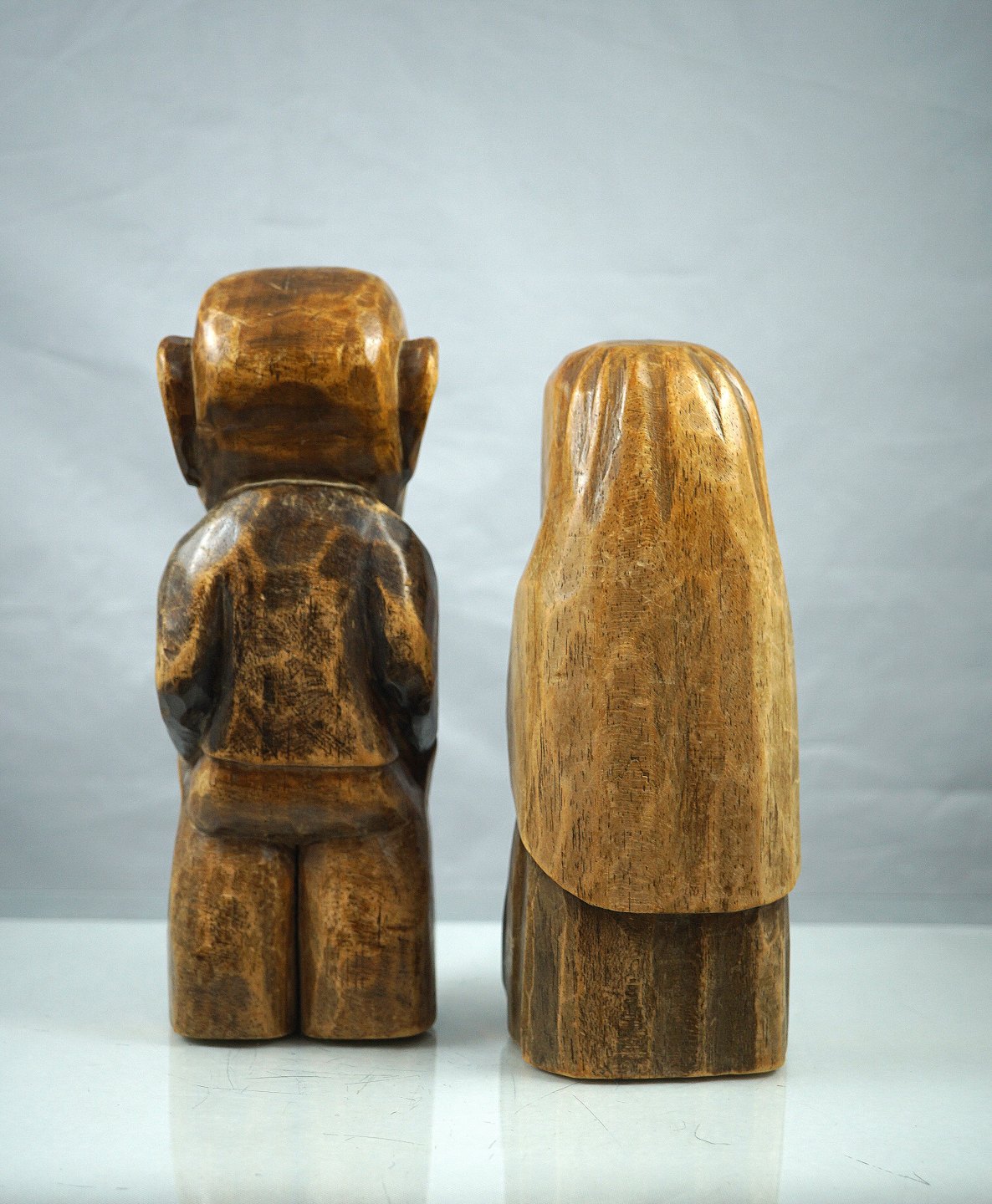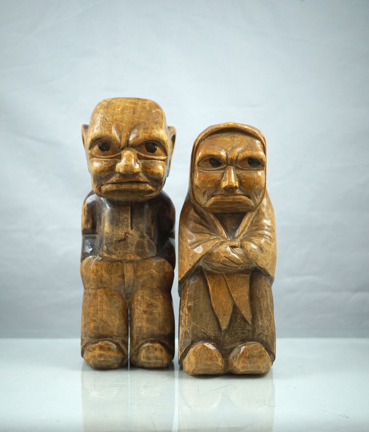 Håndsnittet DAM figurer. Figurerne er en gammel mand og en gammel kone. Manden har bukser og skjorte på, konen har kjole og tørklæde på, figurene er meget detaljeret