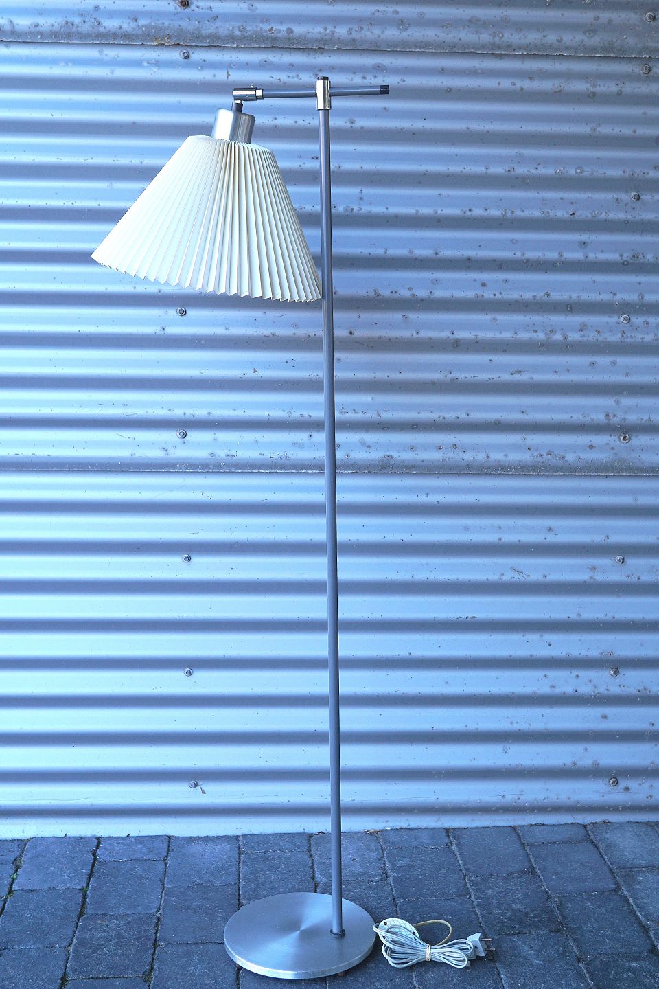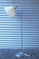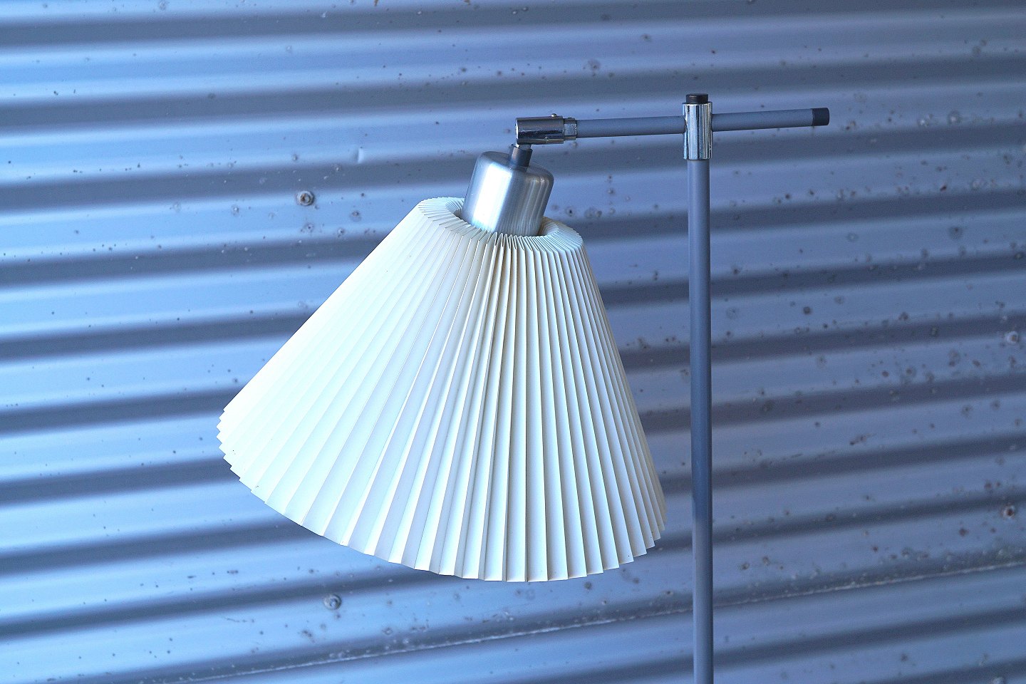 Fog & Mørup standerlampe, gråt og stål stel. Foden er af stål, standerlampen har hvid plisseret Leklint skærm, brugsspor på skærm