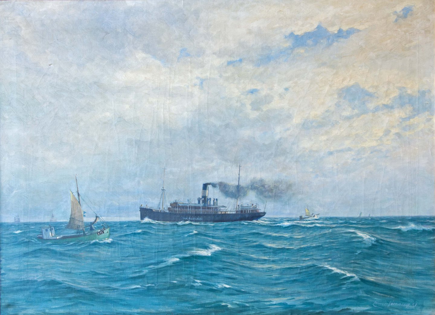 Maleri af skibet Aalborghus, Københavnerbåden. Guldramme.