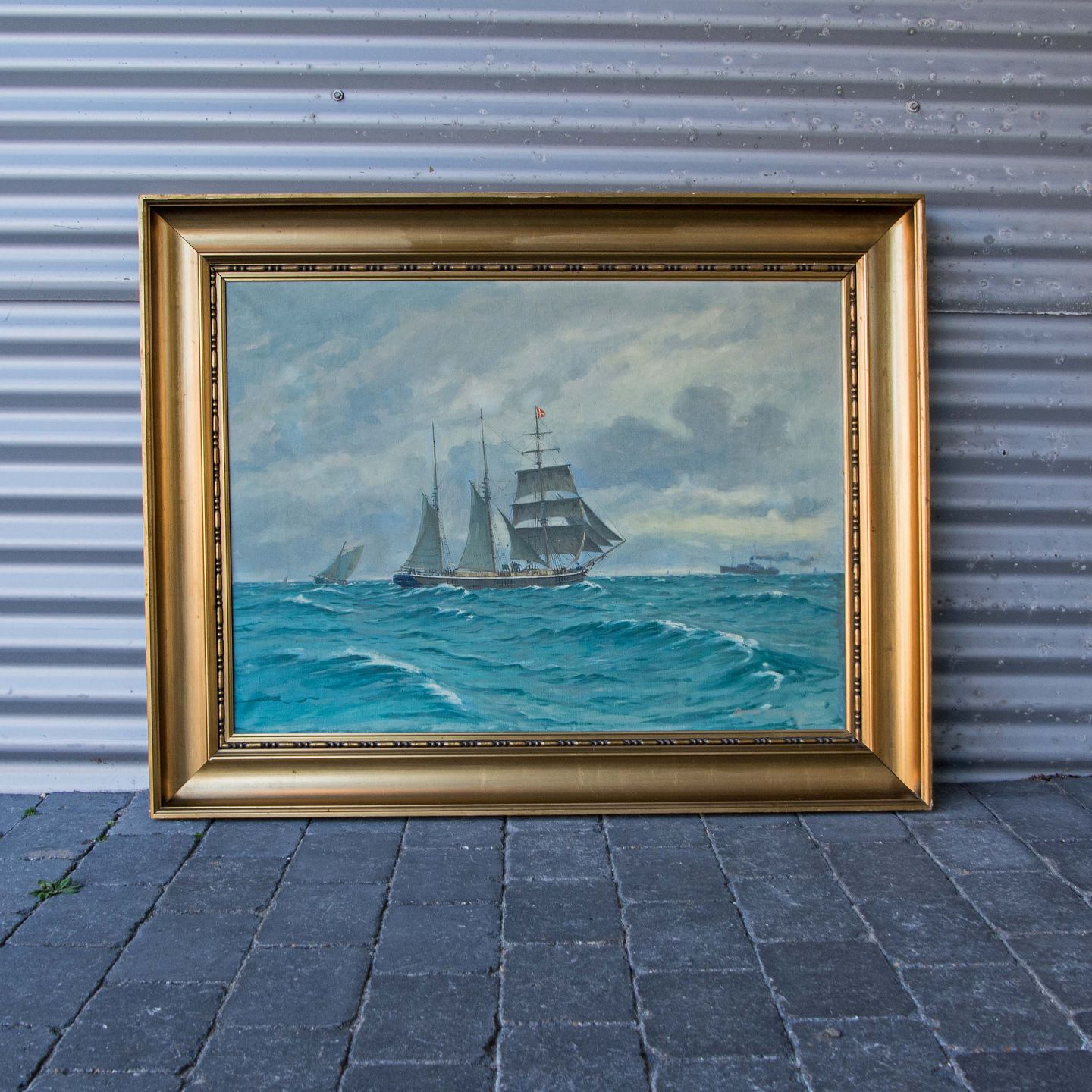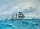 Maleri af 3 master sejlskib på hav, olie på lærred med guldramme