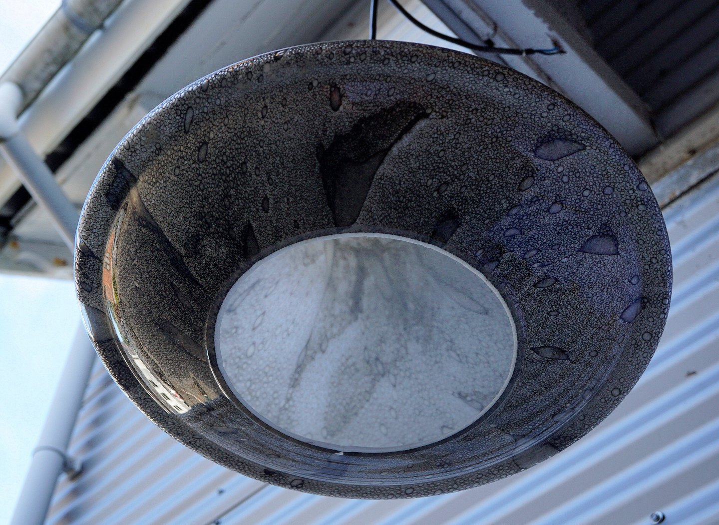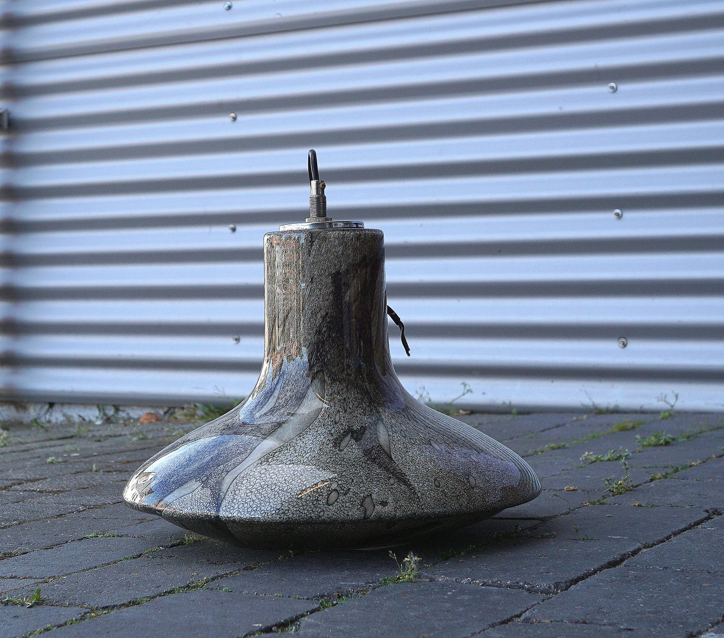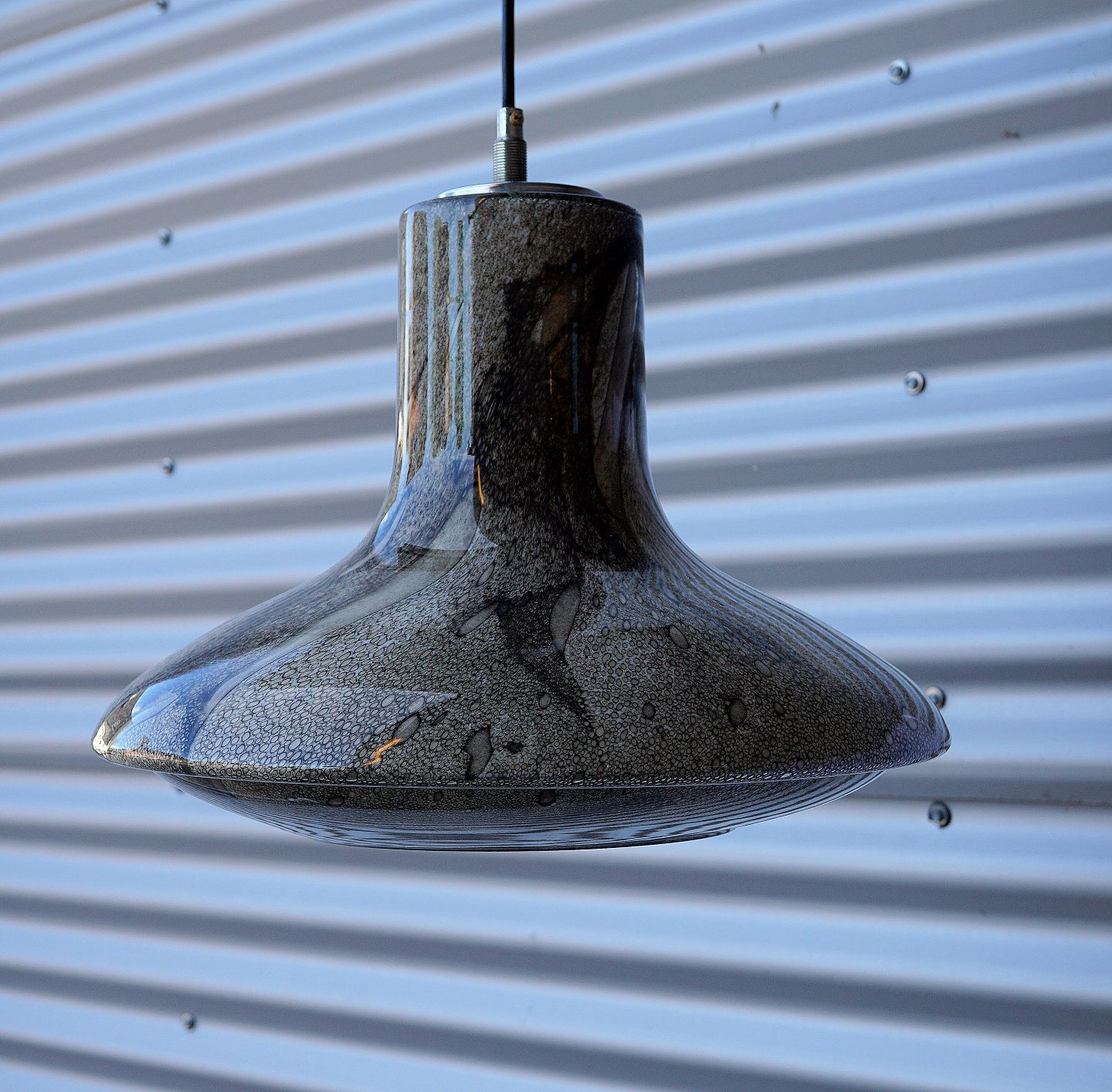 Svensk Orrefors pendel. Dekorationen udvendig, kan være inspireret af et slangeskind. Pendlen er af glas og hvid indvendig