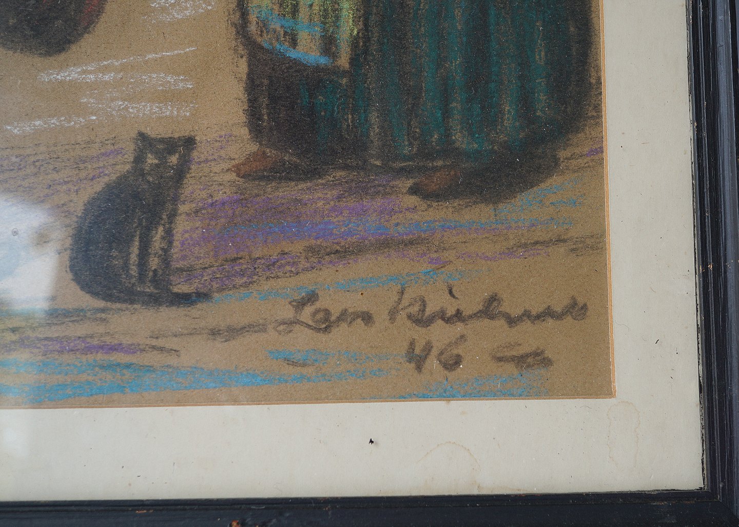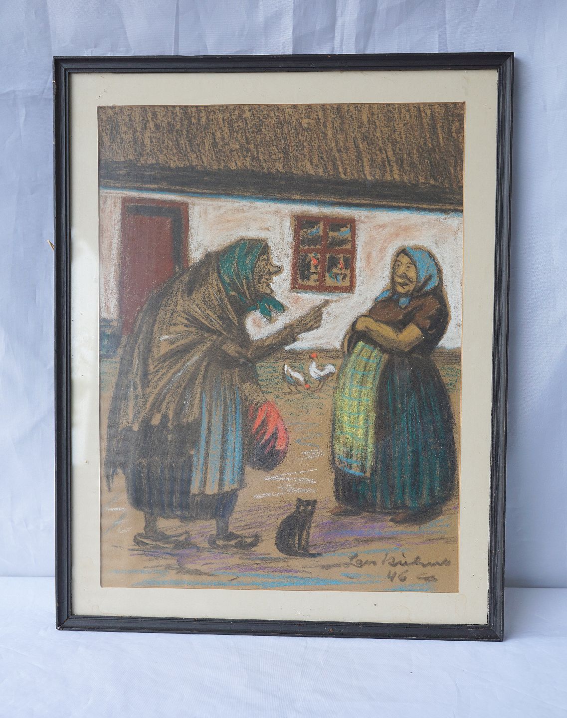 2 kvinder, der står i samtale. Oliekridt tegning af Lars Nielsen 1946