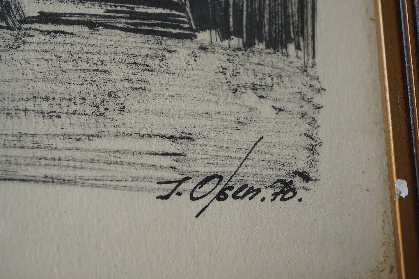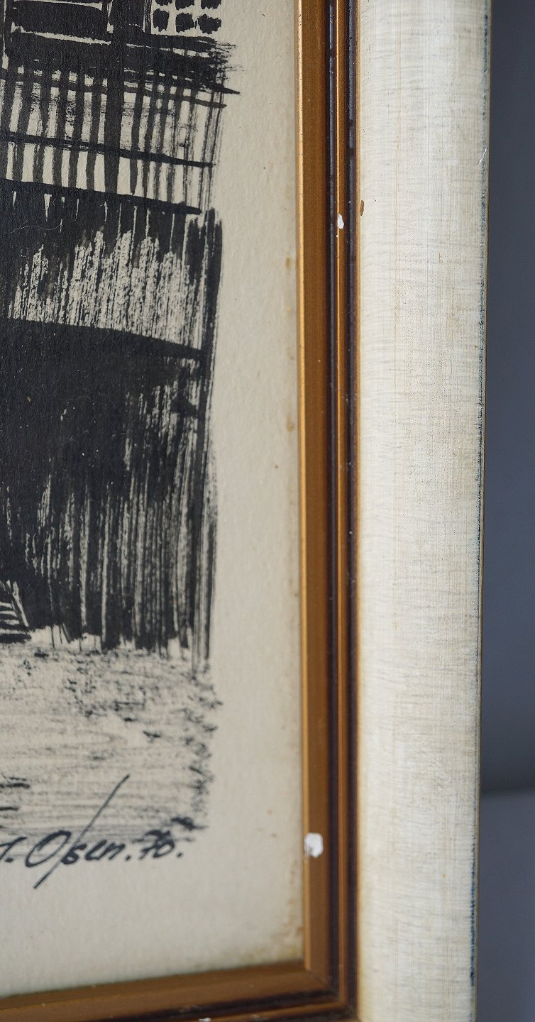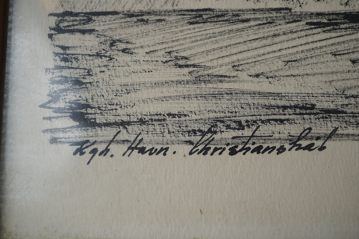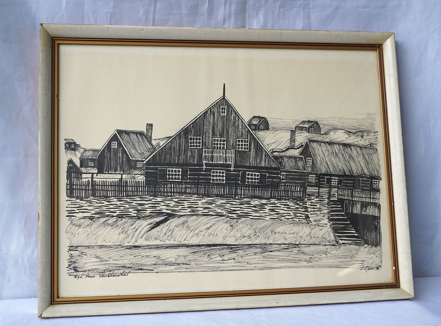 Indrammet tryk i hvidmalet træramme med motiv af huse i klitområde på grønland med teksten Kongelig Havn, Christianshåb