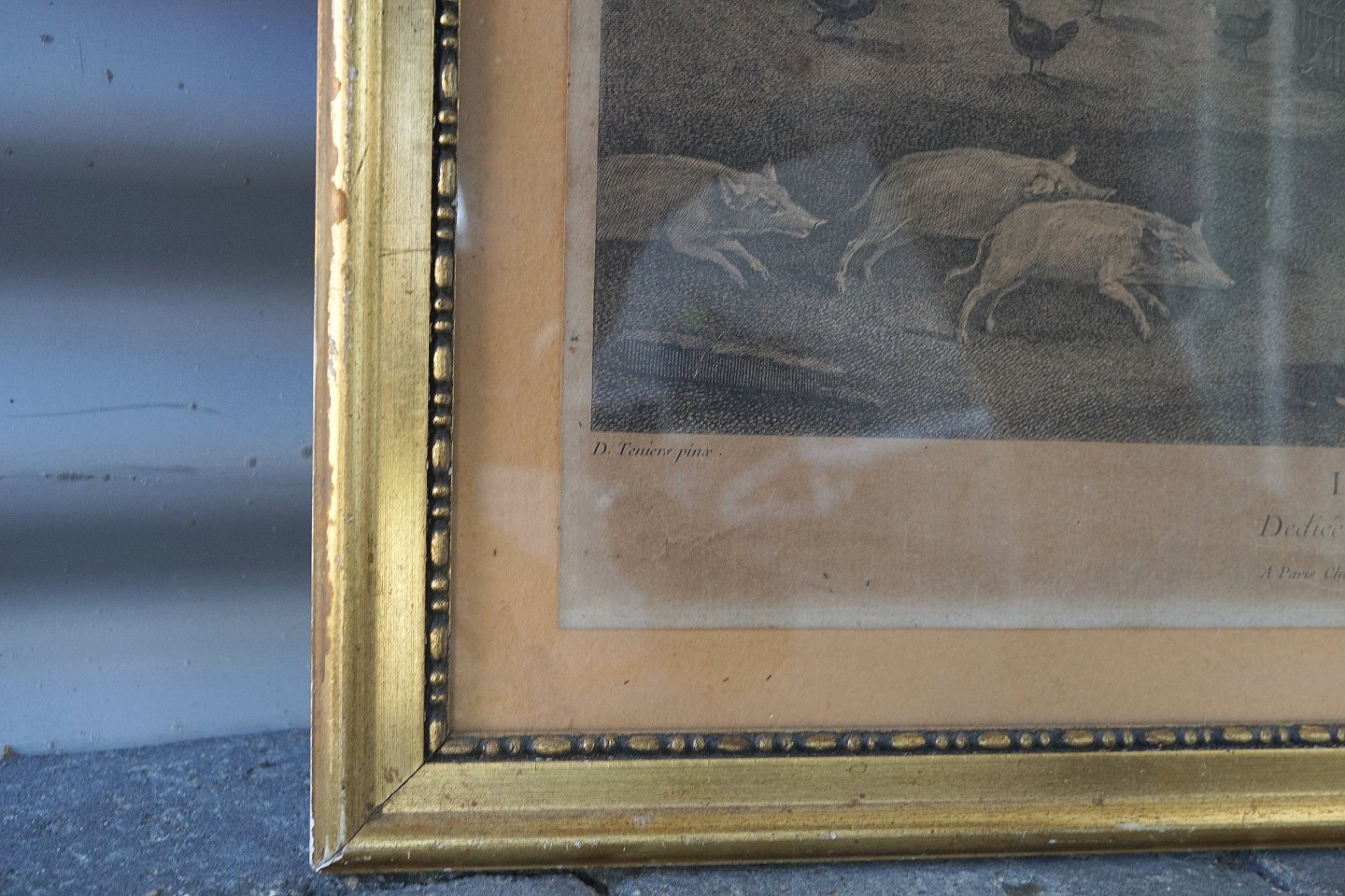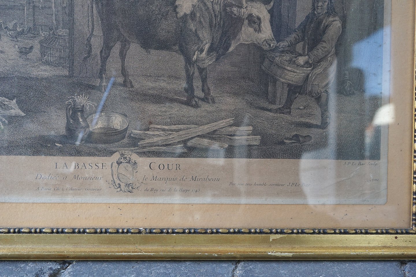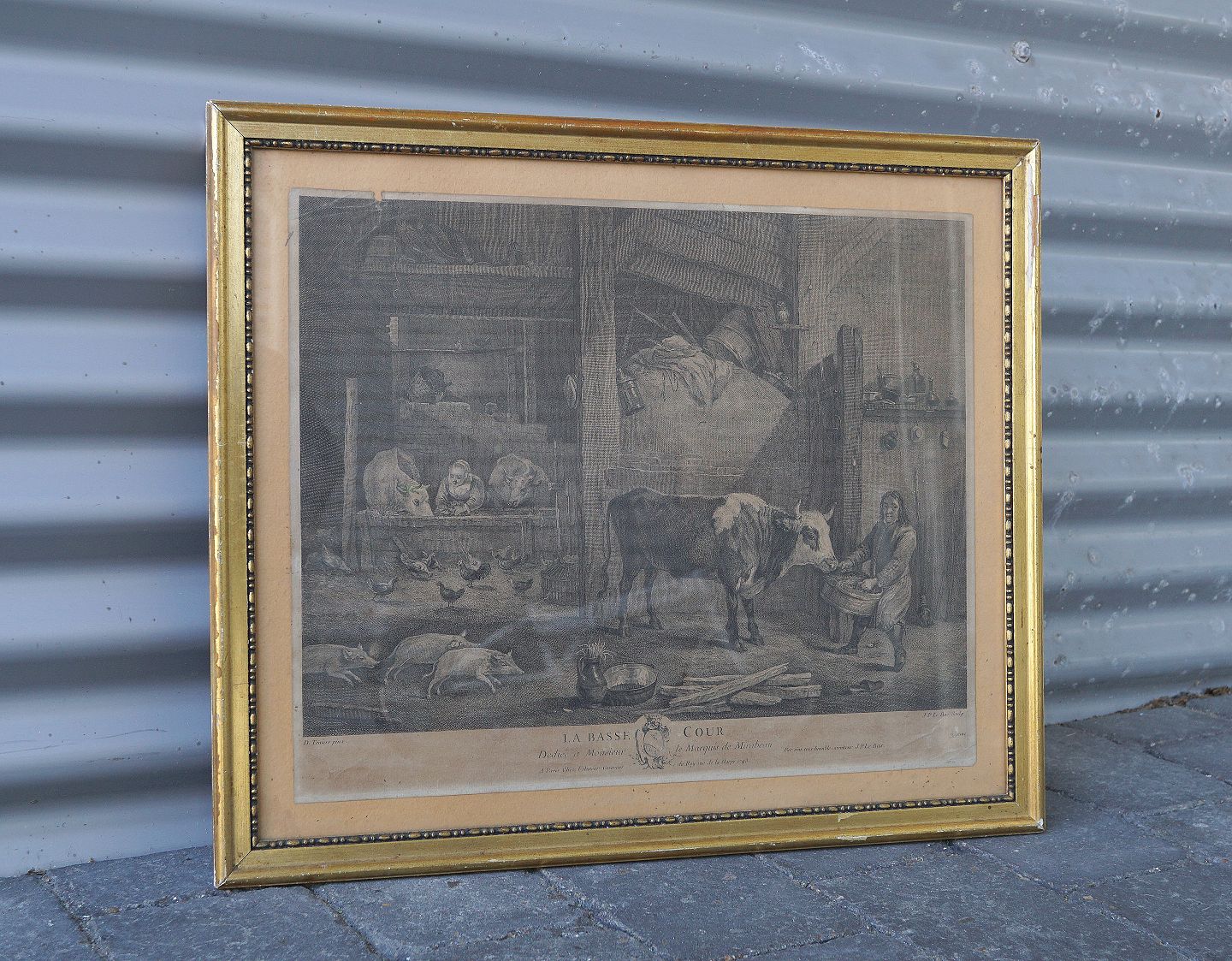 Bogtryk med motiv af to mennesker der fodrer køer i en stald.