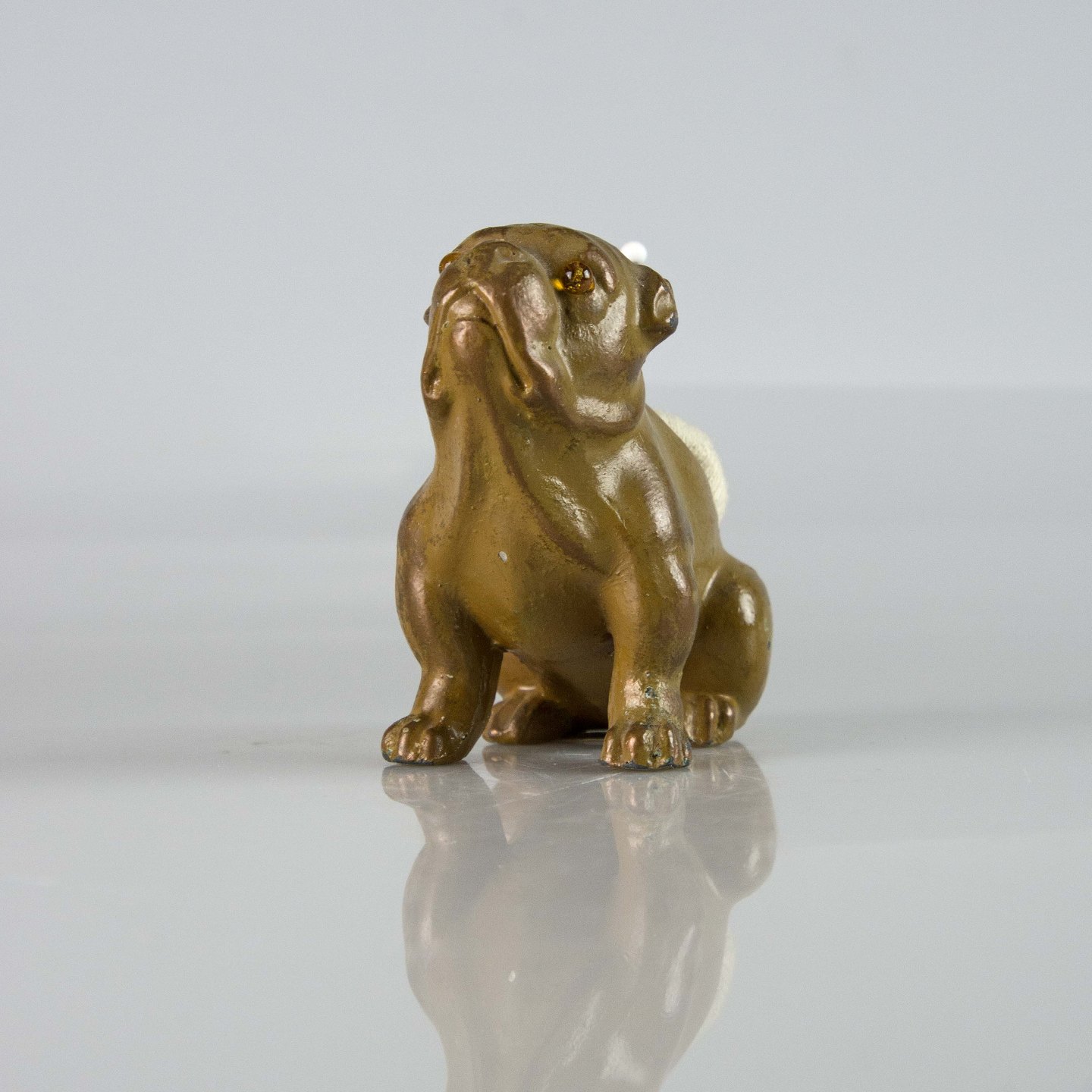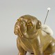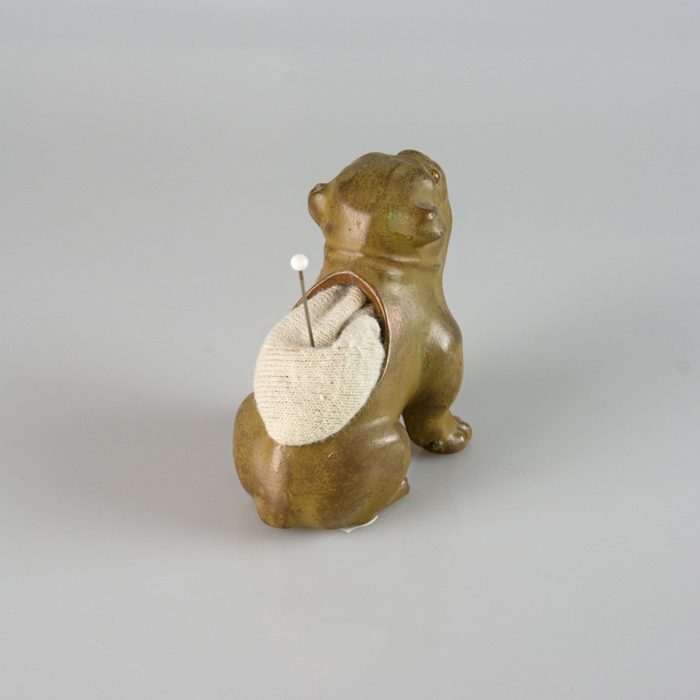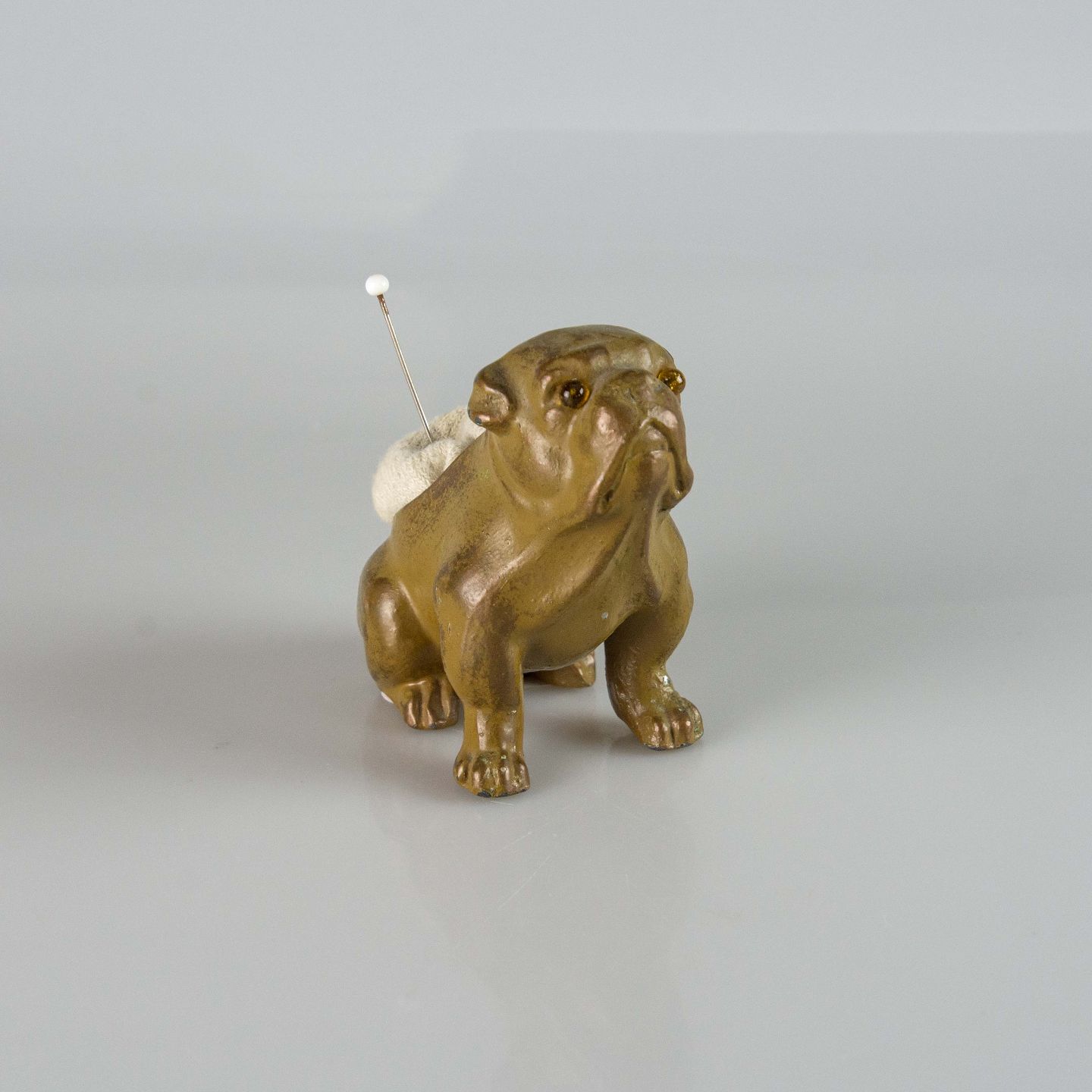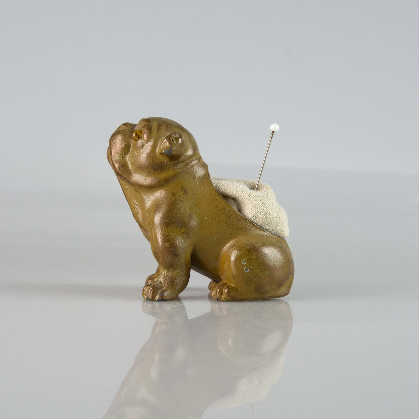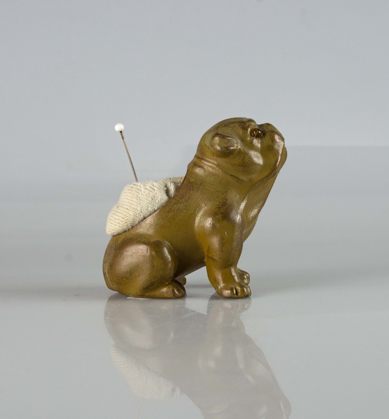 Gammel nålepude i malet metal med motiv af en siddende engelsk bulldog