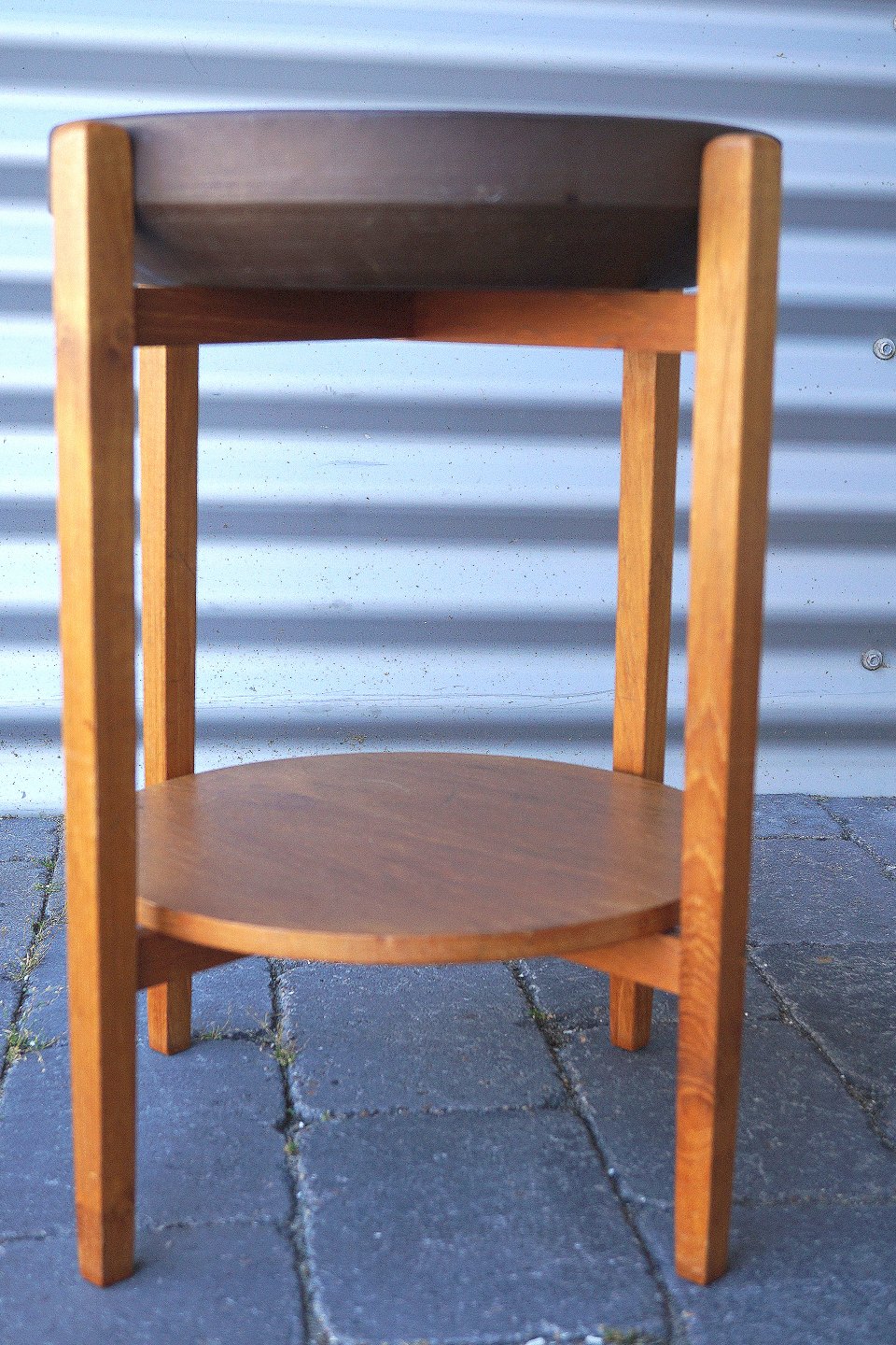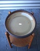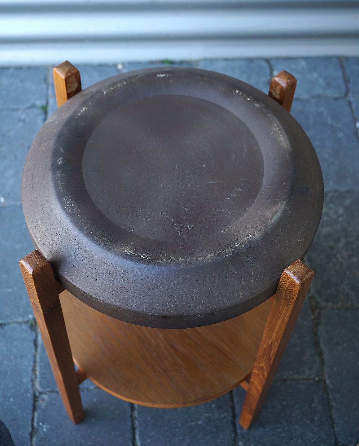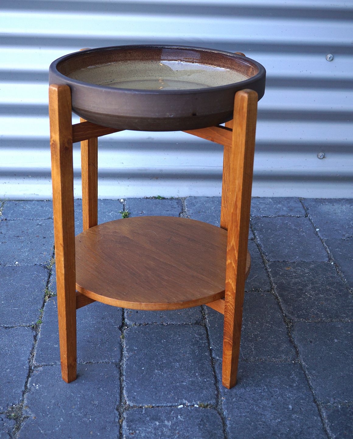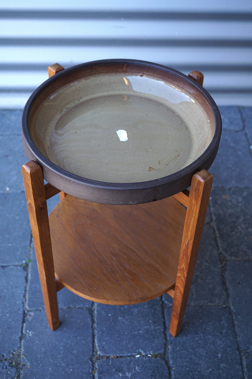 Knapstrup keramikfad på teak/ege stativ. Fadet er glaseret lysebrunt indvendig og mørkebrunt udvendig