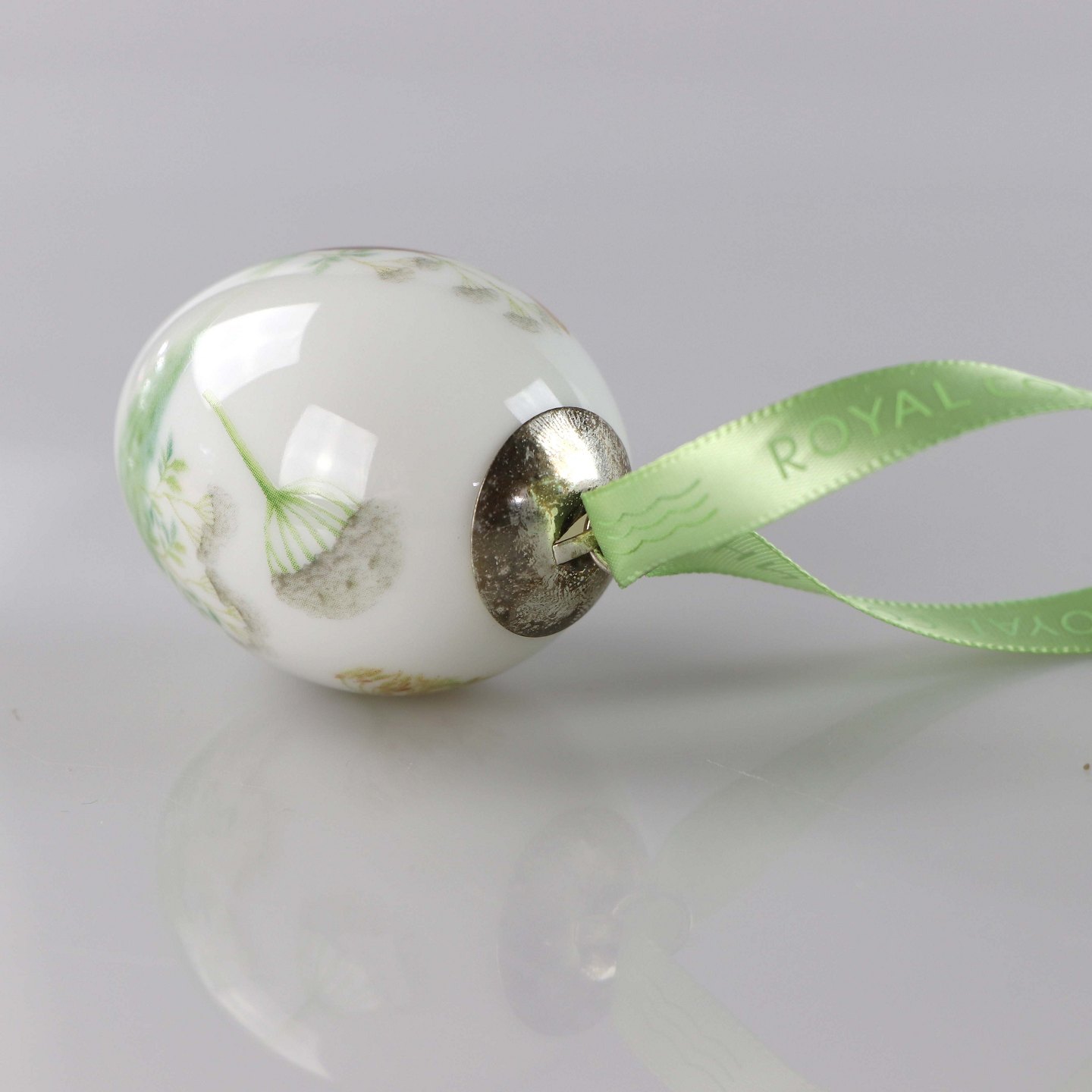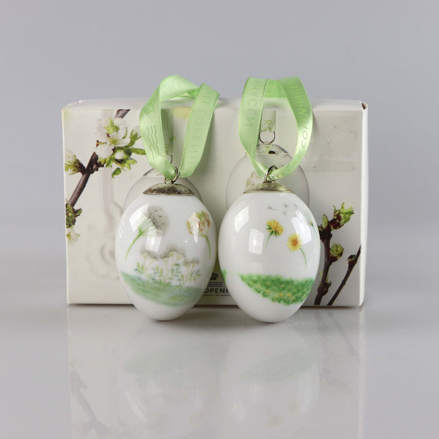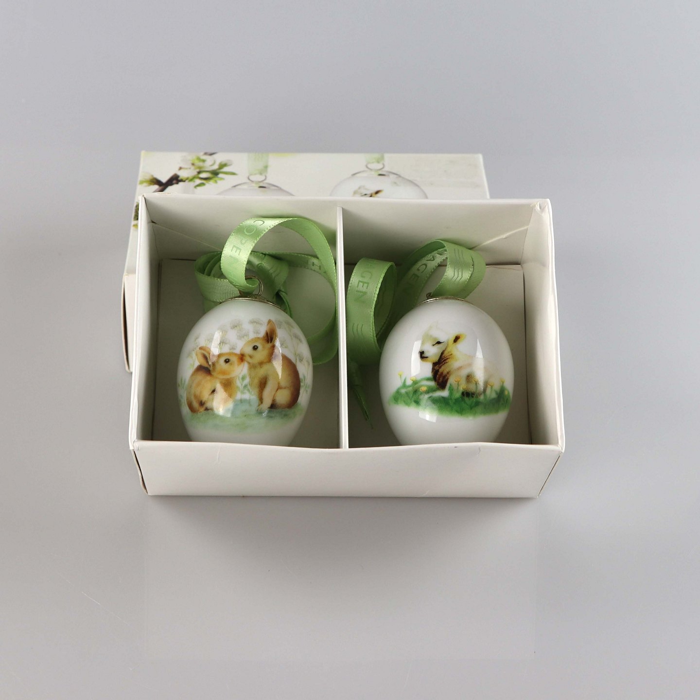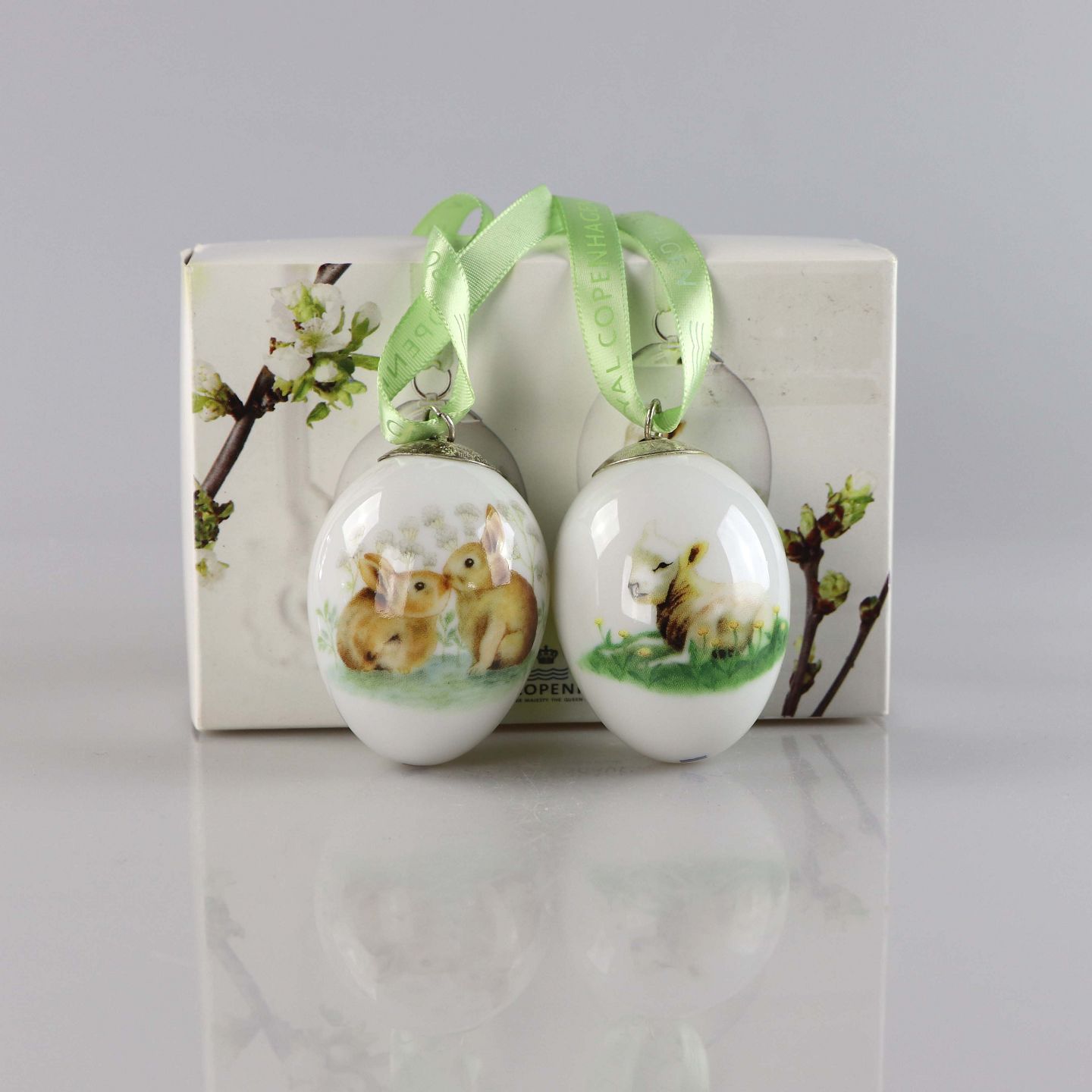 Påskeæg i porcelæn med motiv af et lam og et par hareunger