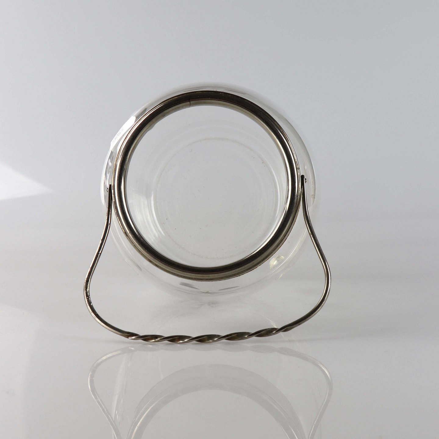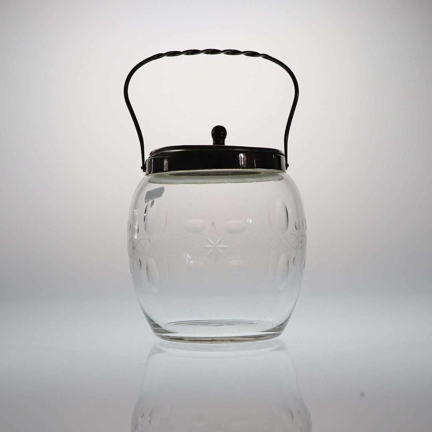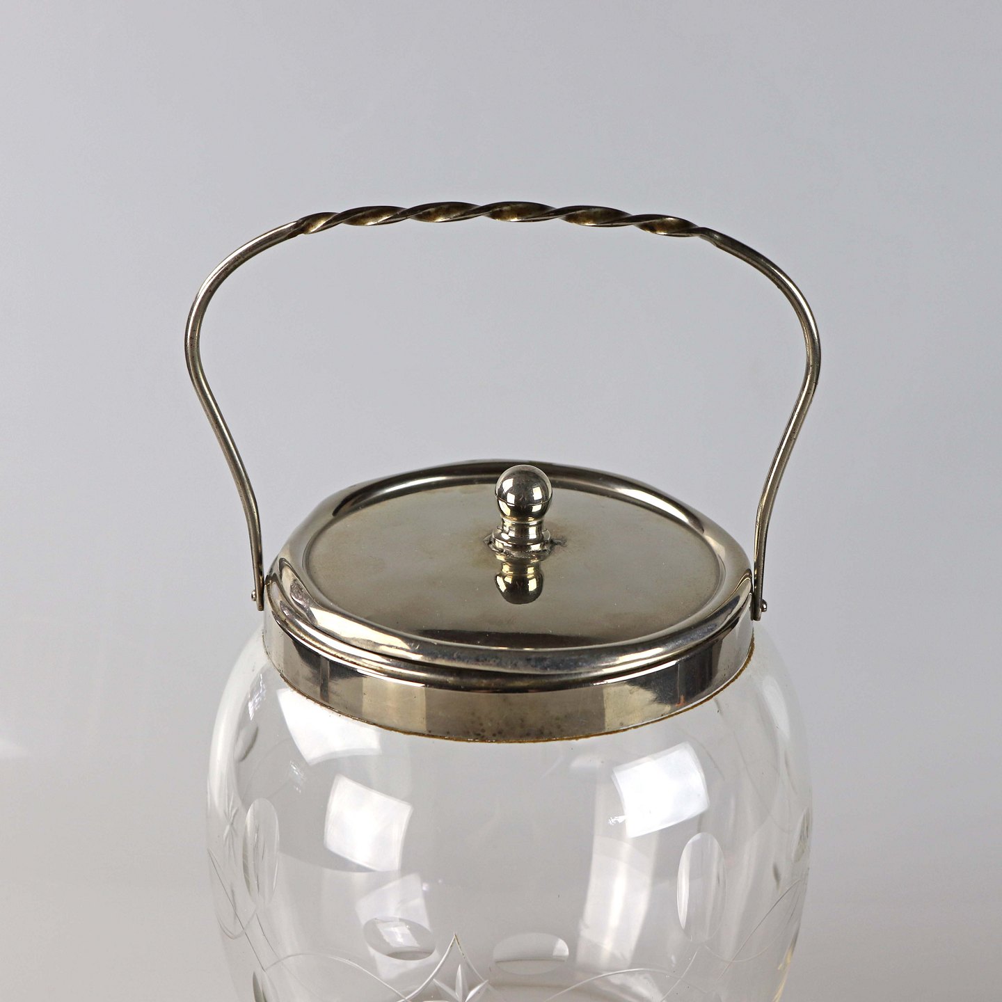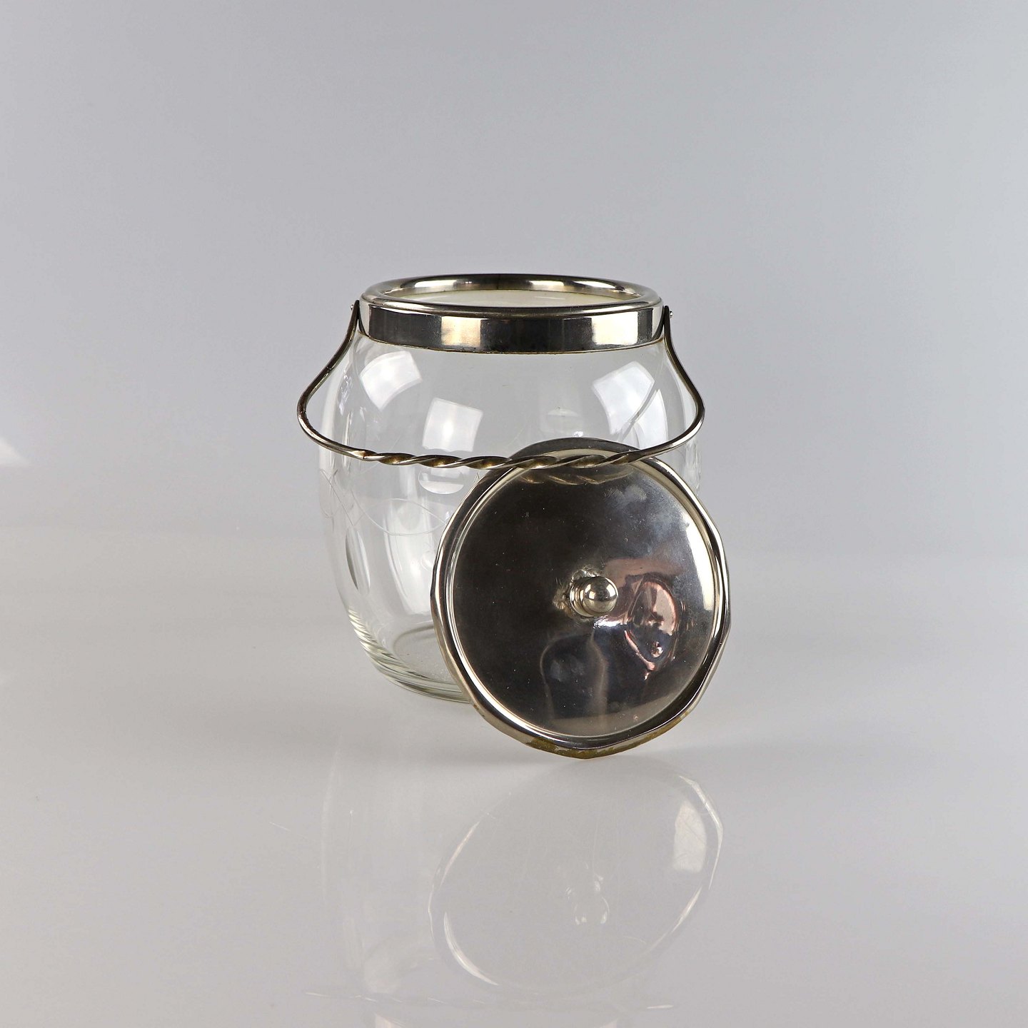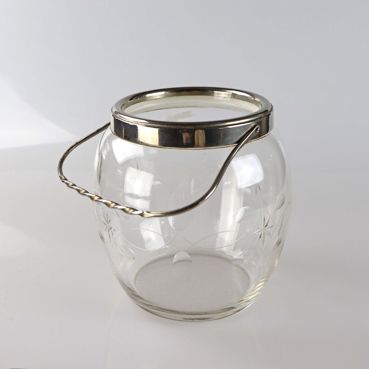 Kiksebøtte i klart glas med låg og hank i nikkel, med olivenslibninger og motiv af stjerner.
