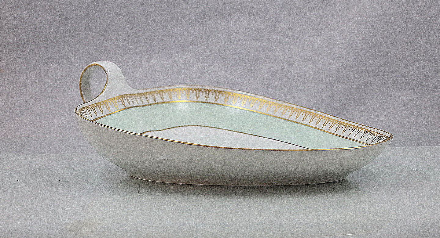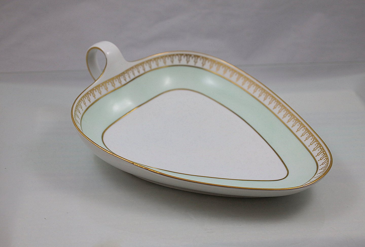 Thorvaldsen er hvidt porcelæn dekoreret med bred sart grøn bort og omkranset af guldstafferinger