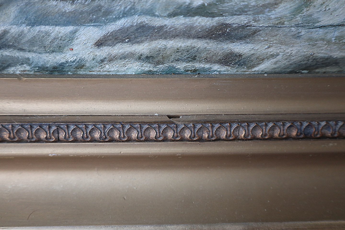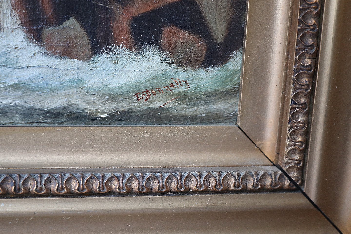 Kunstmaler Donnelly. Maleriet giver syn ud over en klippe hvor havvandet slår op ad. Maleriet er indrammet i en bred og dyb guldramme med enkelte brugsspor. Signeret Donnelly