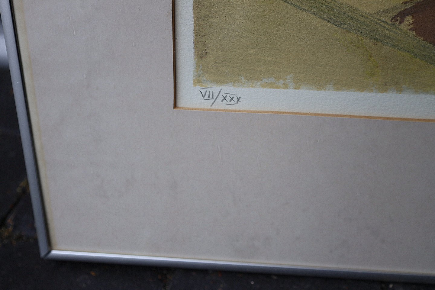 Svend Engelund, litografi nr. VII/XXX. Åbent landskab i lyse gule farver og grå/blå himmel.