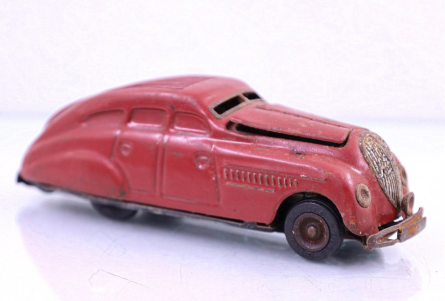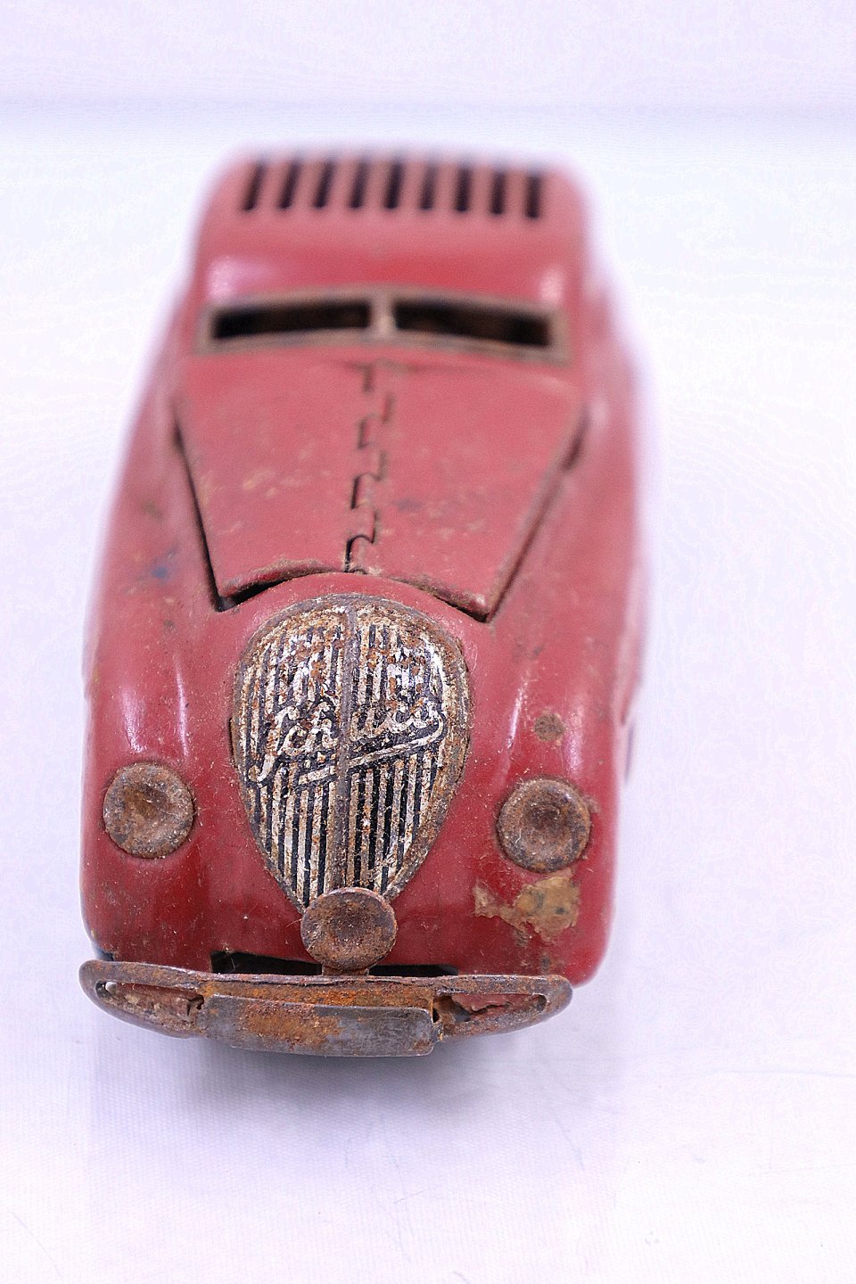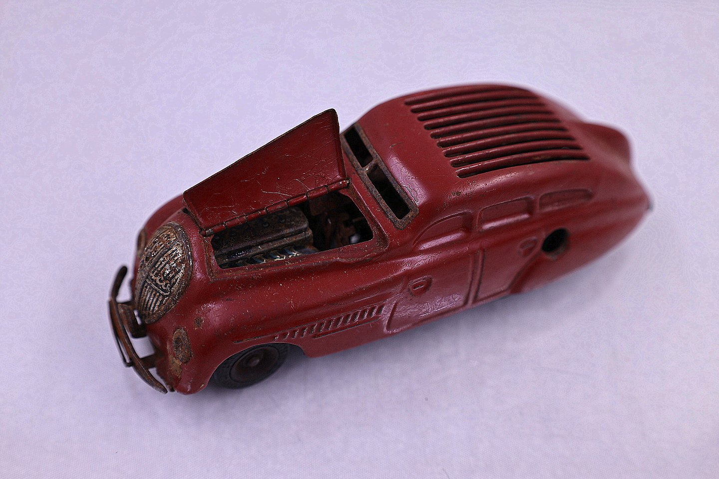 Schuco - Sportsvogn. Schuco Patent, "Magico Auto 2008", Tyskland 1940-1949. Der kan åbnes, i begge sider, til motoren. Sportsvognen er lavet af blik. Bilen er mørk rød, og bærer præg af slitage.
