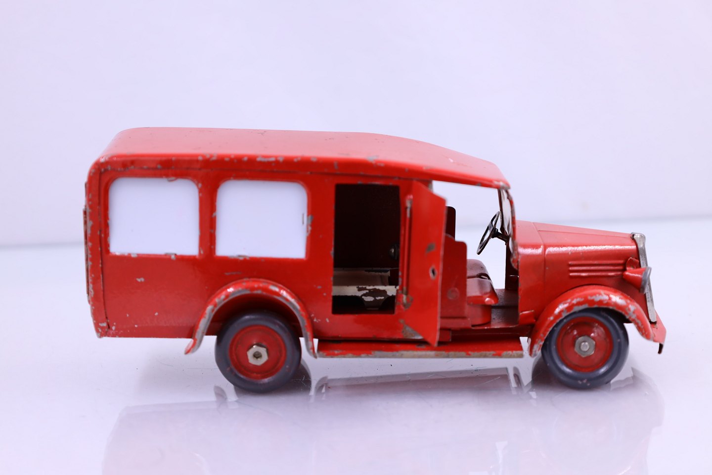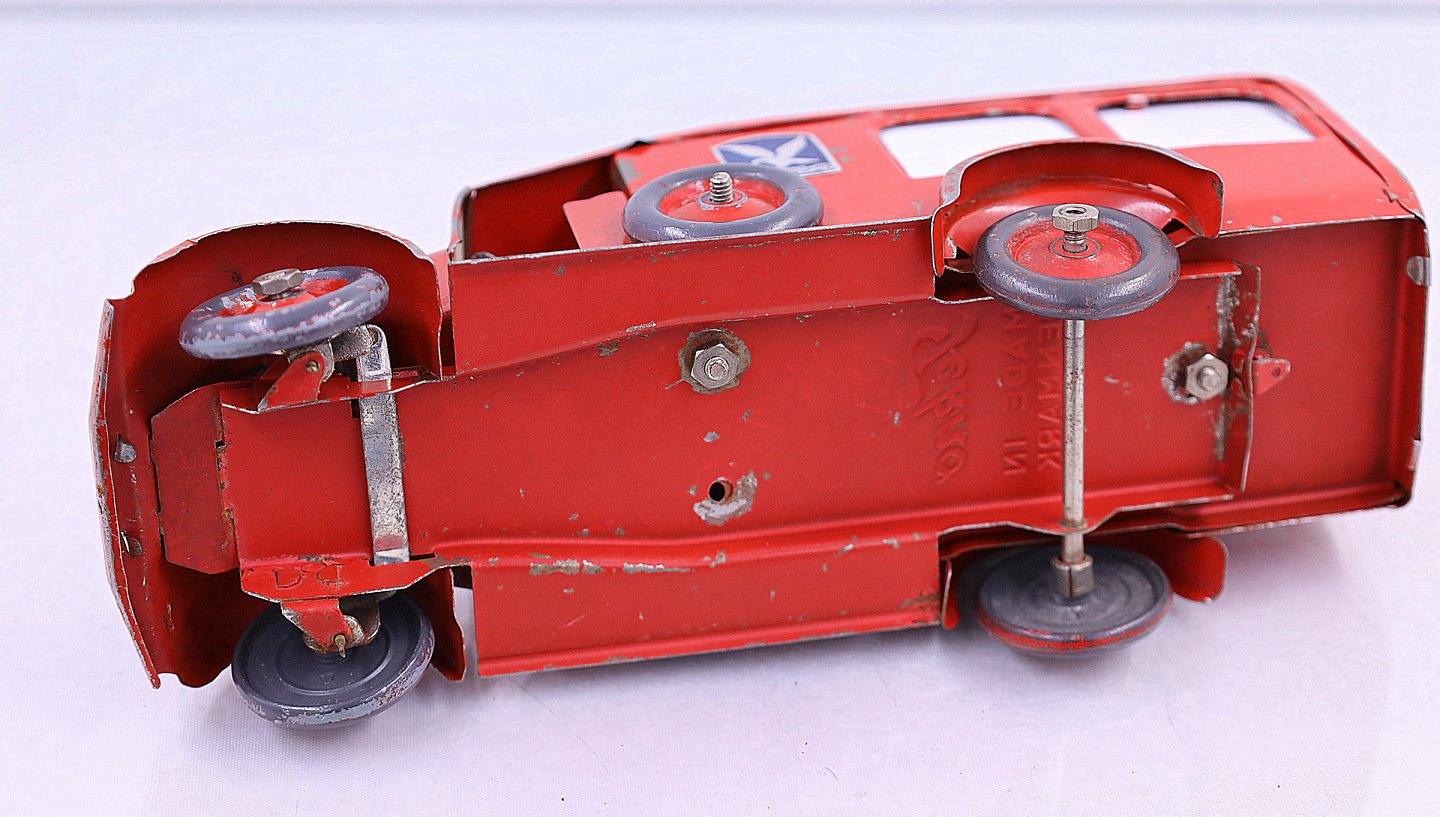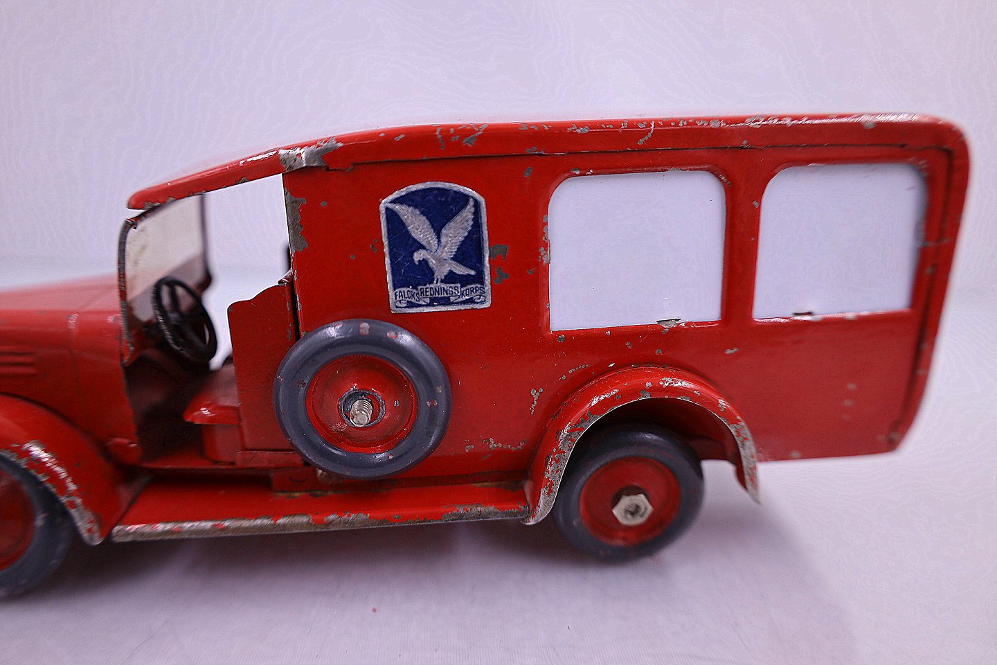 Falks Redningskorps. Ambulance fra Tekno, lavet af blik. Ambulancen har en båre og bagruderne er matteret. Der er en sidedør og bagdøren der kan åbnes. Der er brugsspor på ambulancen