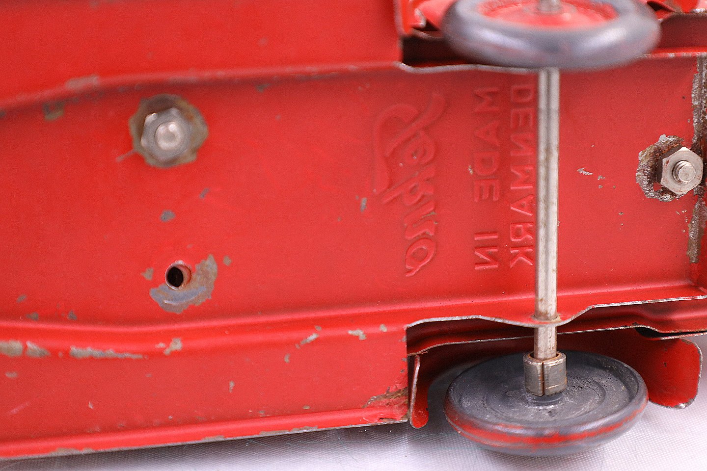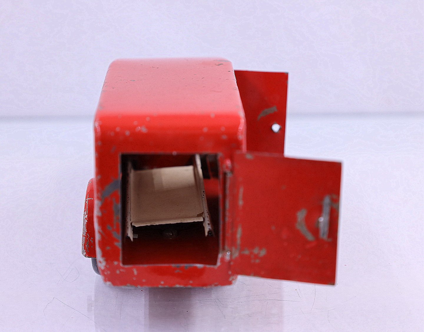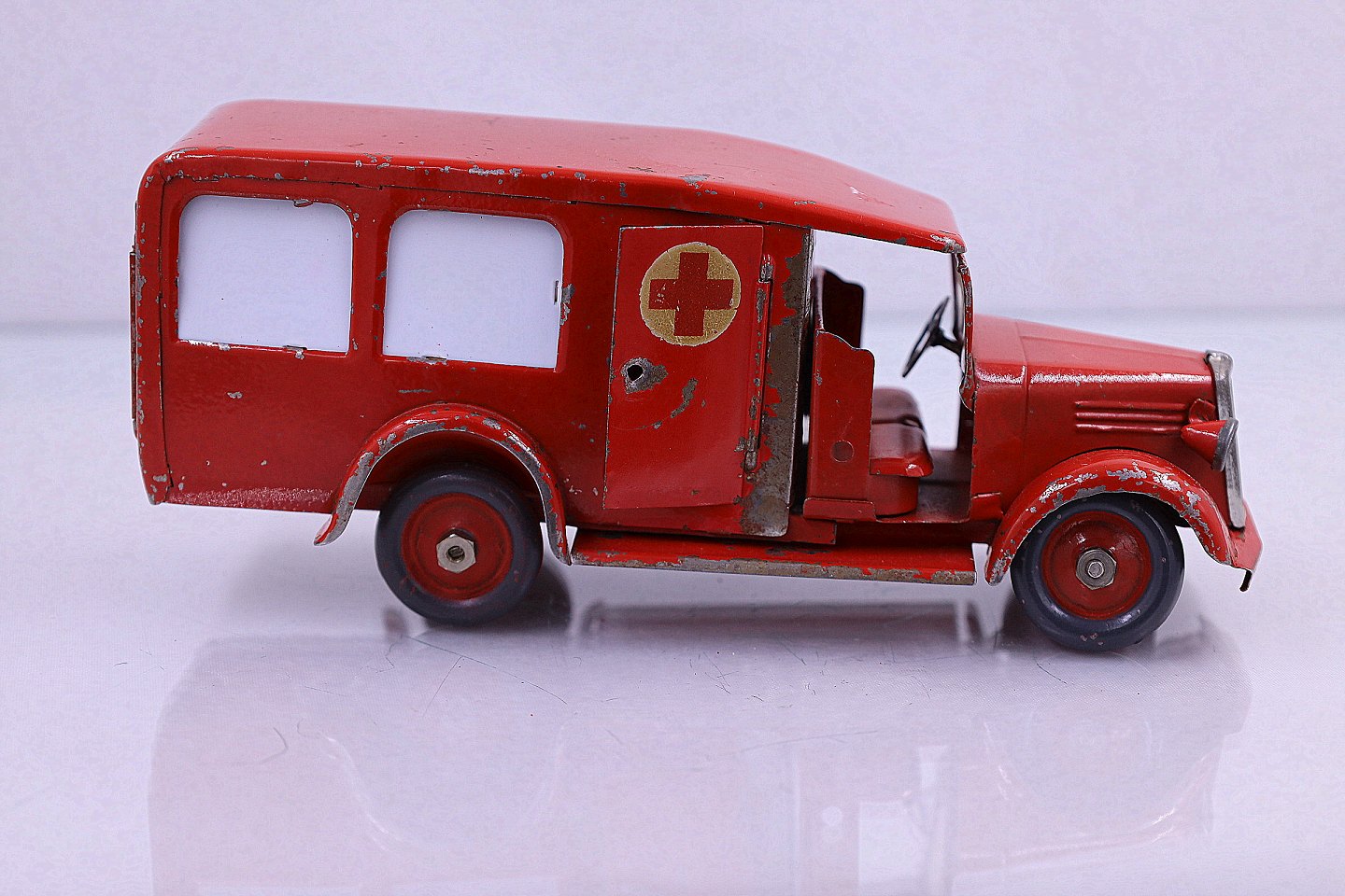 Falks Redningskorps. Ambulance fra Tekno, lavet af blik. Ambulancen har en båre og bagruderne er matteret. Der er en sidedør og bagdøren der kan åbnes. Der er brugsspor på ambulancen