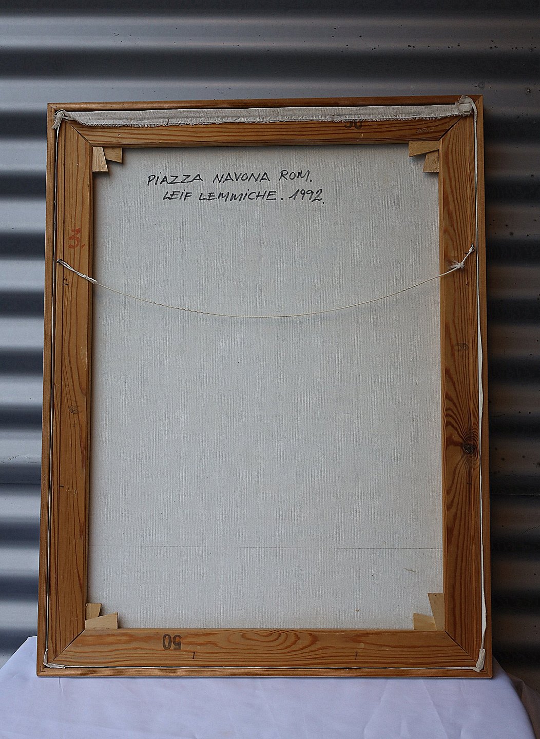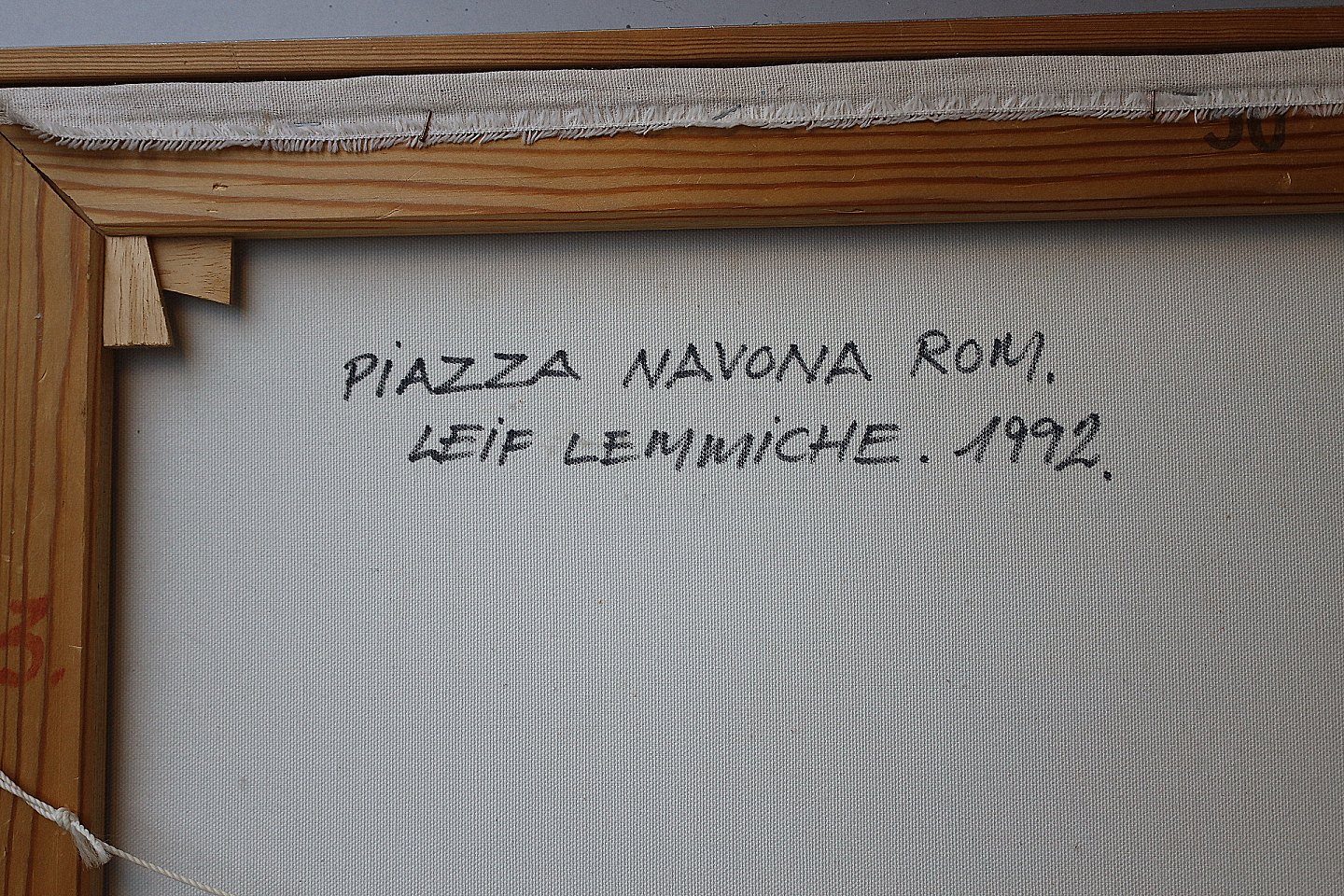 Maleri, Leif Lemmiche (1935-2019), Piazza Navone, Rom. Maleriet er malet med stærke klare farver. Maleriet er signeret "LL92". Maleriet er i sølvfarvet ramme